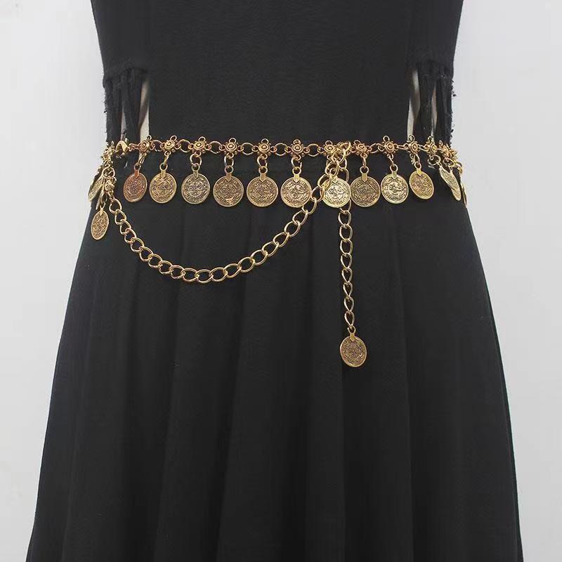 Cadena de cintura con monedas de metal de estilo étnico retro europeo y americano, cinturón de falda de moda para danza del vientre, decoración de joyas con monedas antiguas