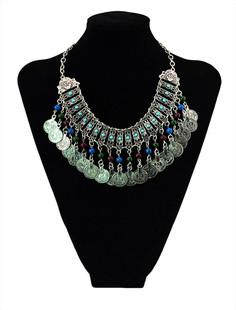Collar popular retro tallado de aleación con borla de moneda de pedrería, collar de cadena colorida para clavícula, mismo collar |