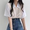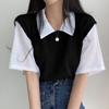 Estilo Universitario 2025 Verano Camiseta de Manga Corta de Dos Piezas Falsas con Cuello Polo de Color en Contraste para Mujer, Top Holgado, Casual y Versátil