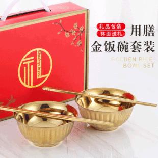 Juego de cubiertos portátiles de acero inoxidable y dorados, juego de cuencos para arroz, palillos y cubiertos, juego de regalo promocional.