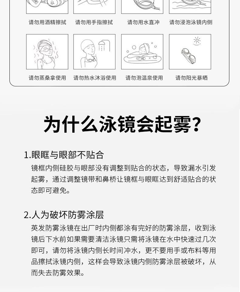 【Características del producto】Diseño de lente 3D, sin presión en los ojos, más cómodo de llevar. Anillo de lente de silicona con memoria, suave, cómodo e impermeable. Recubrimiento antivaho dentro de la lente, sin empañamiento bajo el agua, visión más clara. Fortalecer la lente, resiste eficazmente los rayos UV y protege los ojos.