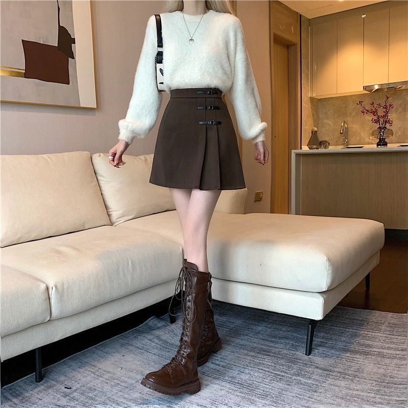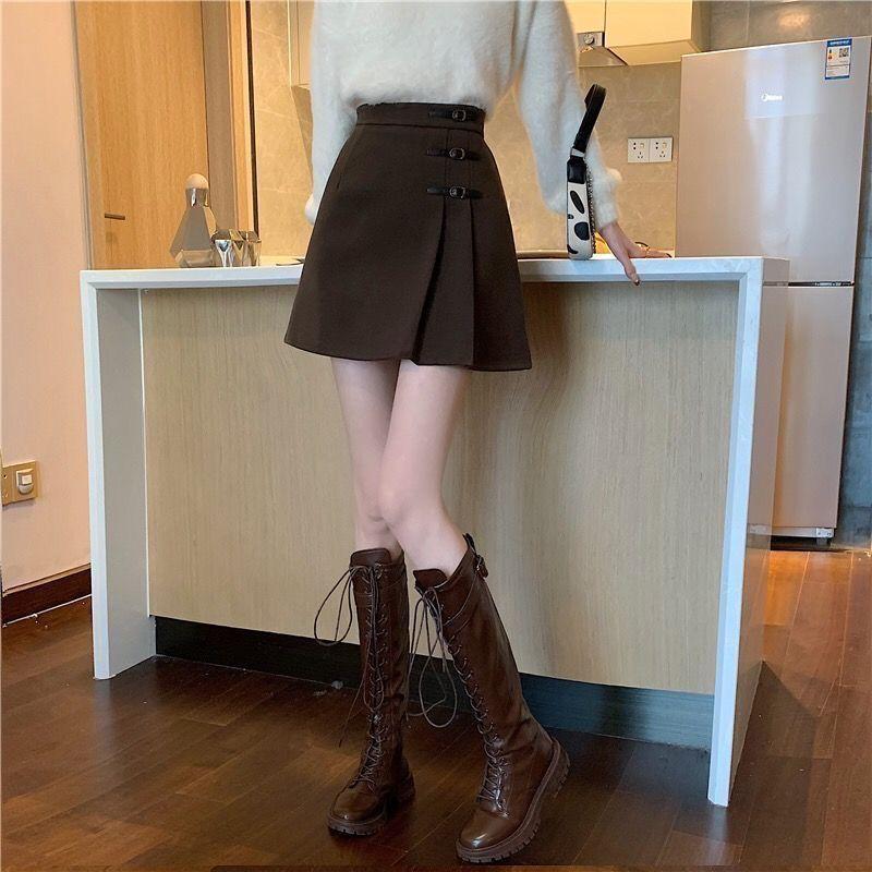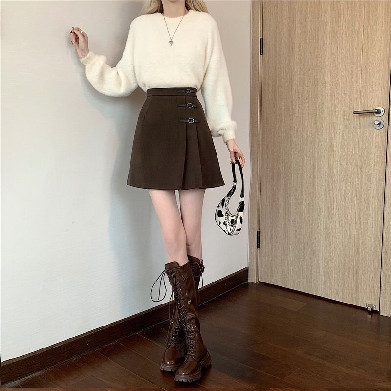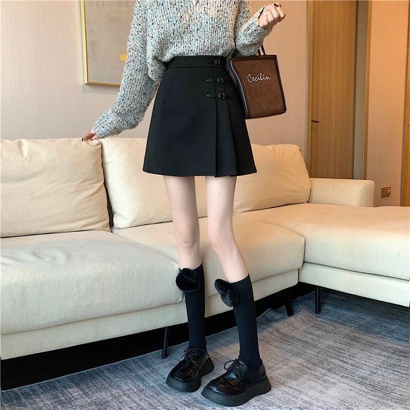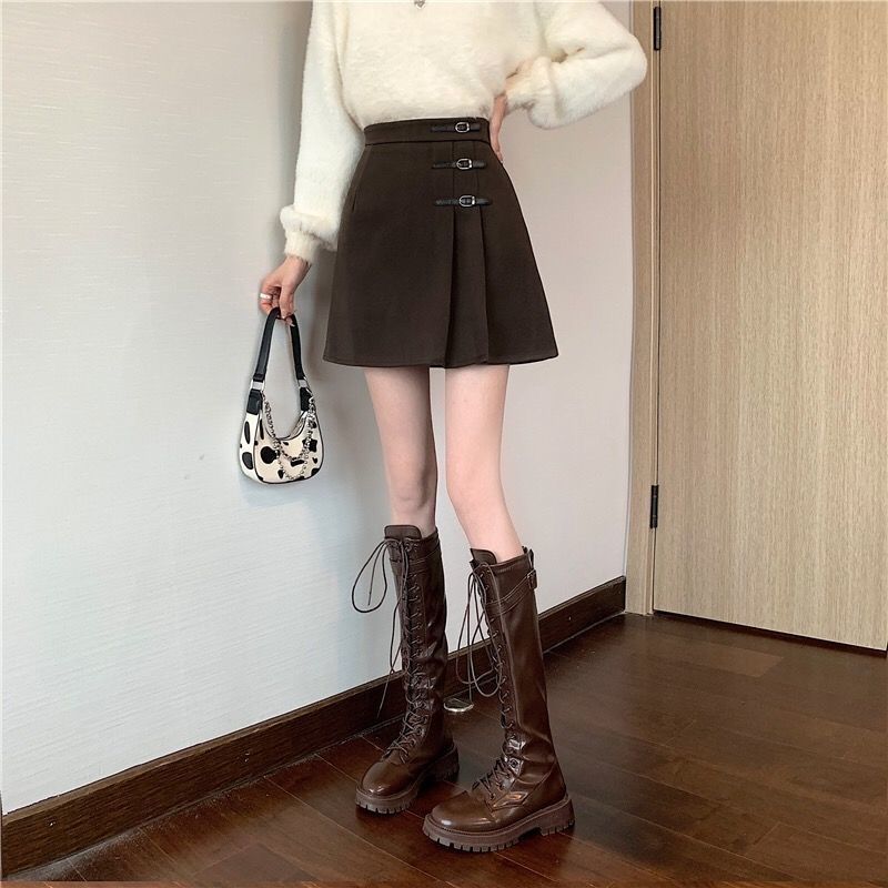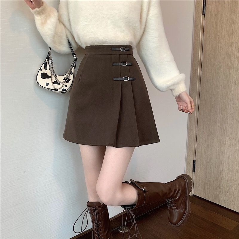 Falda de Lana Negra para Mujer Primavera y Otoño 2024 Estilo Coreano Cintura Alta Falda Plisada Ajustada Versátil Línea A Falda de Cadera