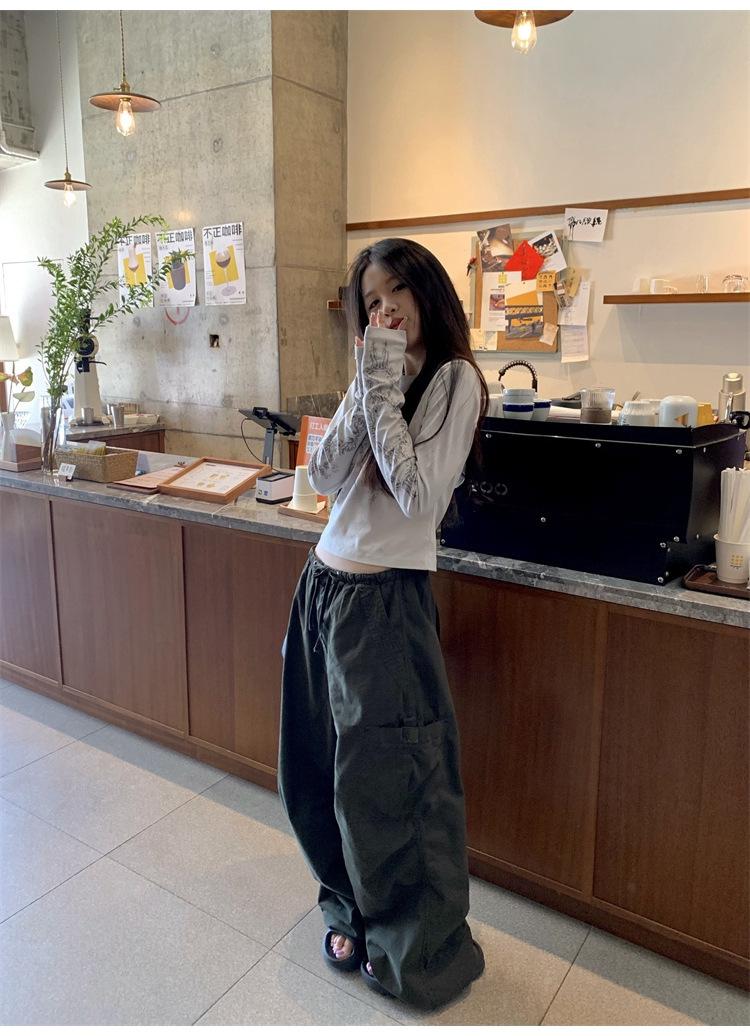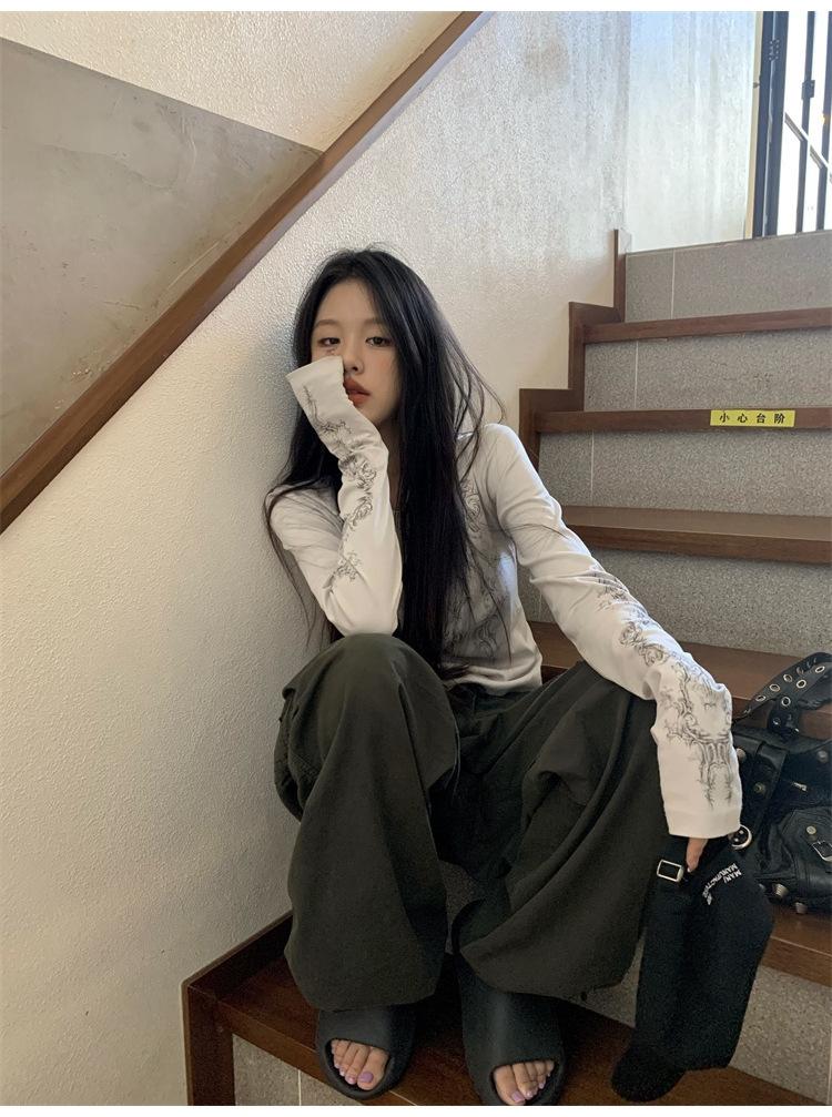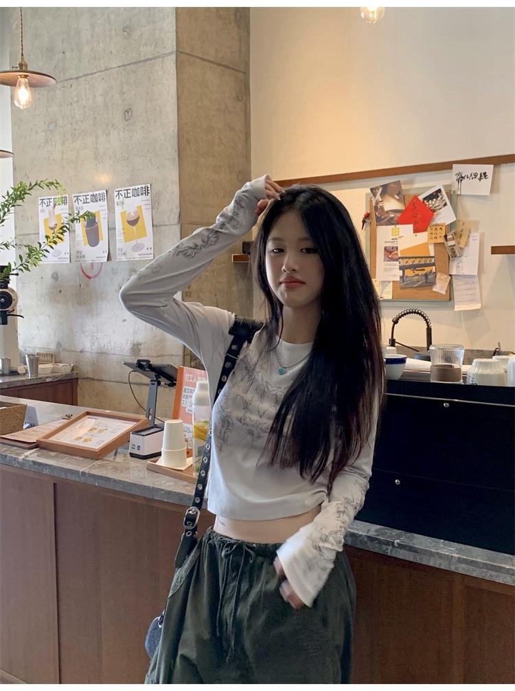 Camiseta corta con estampado vintage chic para mujer, otoño 2025, nueva camiseta ajustada de manga larga con diseño de nicho.
