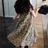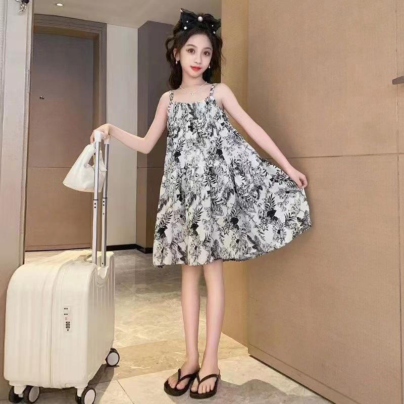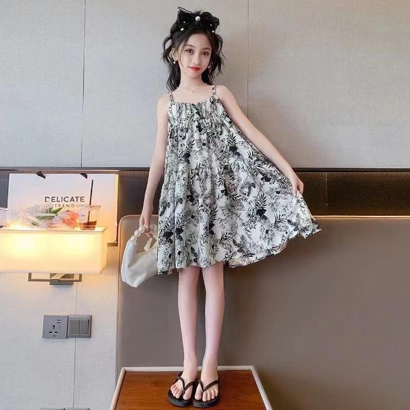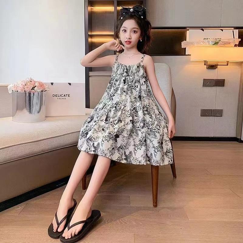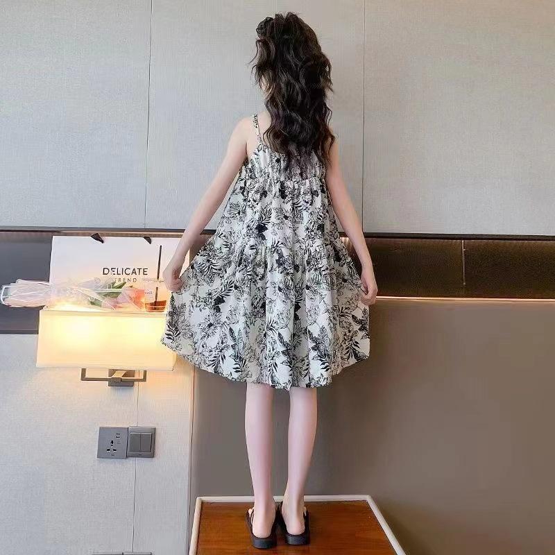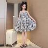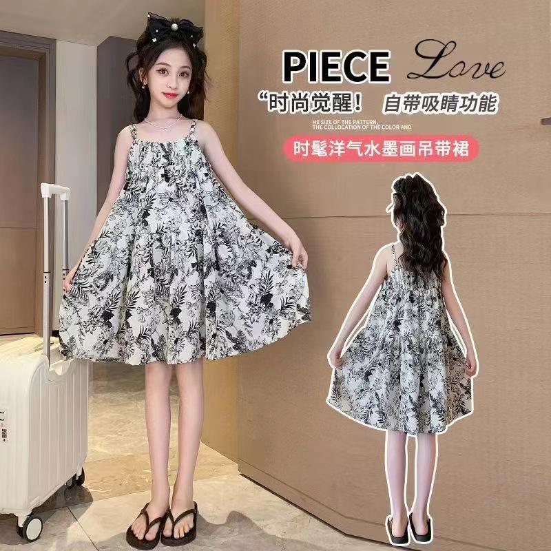 Verano Nuevo Vestido Pastoral Pintura de Tinta para Niñas Elegante Combinable Moda Tirantes Vestido de Princesa Niños Grandes Tendencia