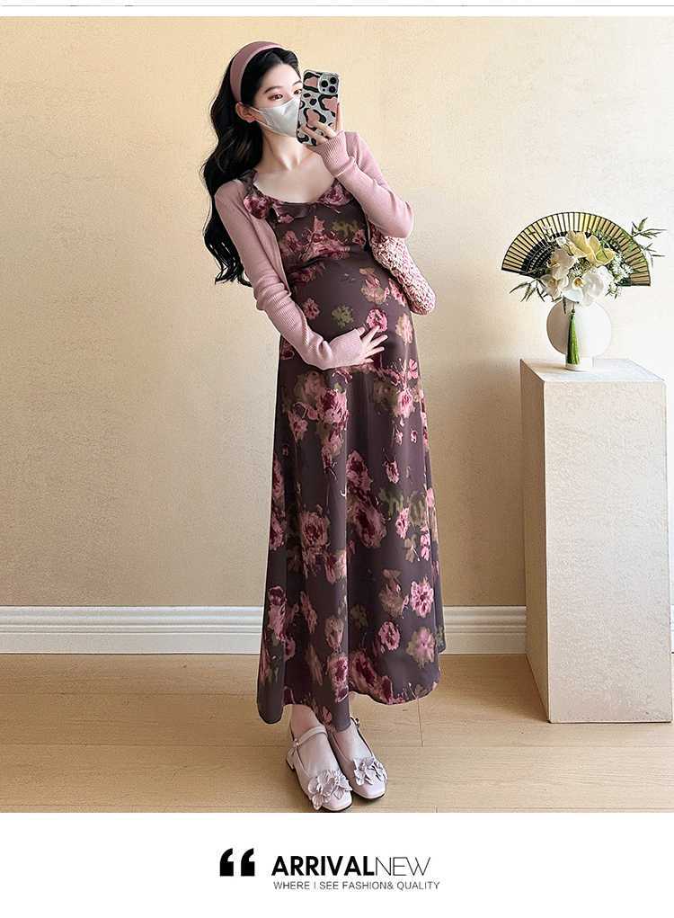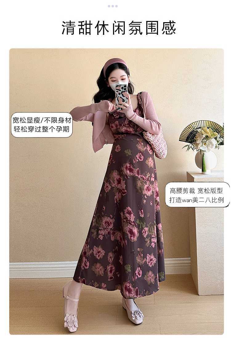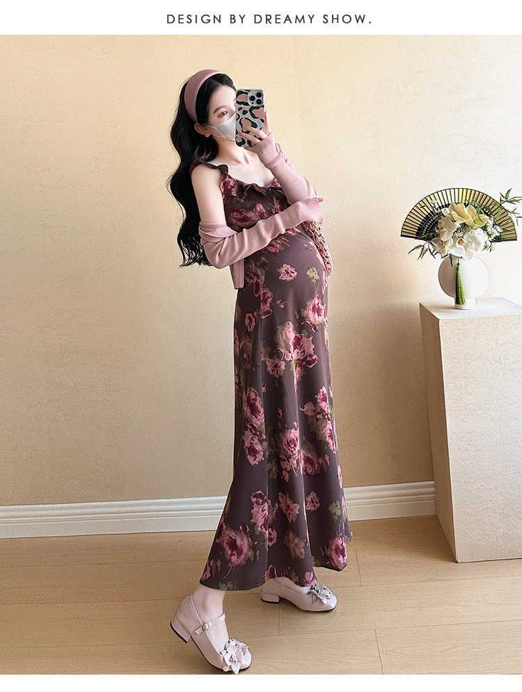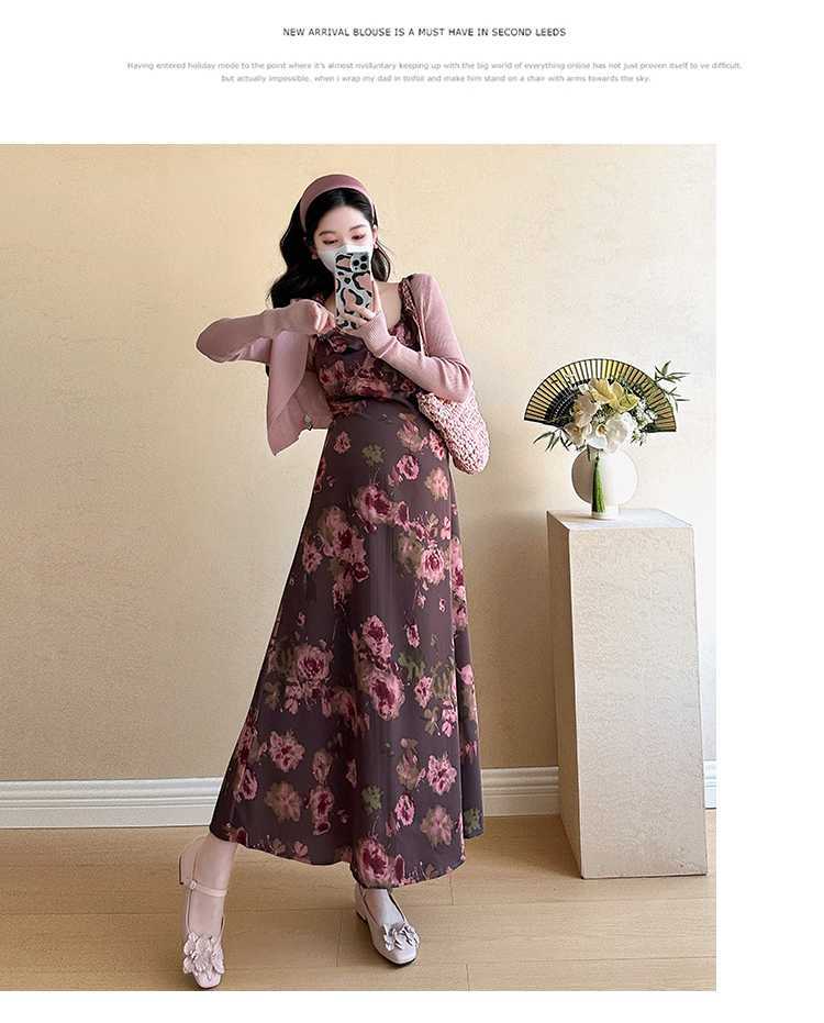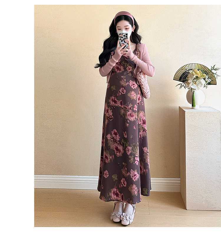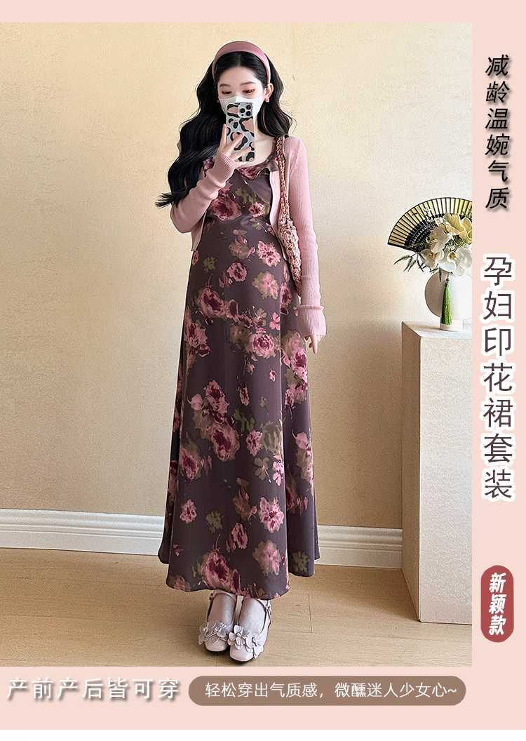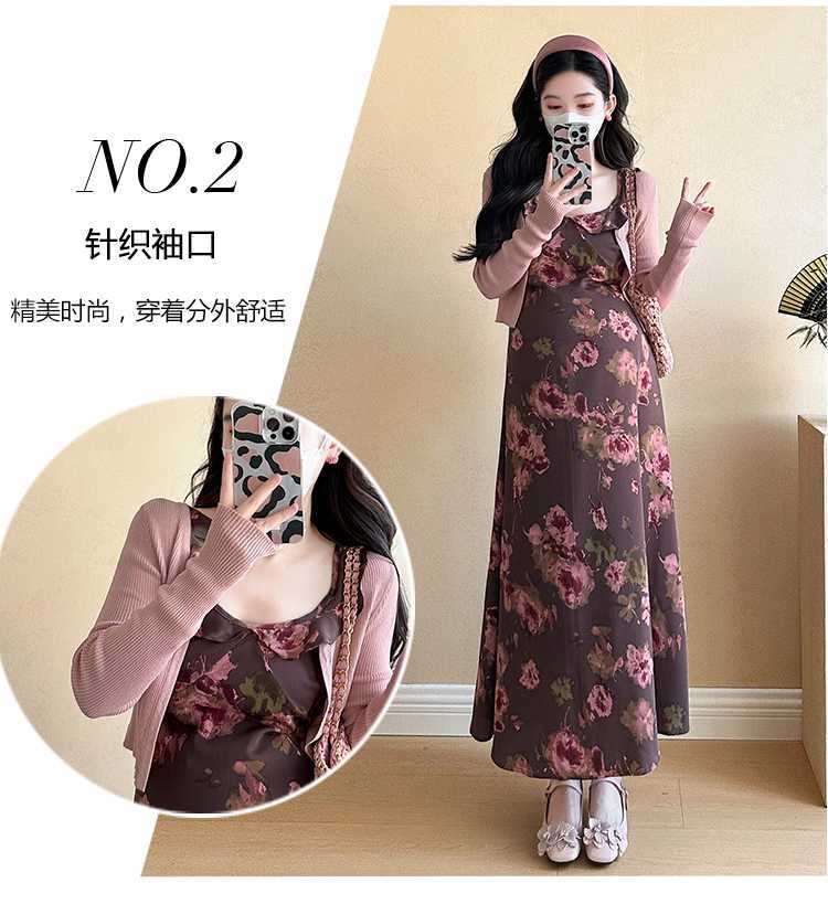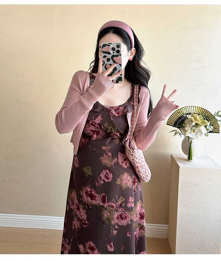 Ropa de Maternidad Otoño 2025 Conjunto de Dos Piezas Francés Rejuvenecedor Nuevo Cárdigan de Protección Solar de Manga Larga Falda Larga de Maternidad de Color a la Moda