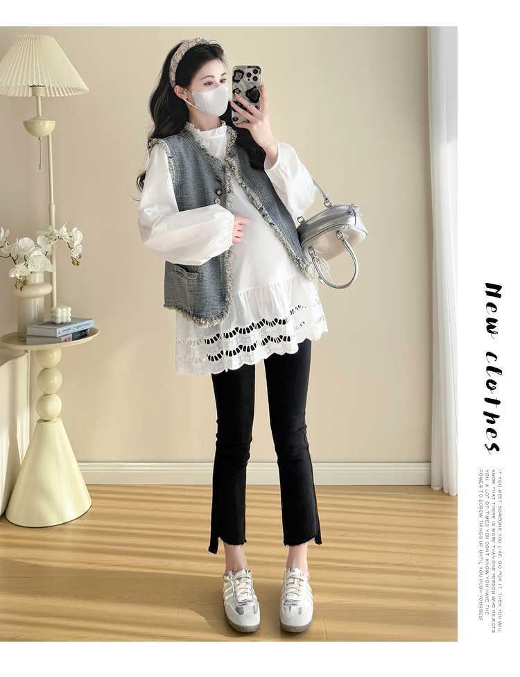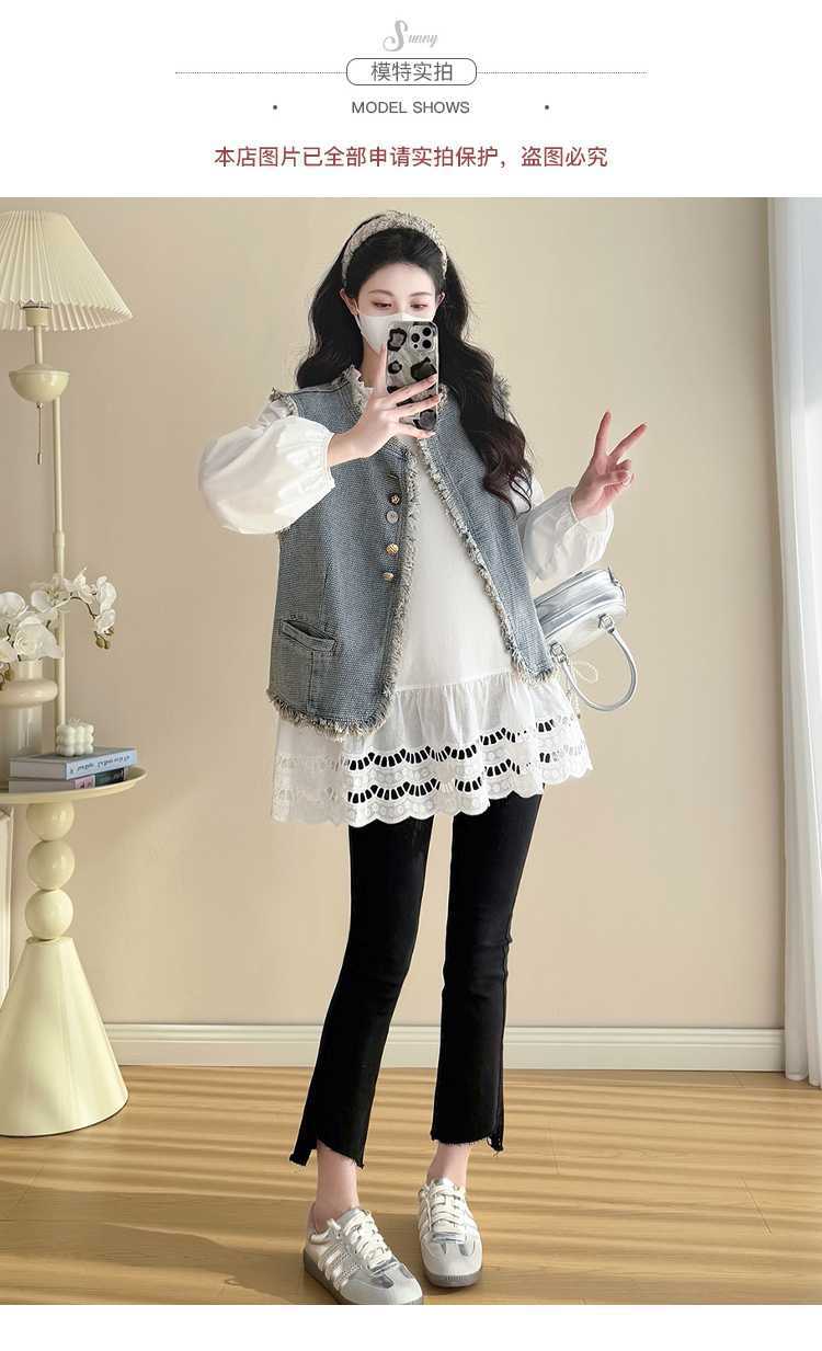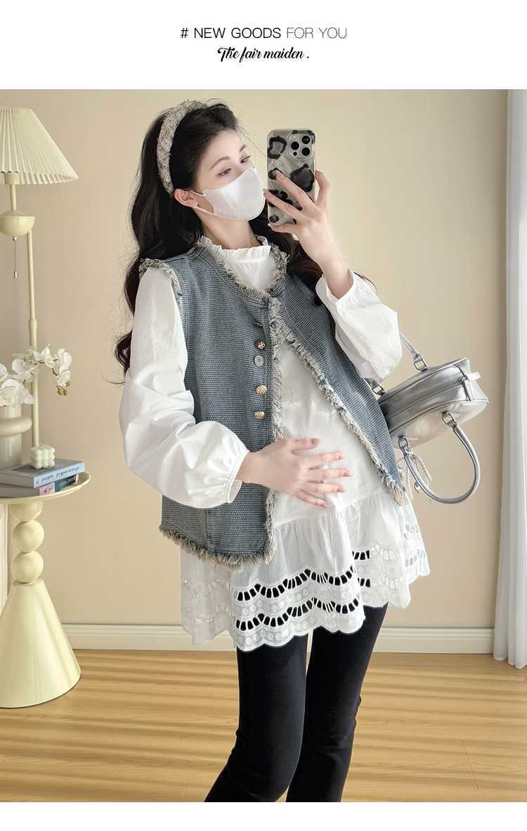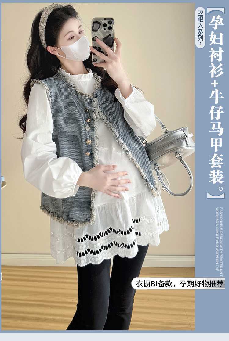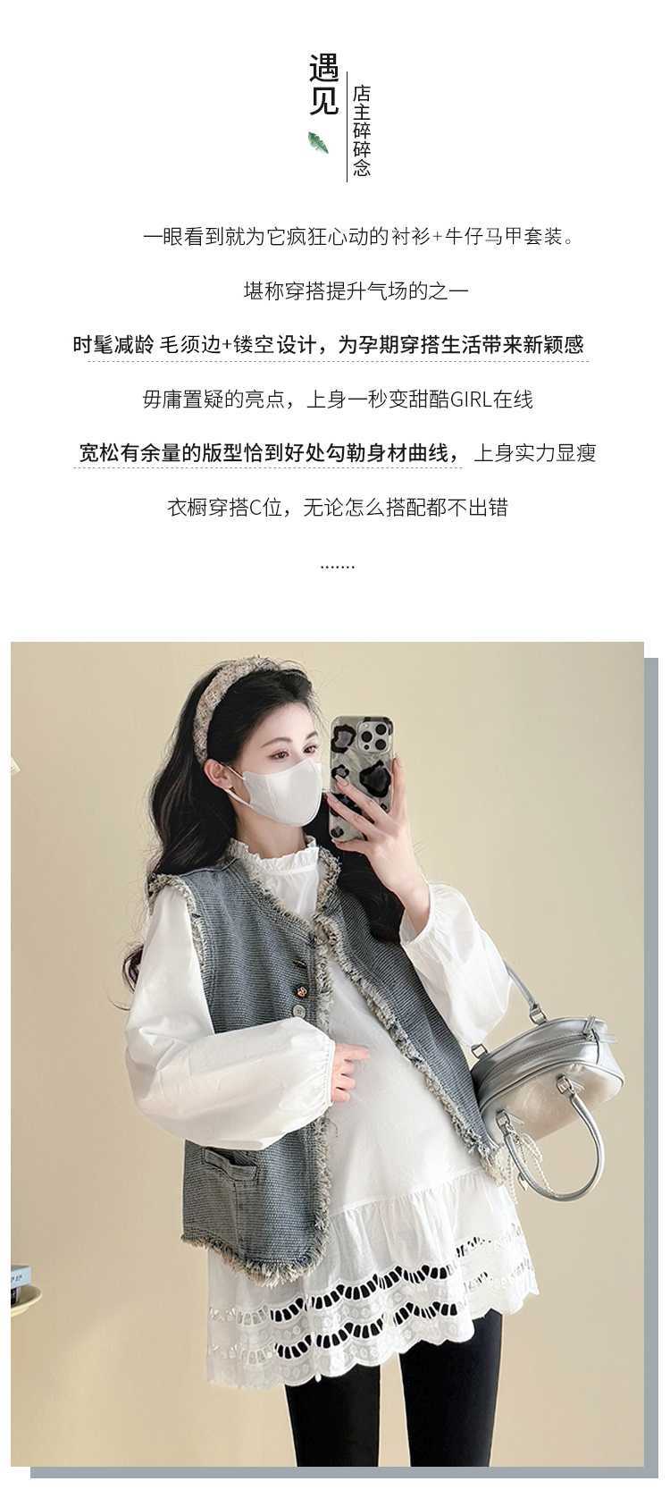 Conjunto de dos piezas de moda para embarazadas de primavera 2025, nuevo chaleco vaquero con borlas y camisa de manga larga hueca para embarazadas.