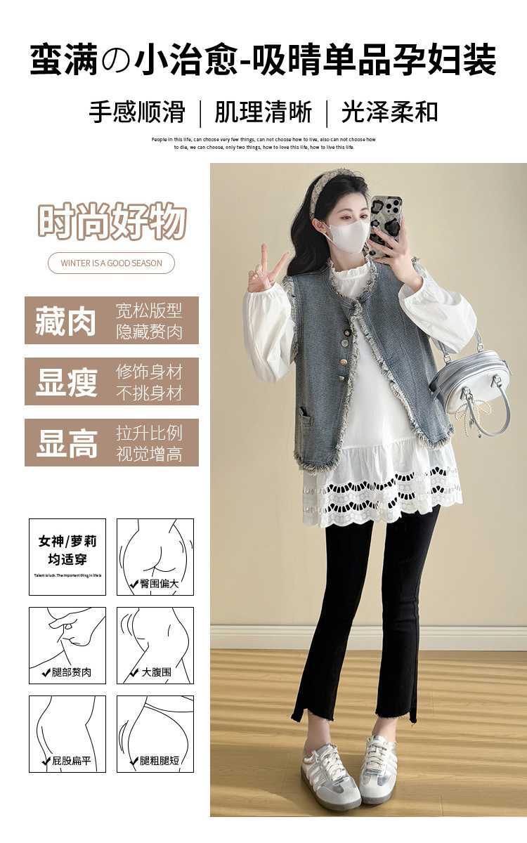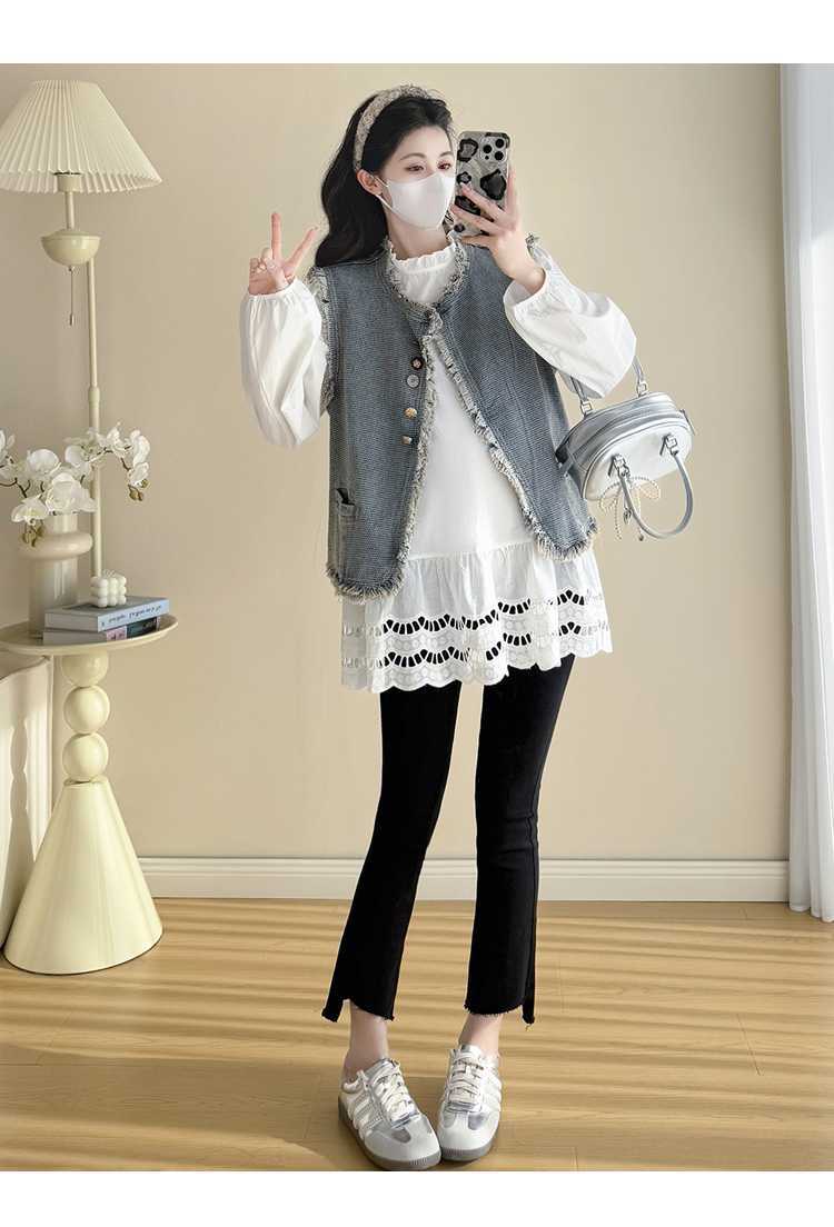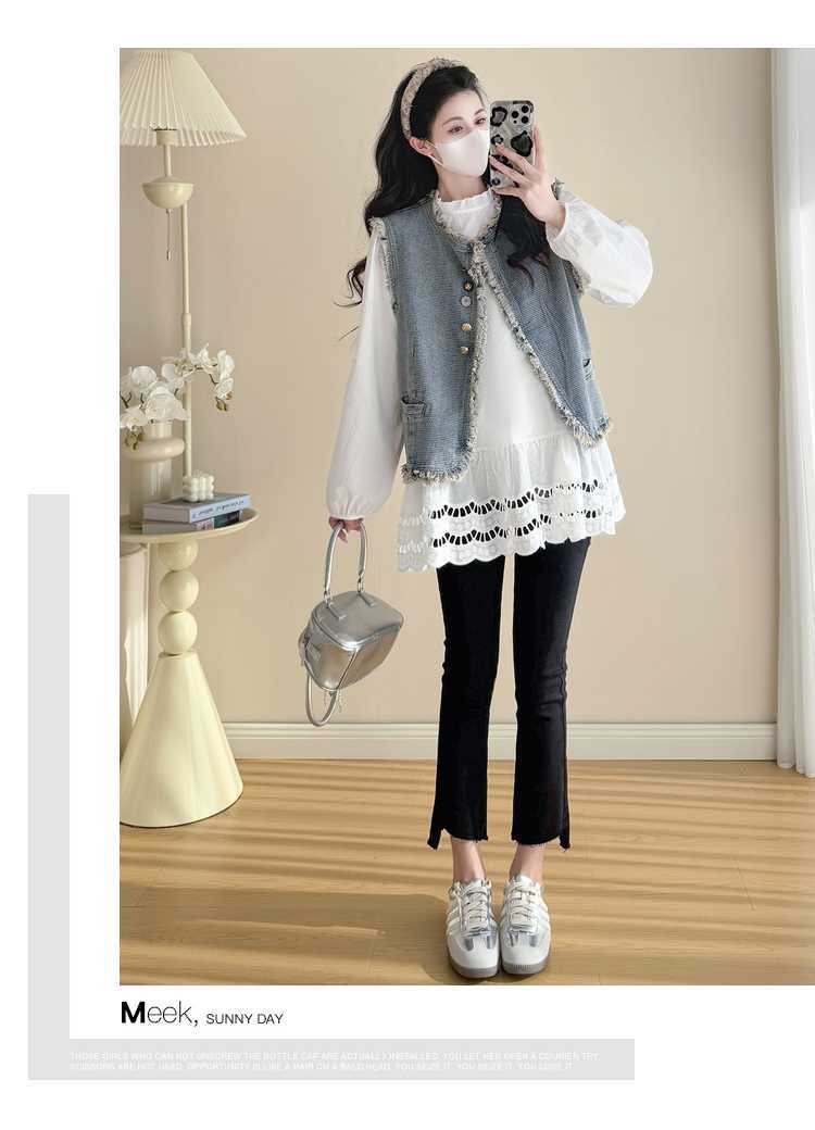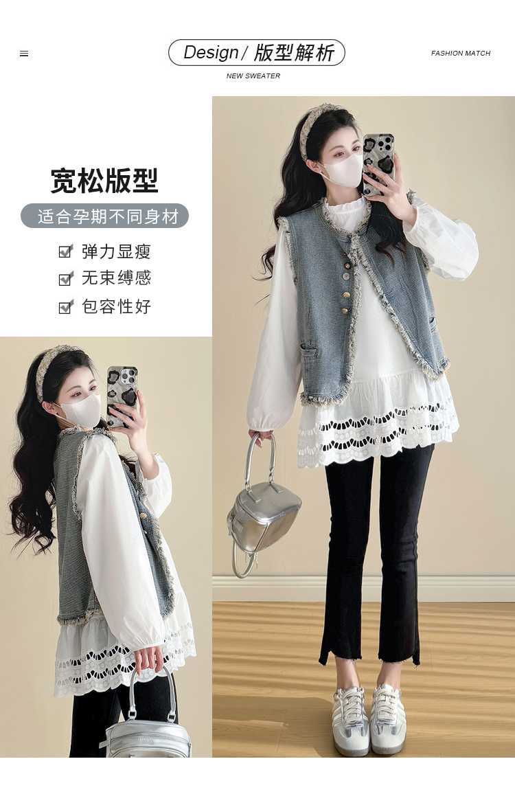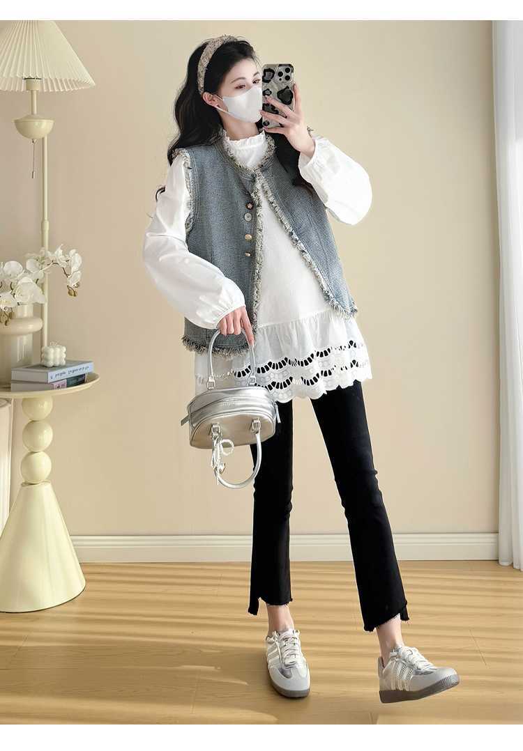 Conjunto de dos piezas de moda para embarazadas de primavera 2025, nuevo chaleco vaquero con borlas y camisa de manga larga hueca para embarazadas.