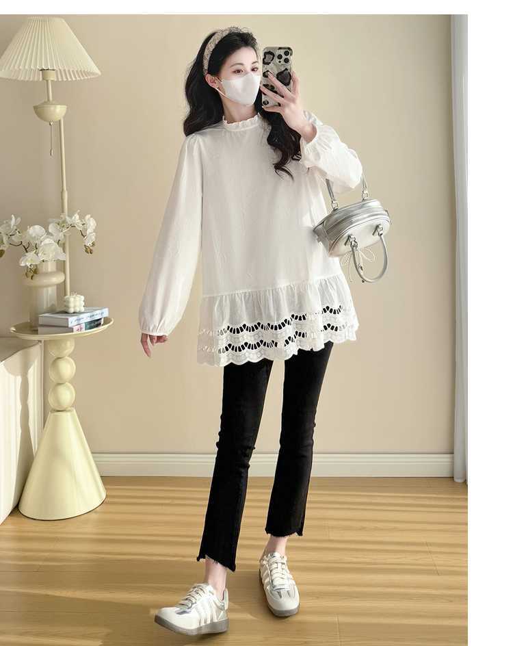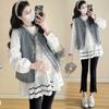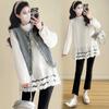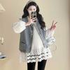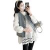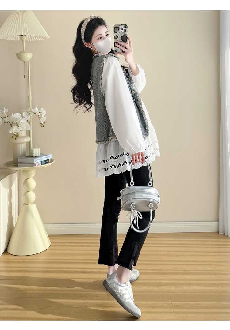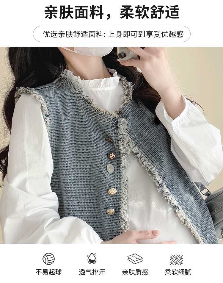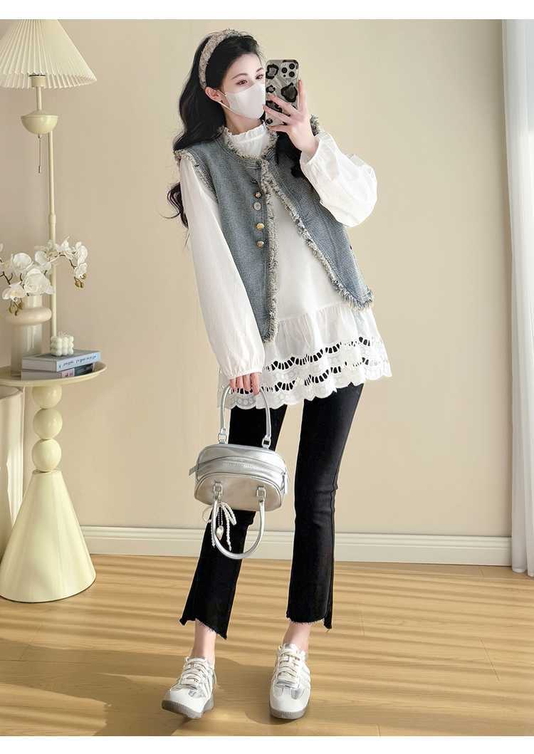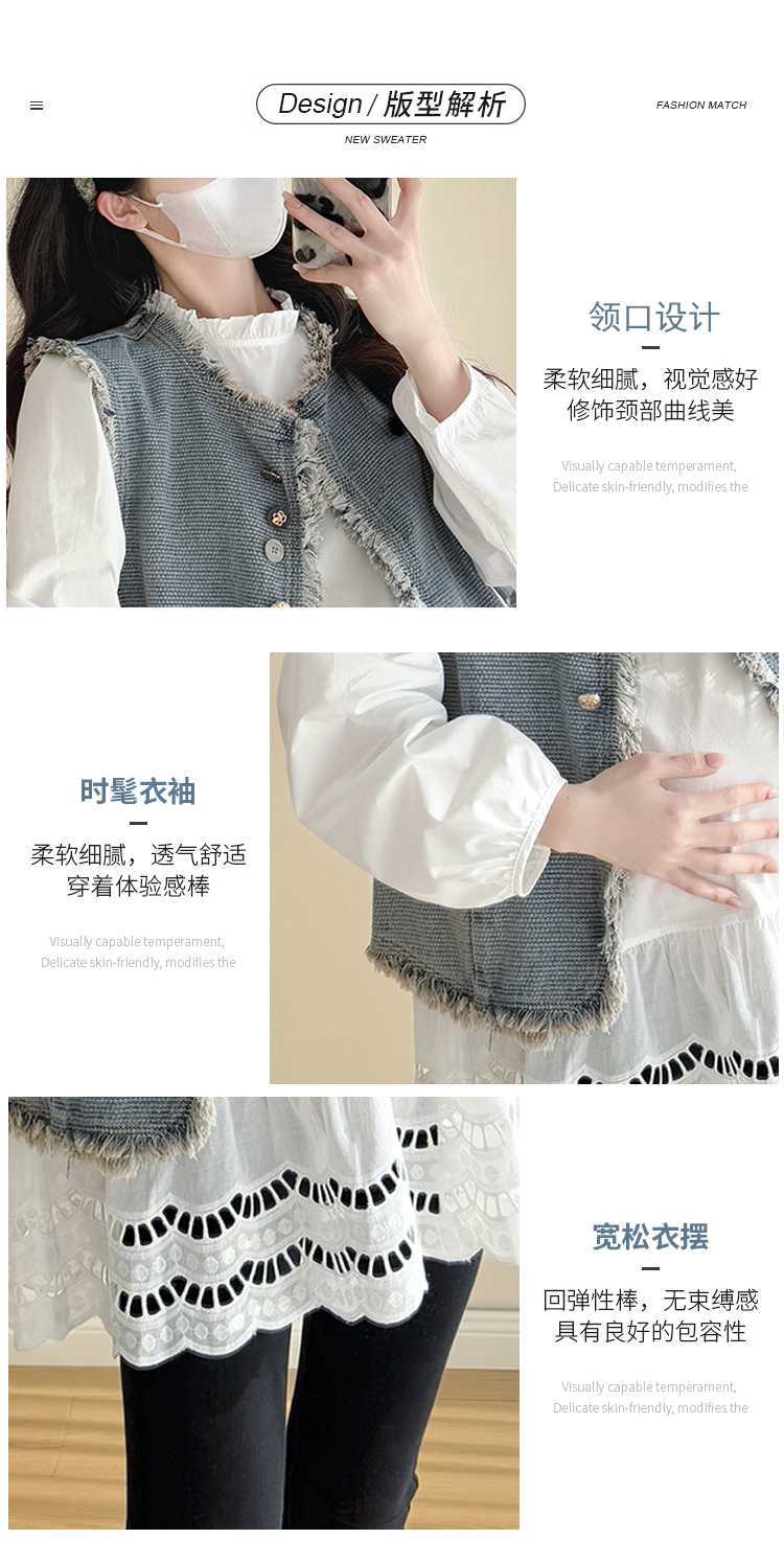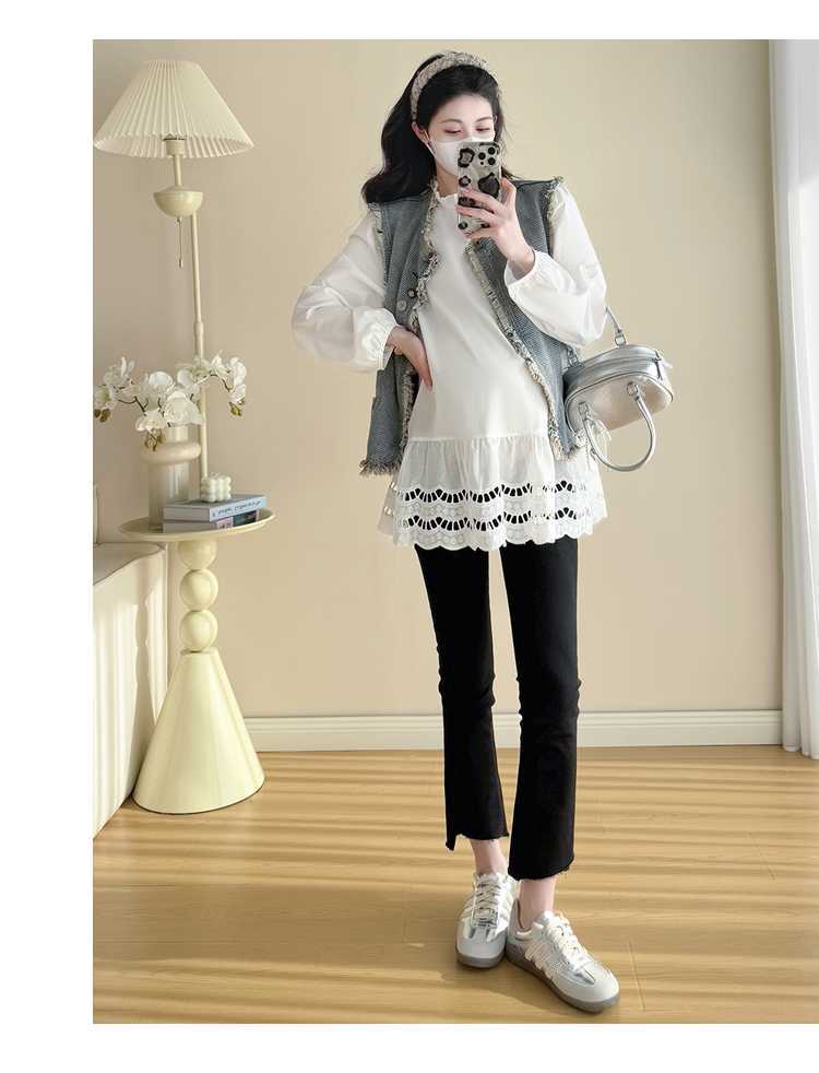 Conjunto de dos piezas de moda para embarazadas de primavera 2025, nuevo chaleco vaquero con borlas y camisa de manga larga hueca para embarazadas.