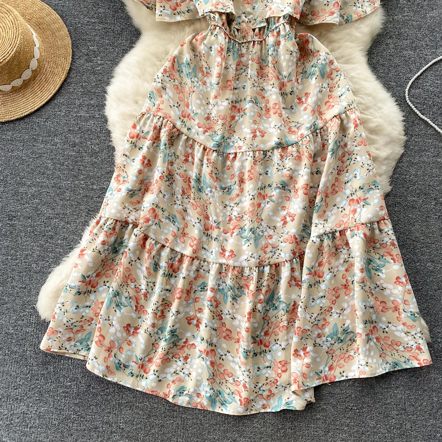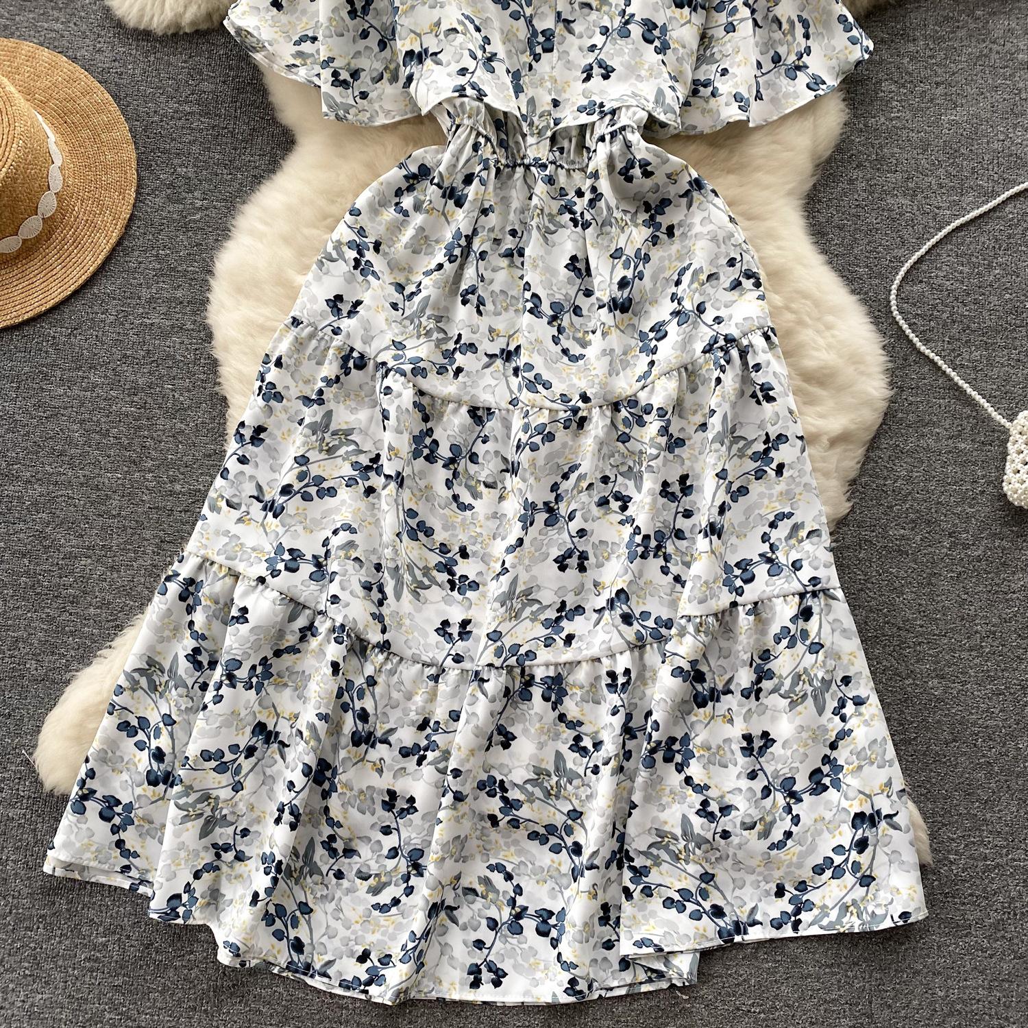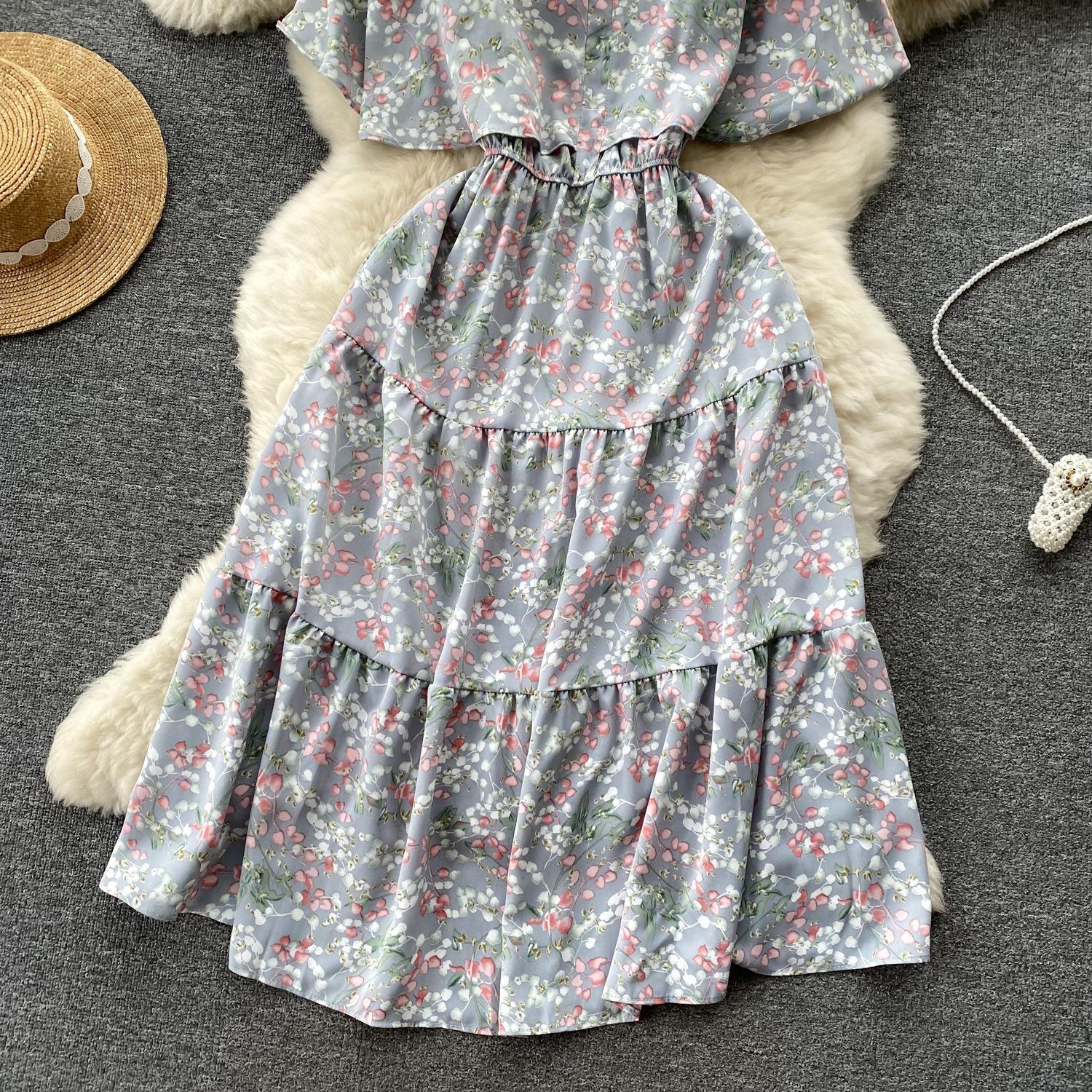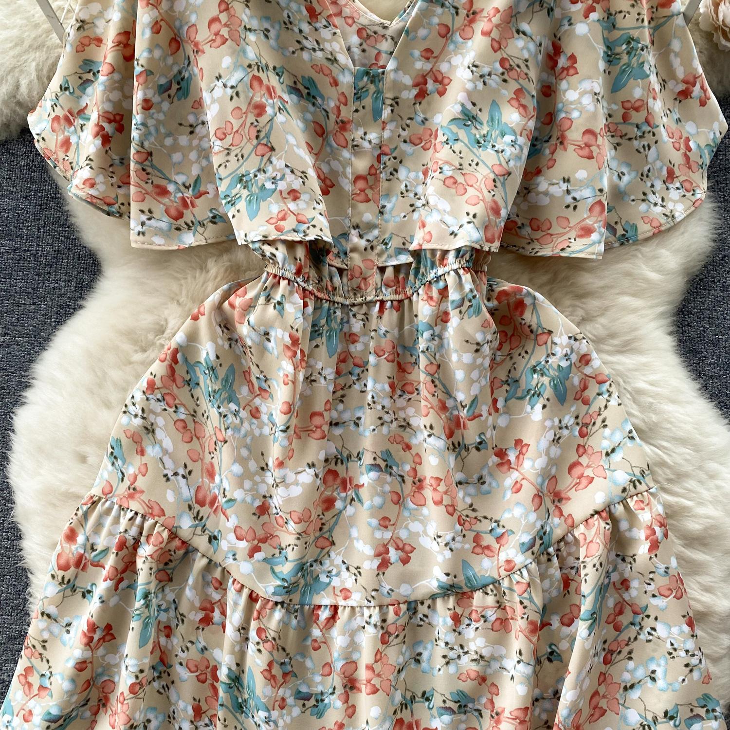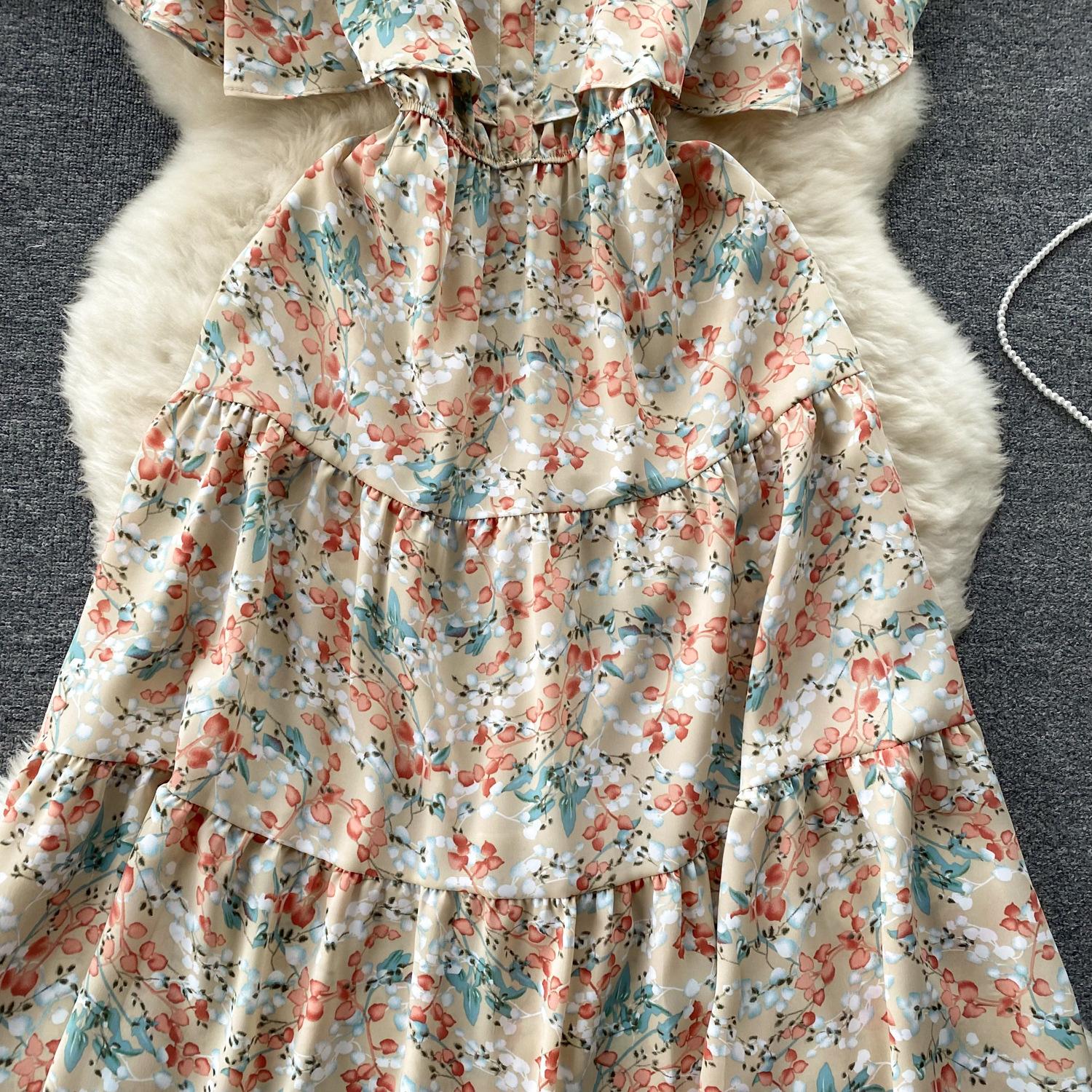 Vestido de verano de gasa con cuello francés, elegante y con volantes florales para mujer, con cintura adelgazante y corte de té.
