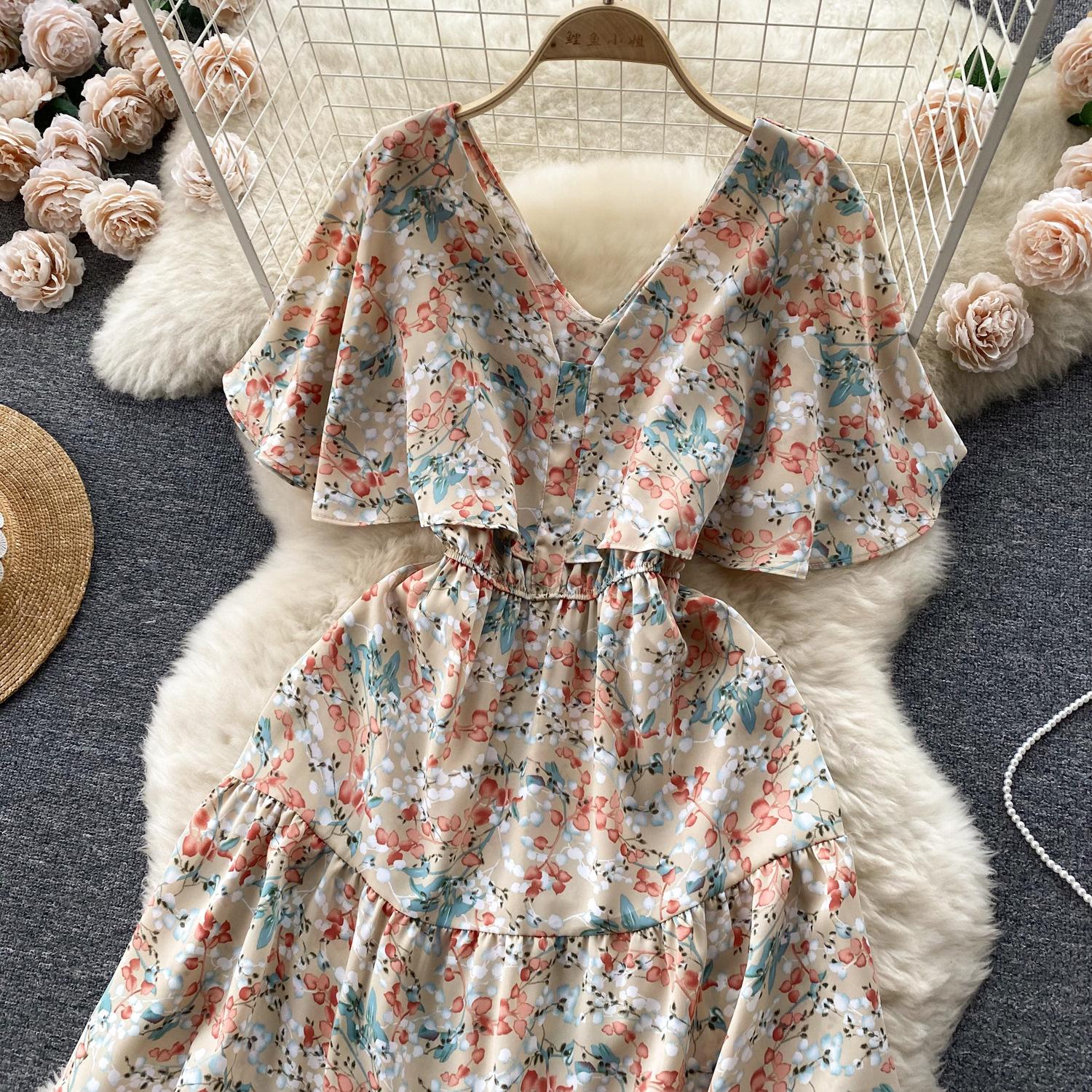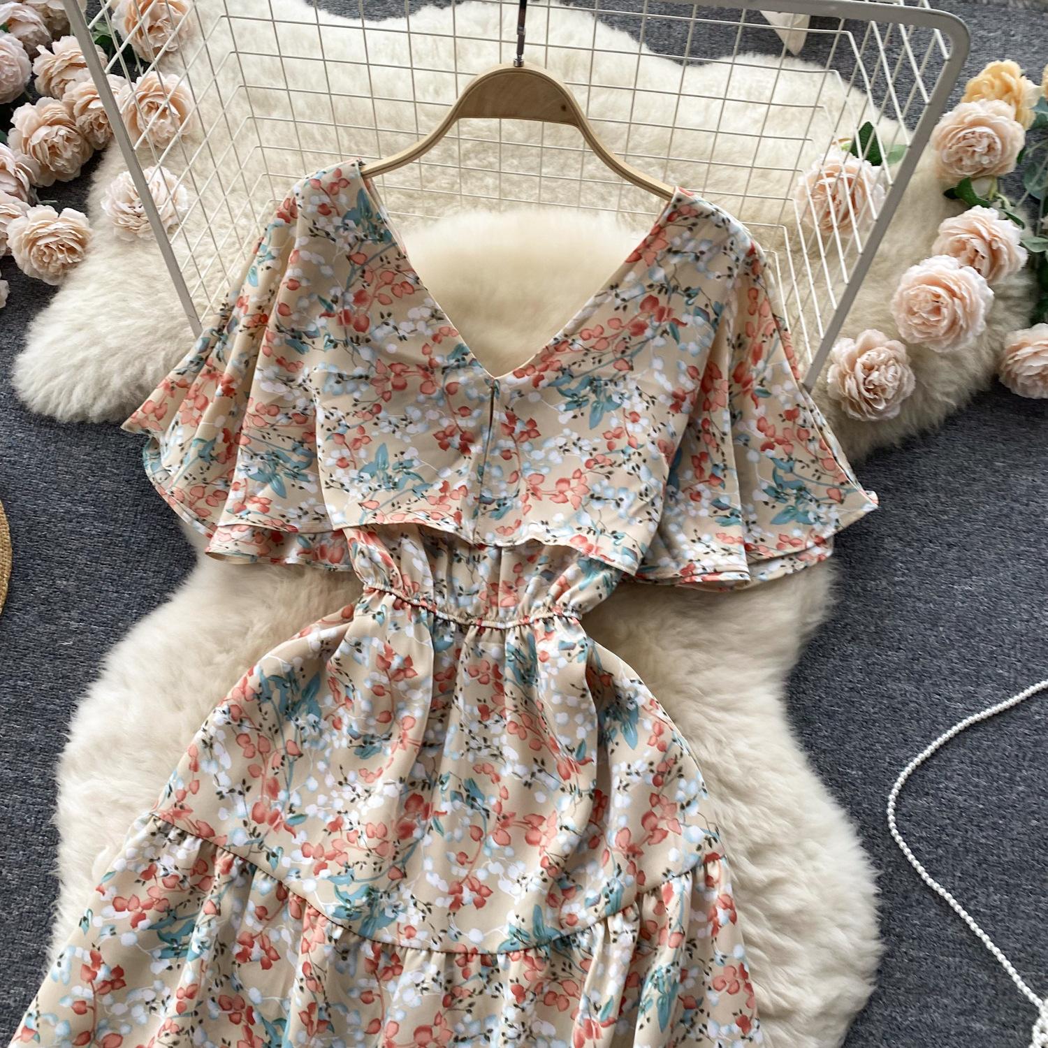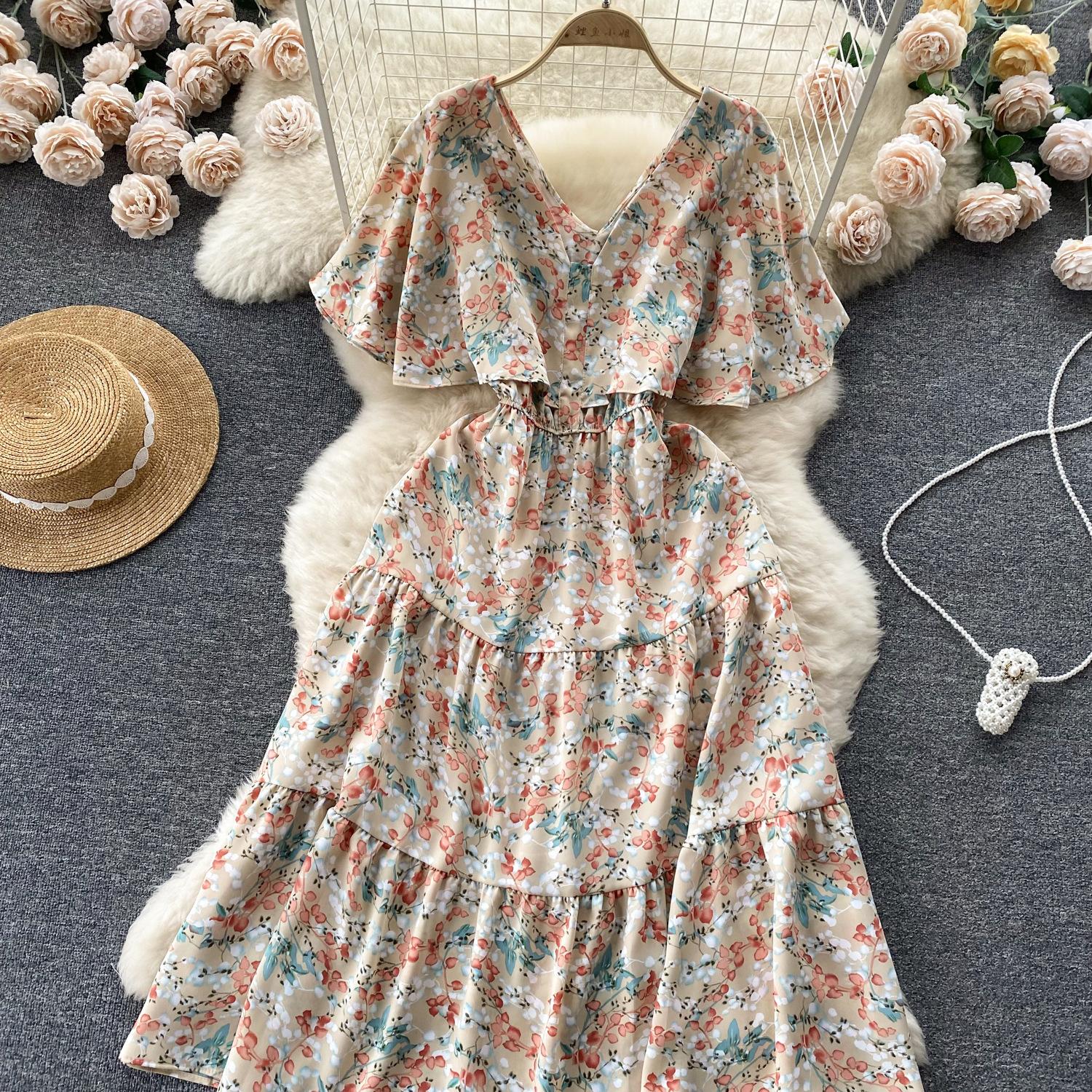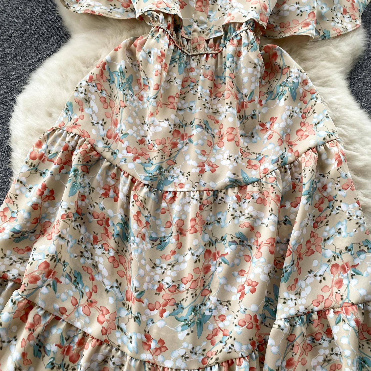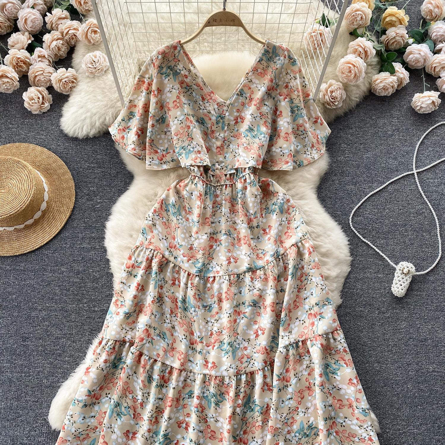Vestido de verano de gasa con cuello francés, elegante y con volantes florales para mujer, con cintura adelgazante y corte de té.