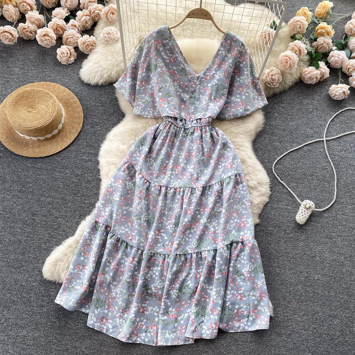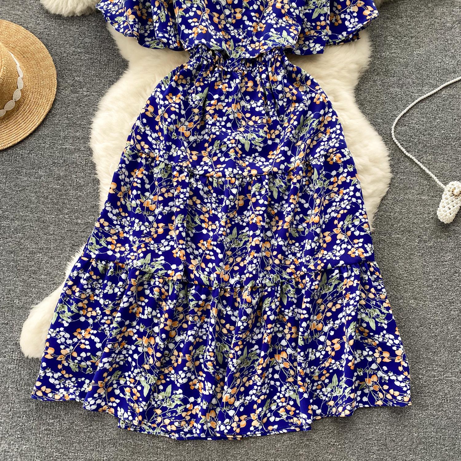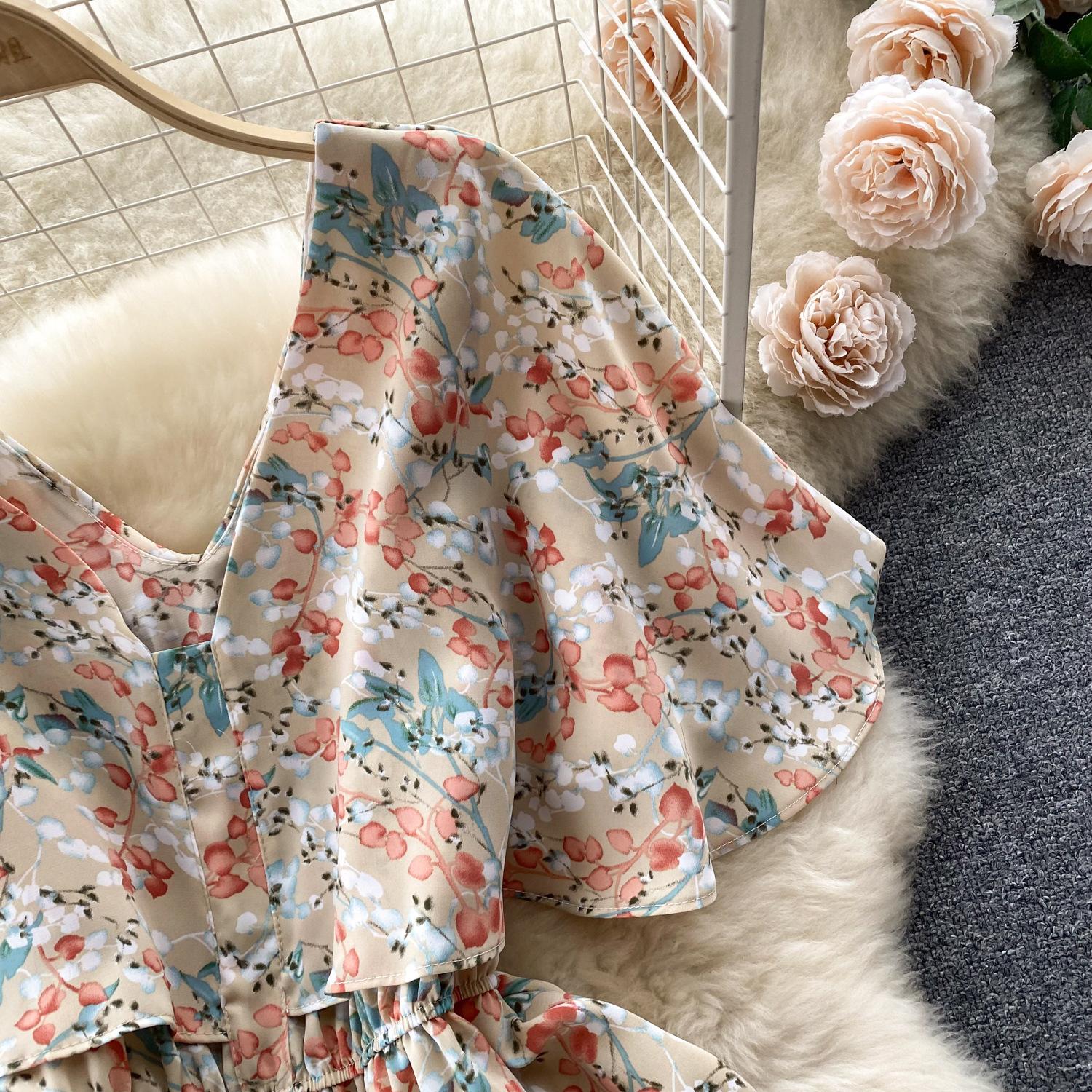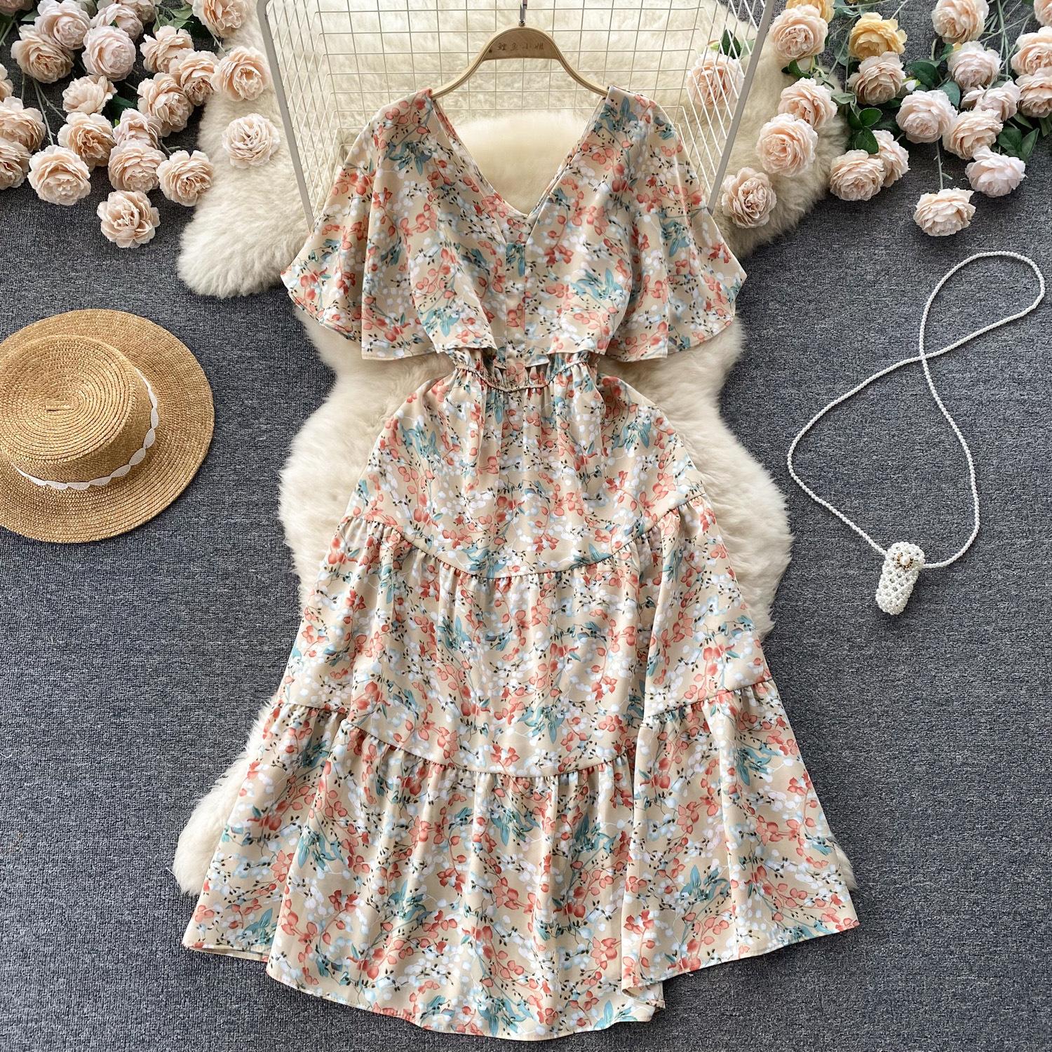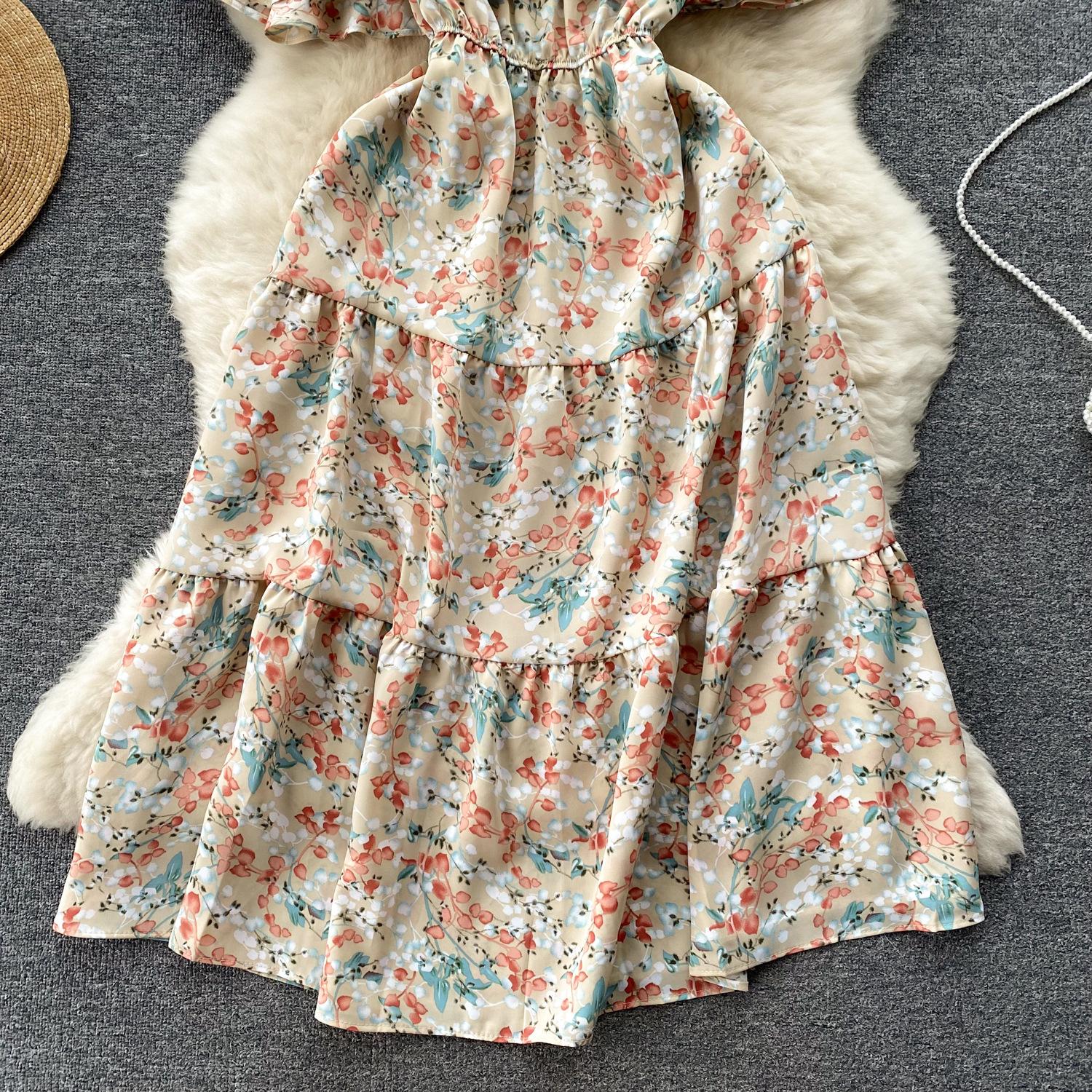 Vestido de verano de gasa con cuello francés, elegante y con volantes florales para mujer, con cintura adelgazante y corte de té.