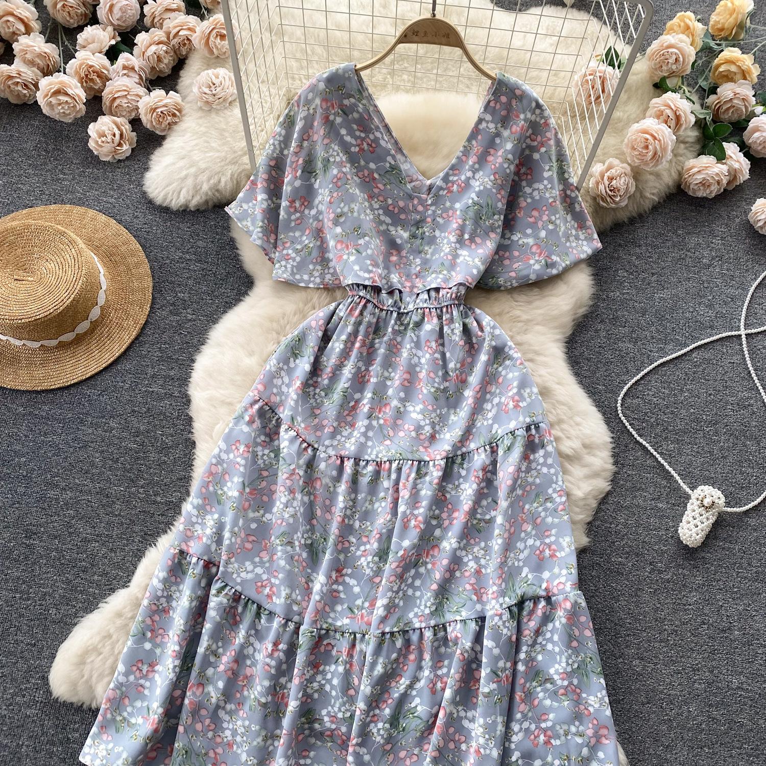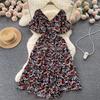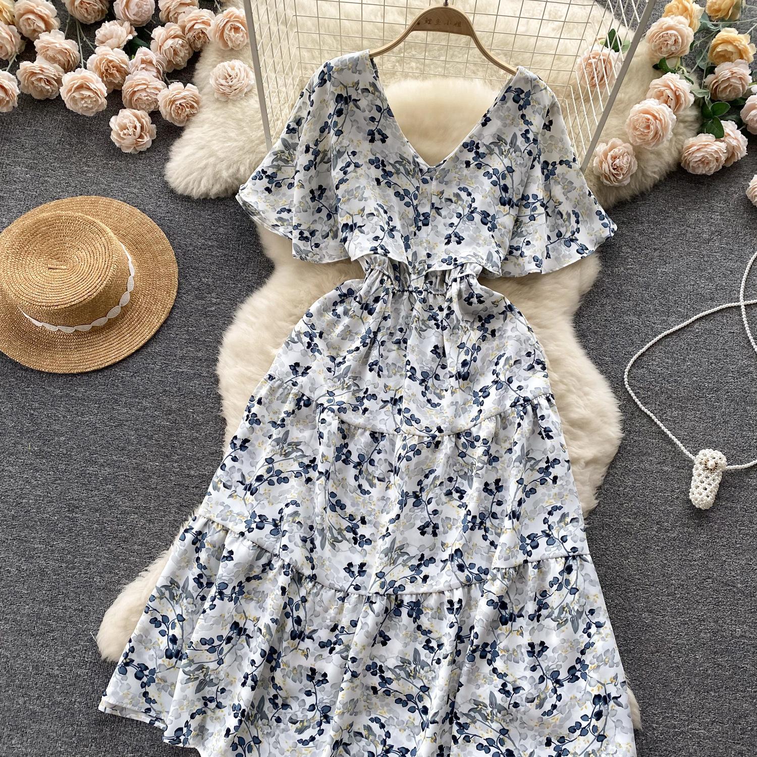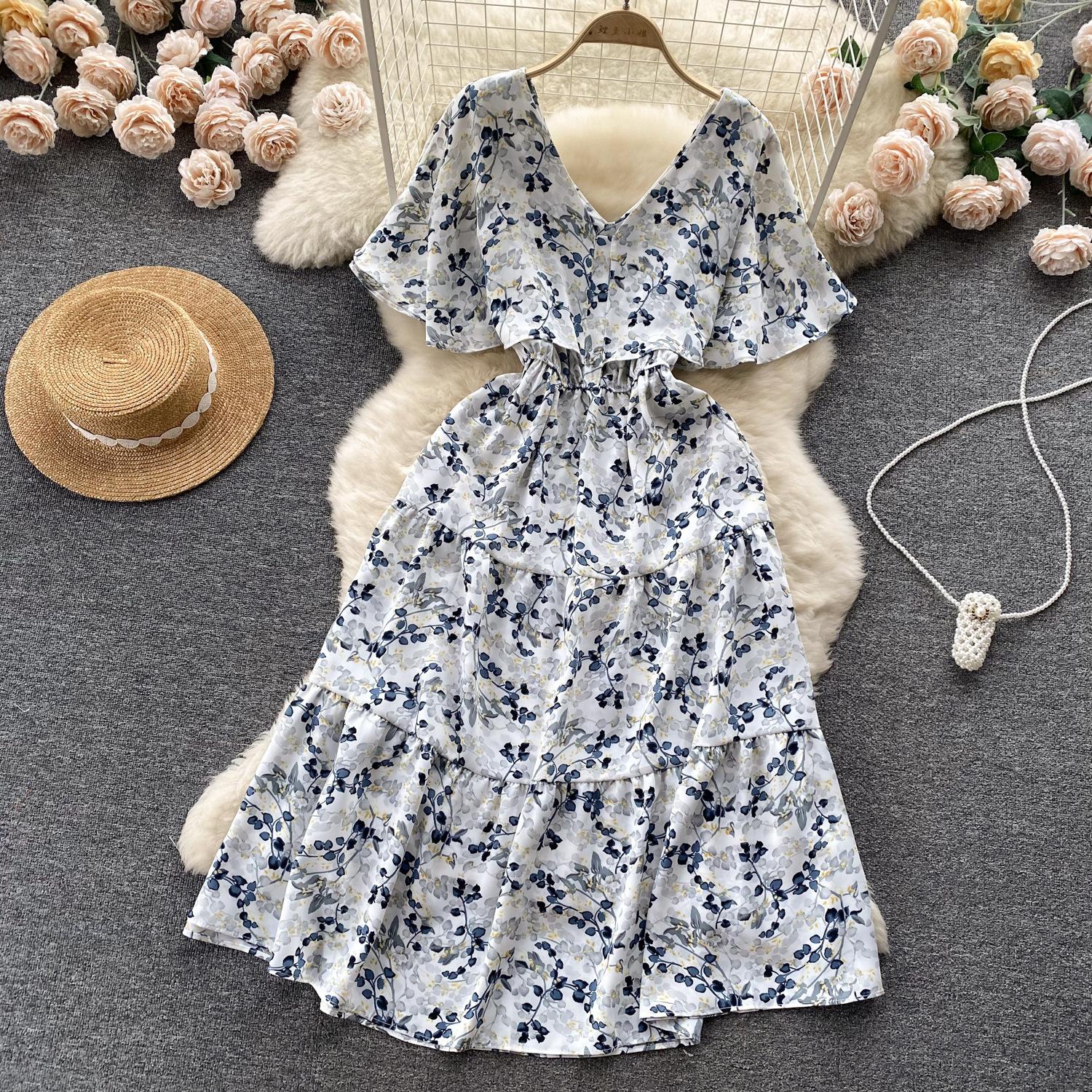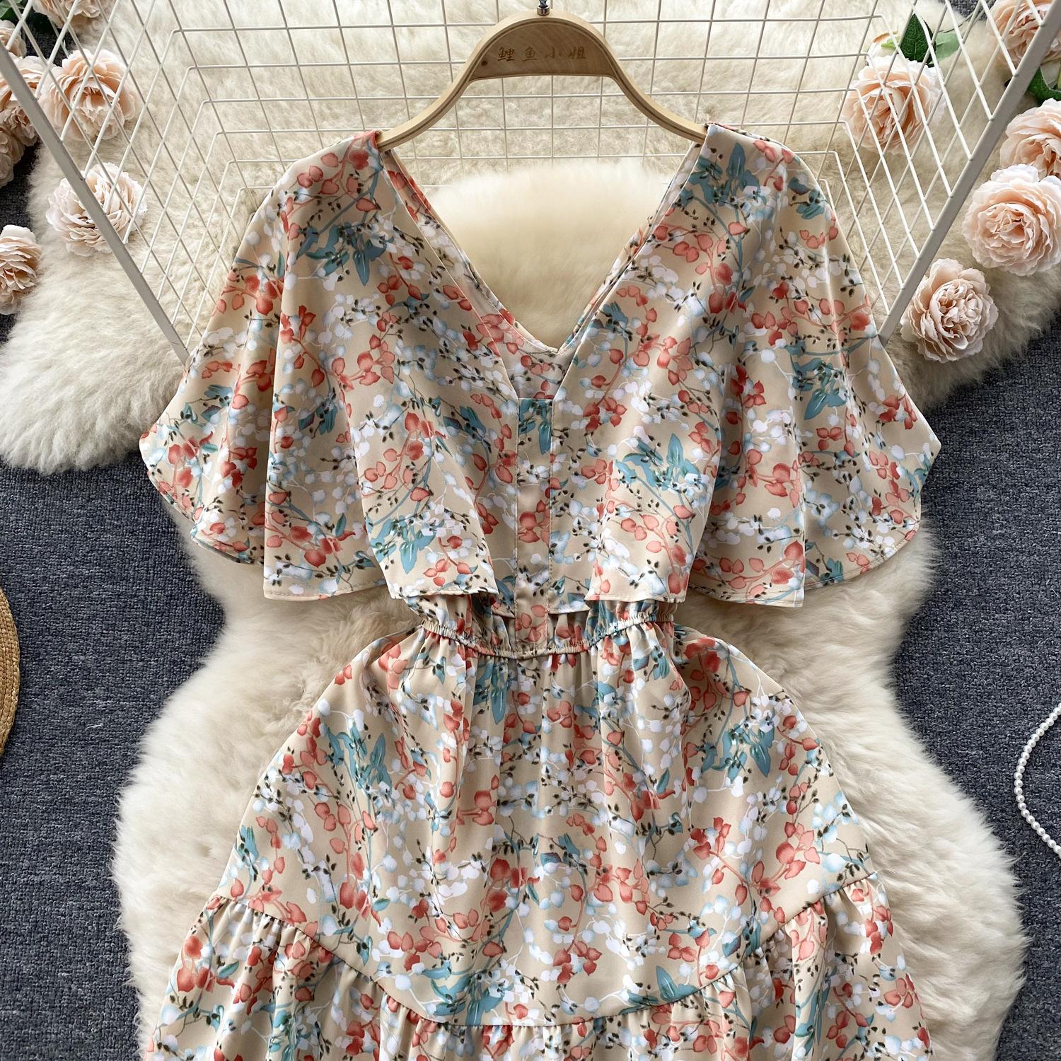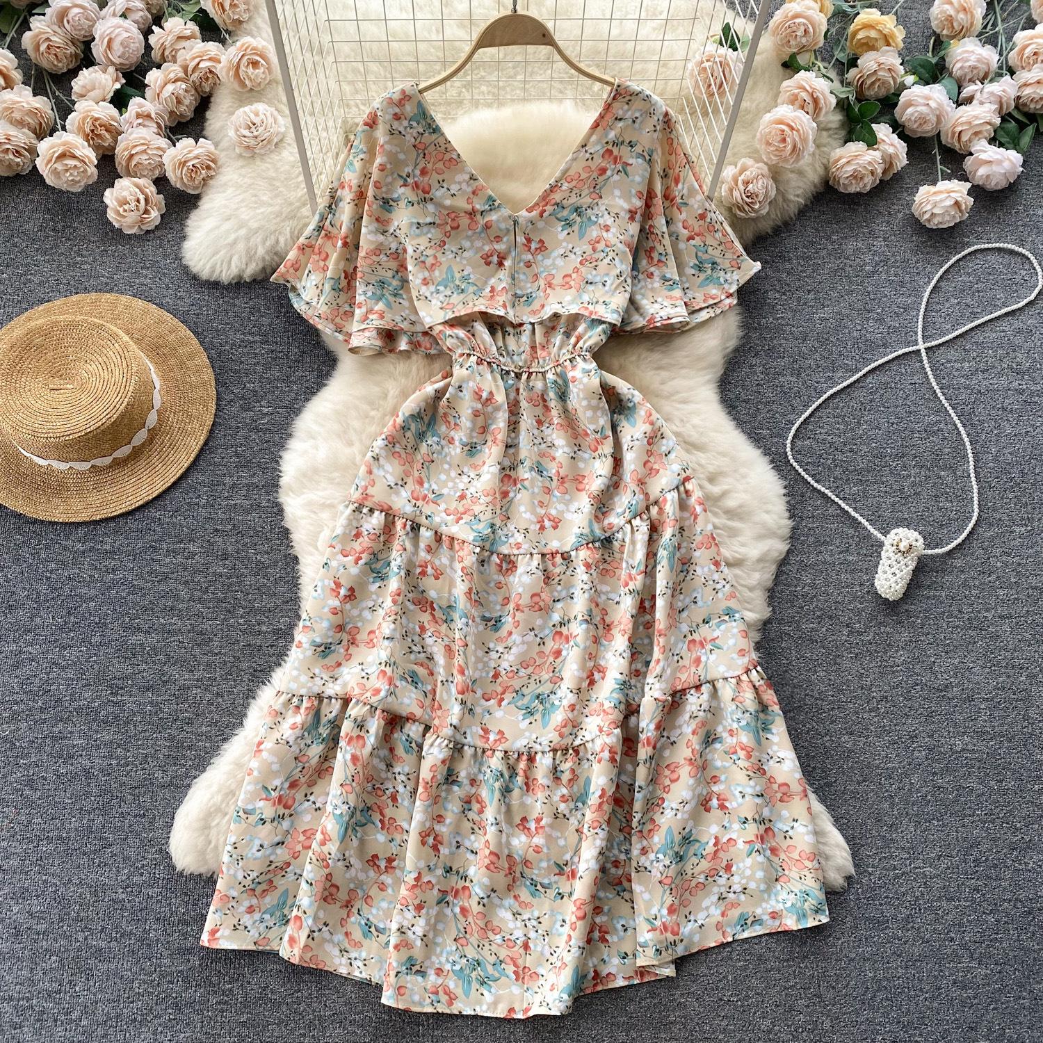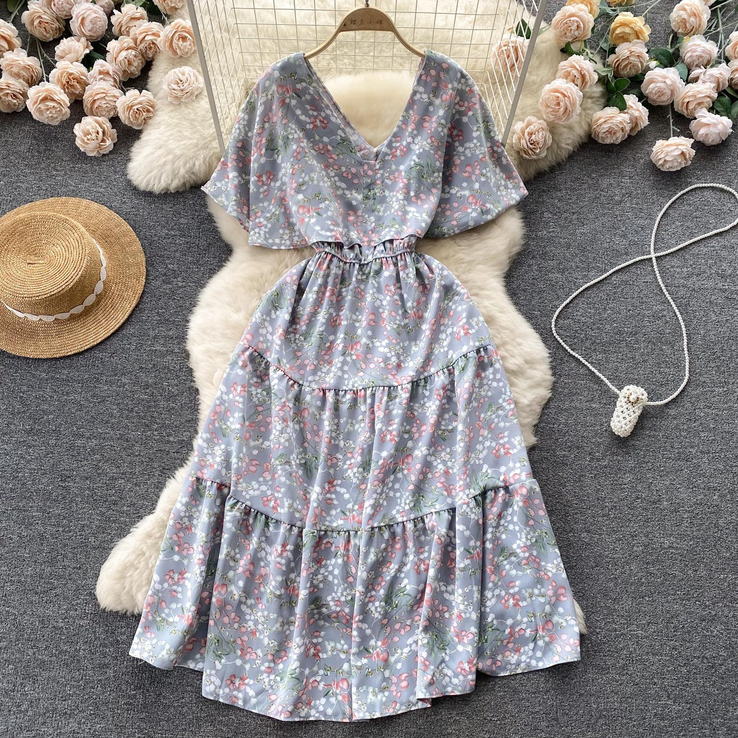 Vestido de verano de gasa con cuello francés, elegante y con volantes florales para mujer, con cintura adelgazante y corte de té.