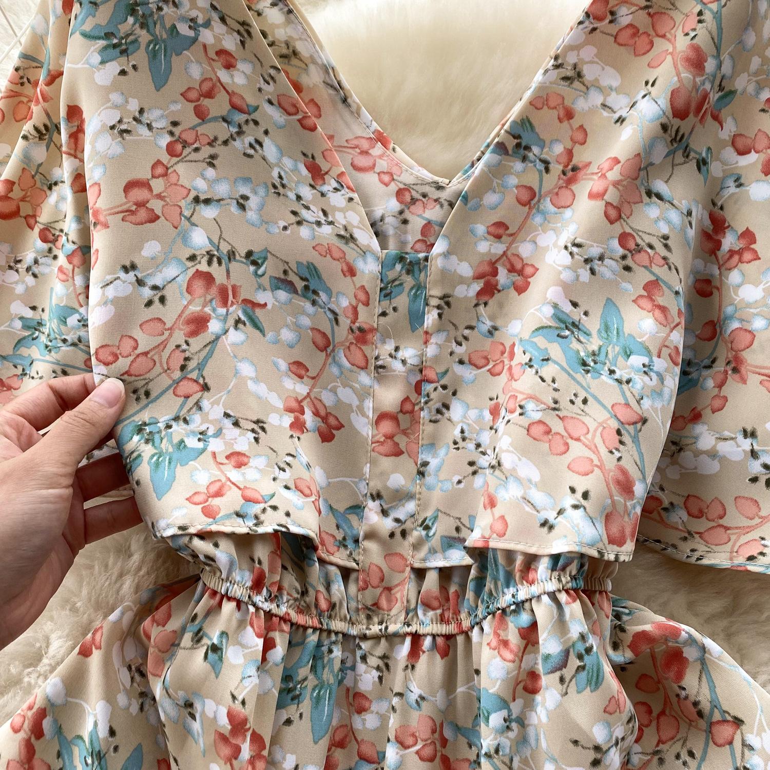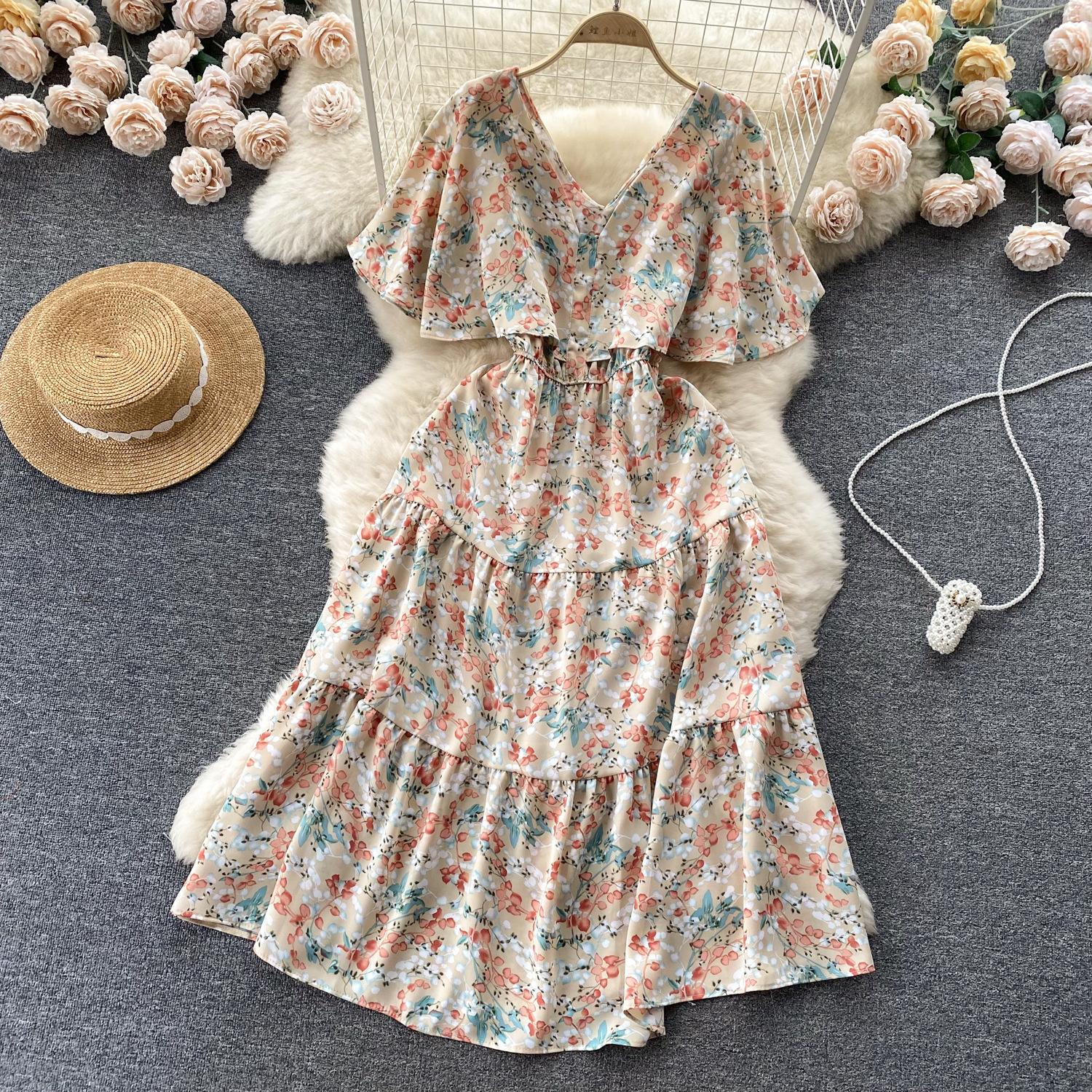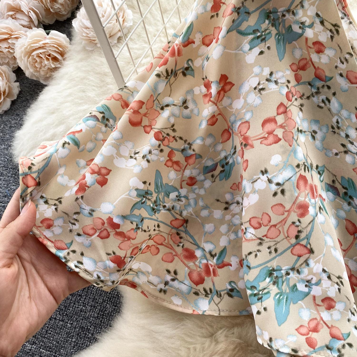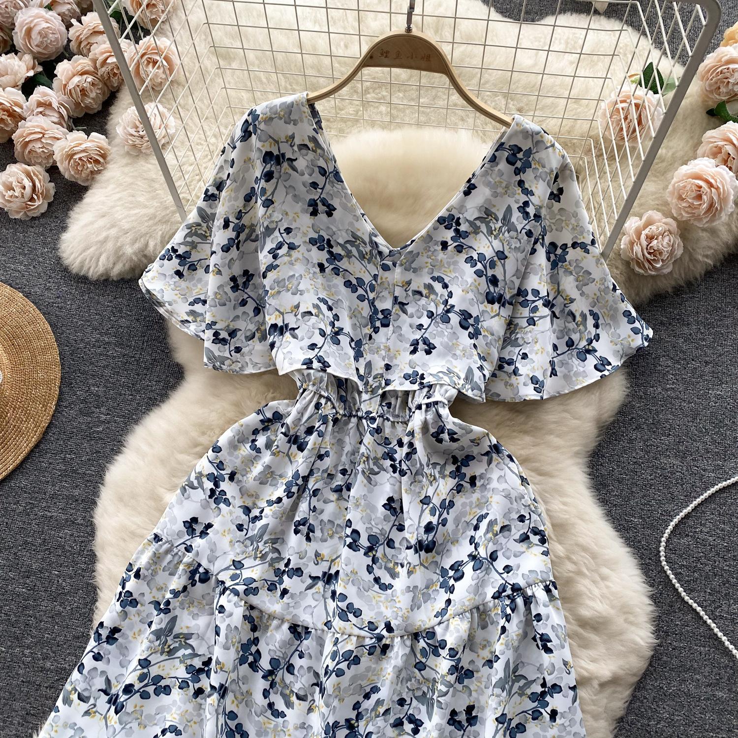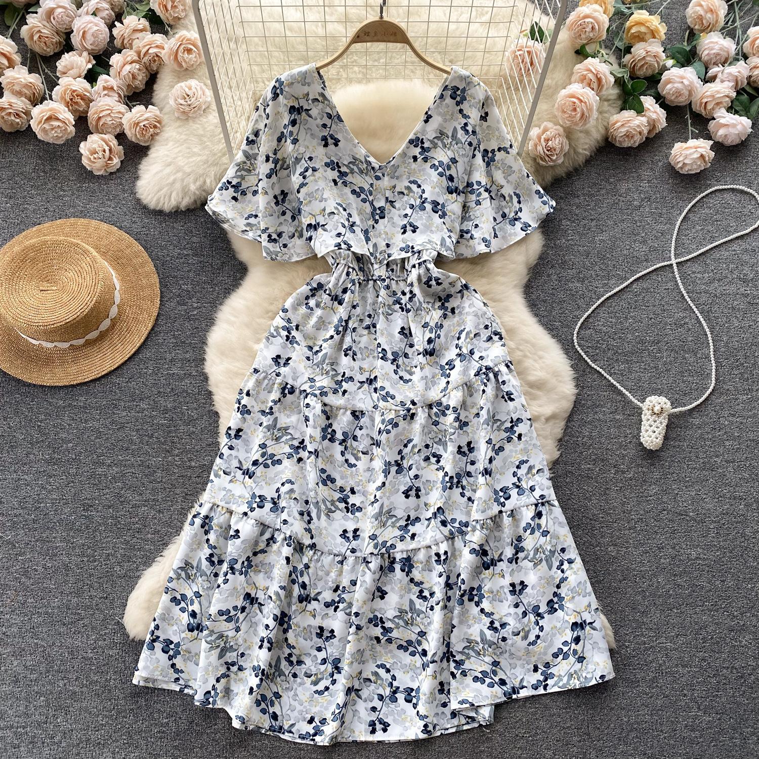 Vestido de verano de gasa con cuello francés, elegante y con volantes florales para mujer, con cintura adelgazante y corte de té.