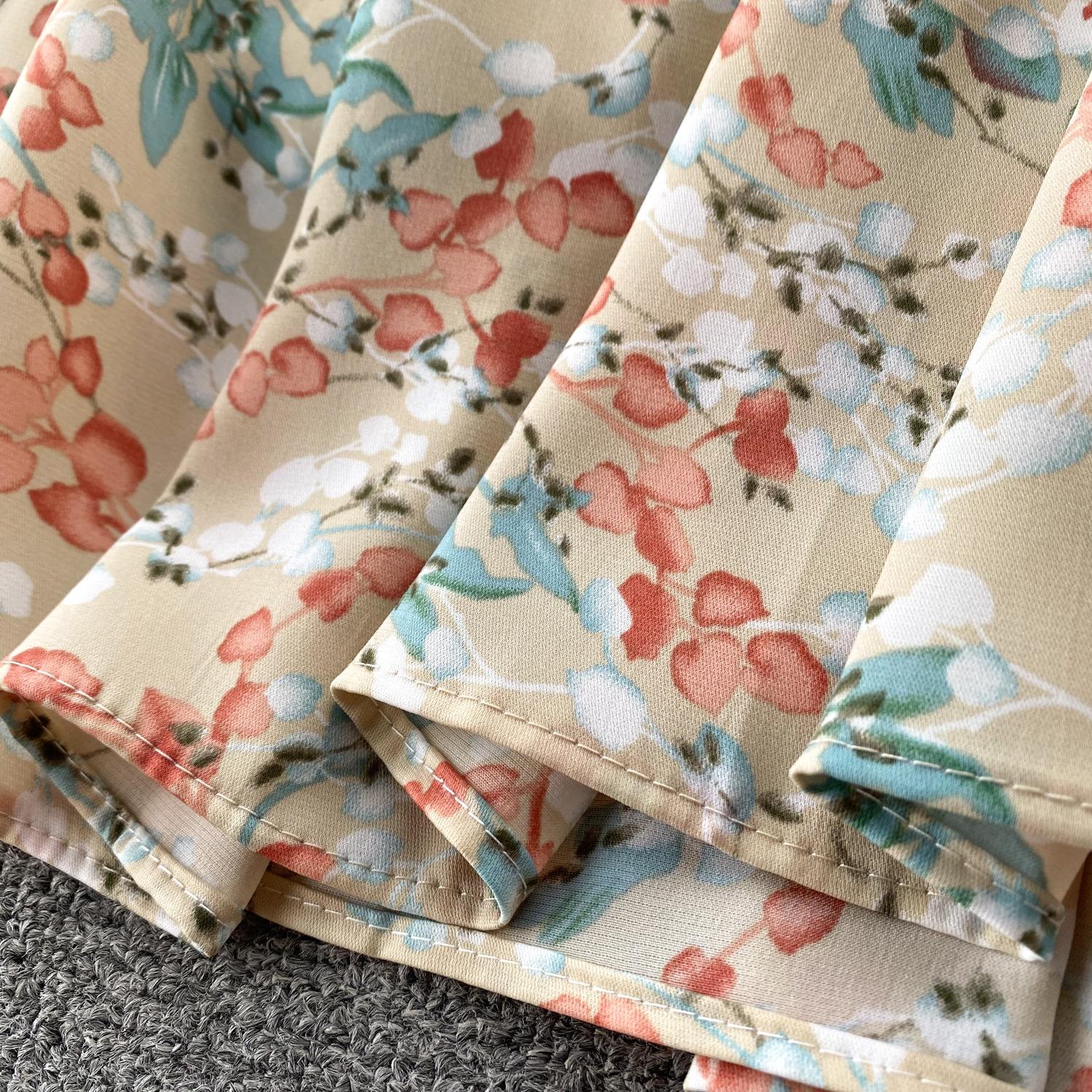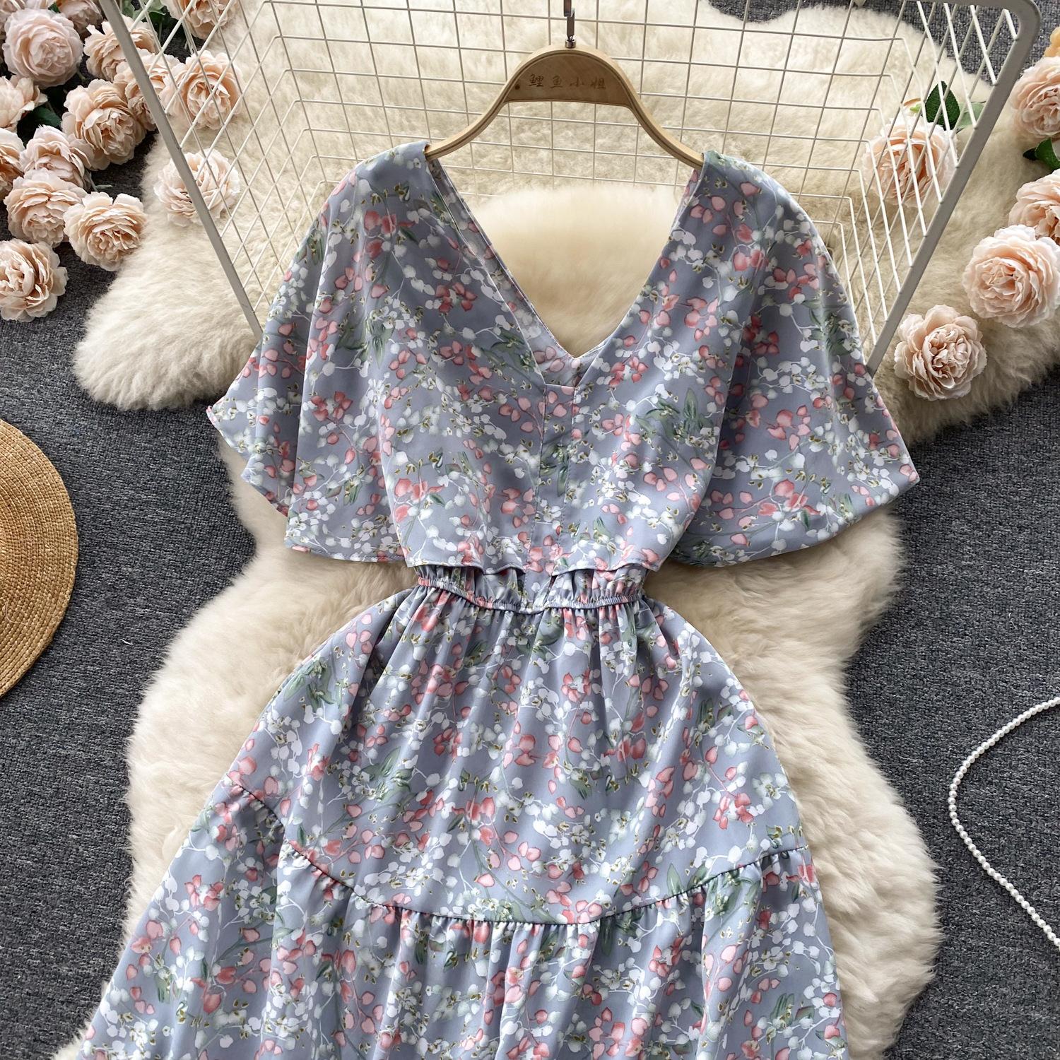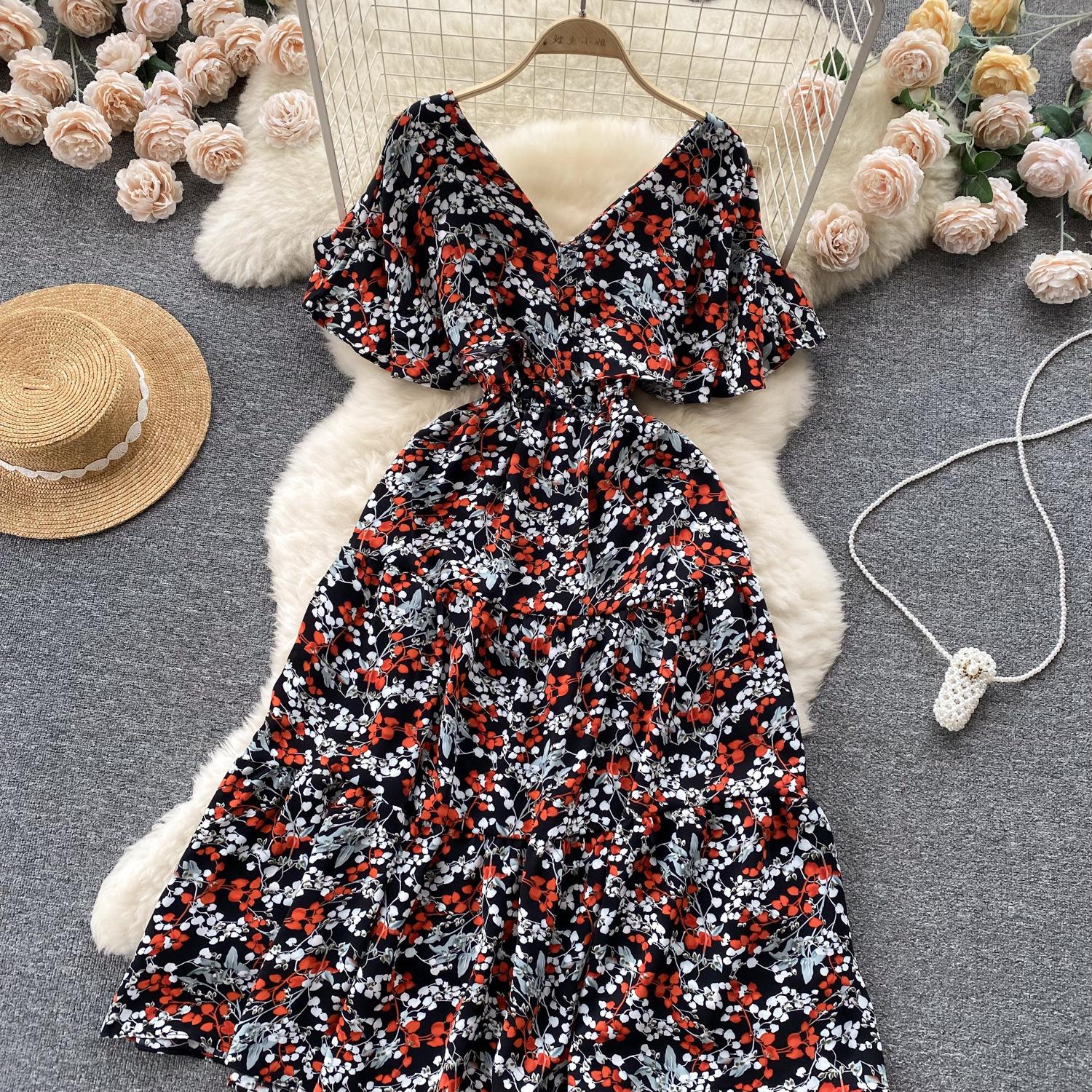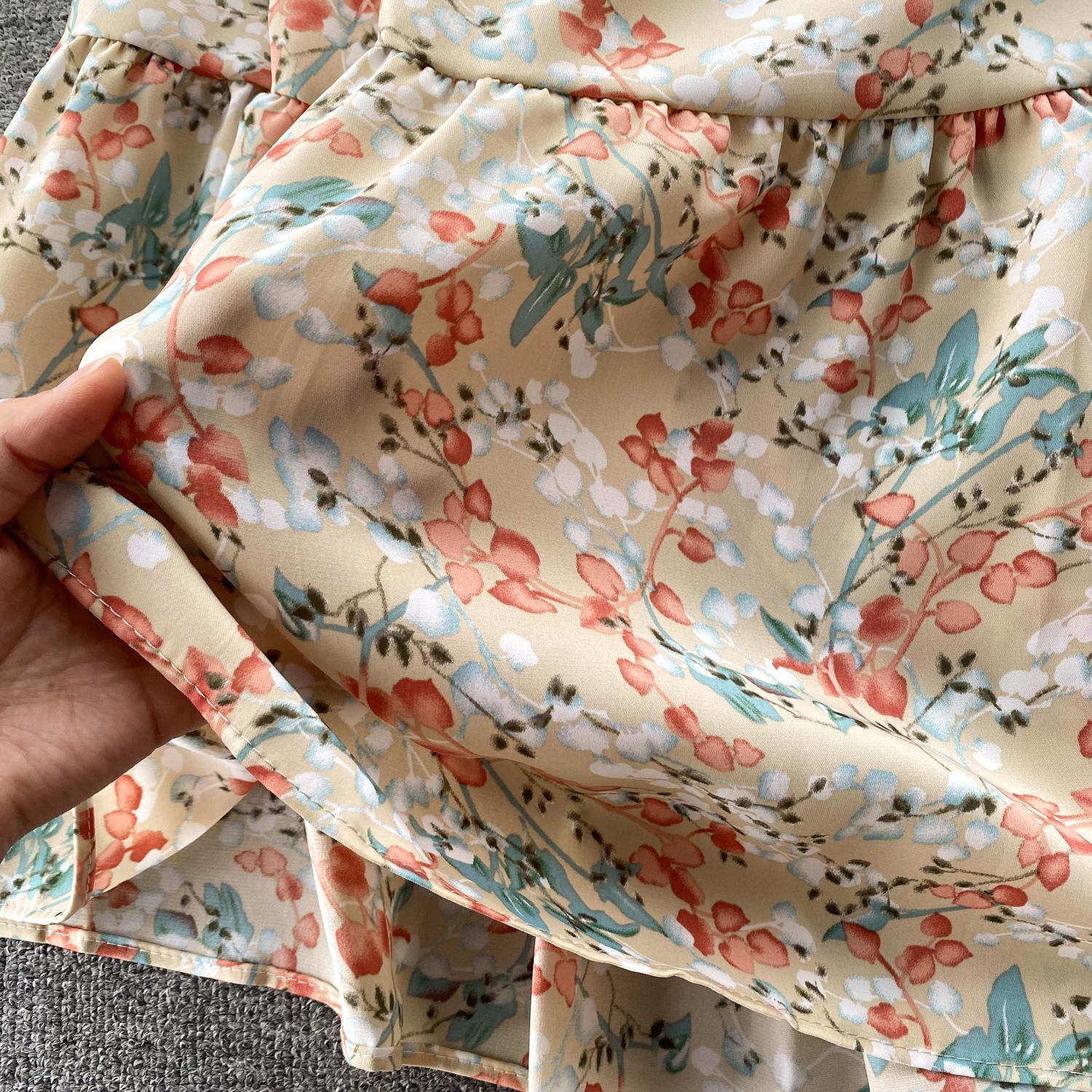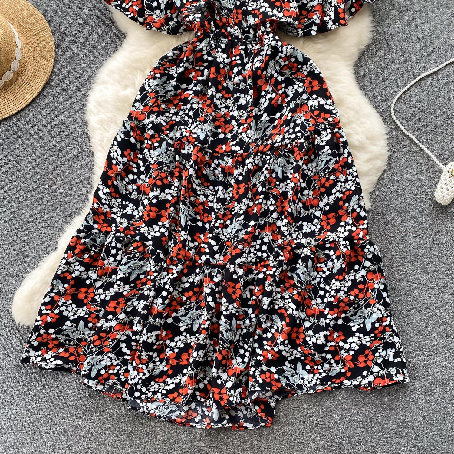 Vestido de verano de gasa con cuello francés, elegante y con volantes florales para mujer, con cintura adelgazante y corte de té.