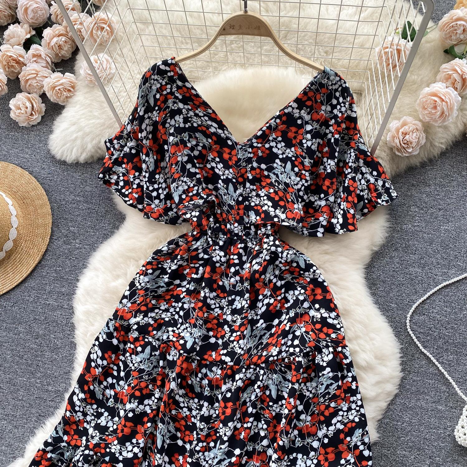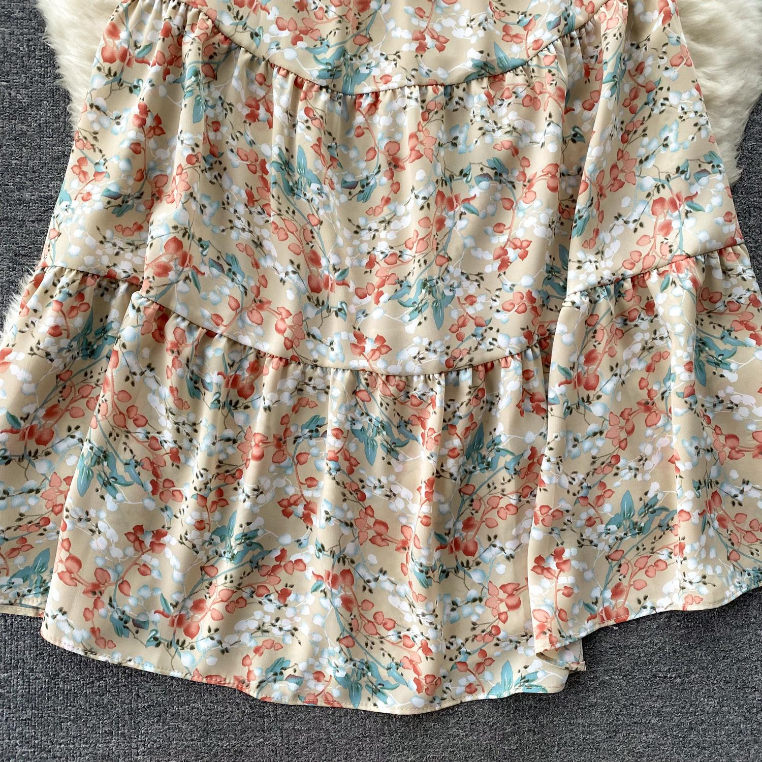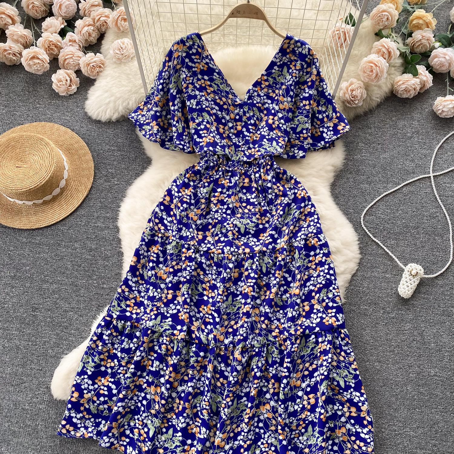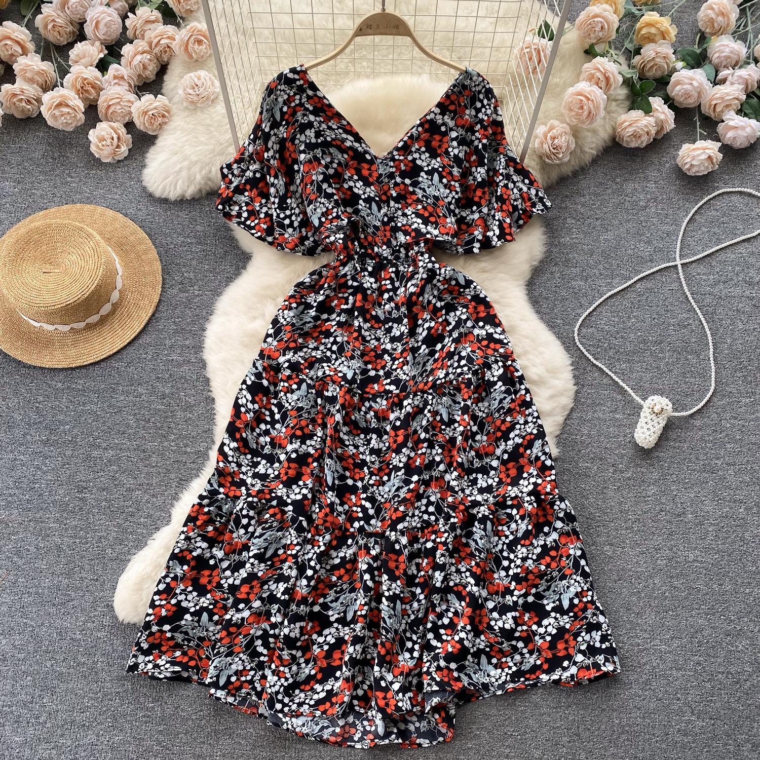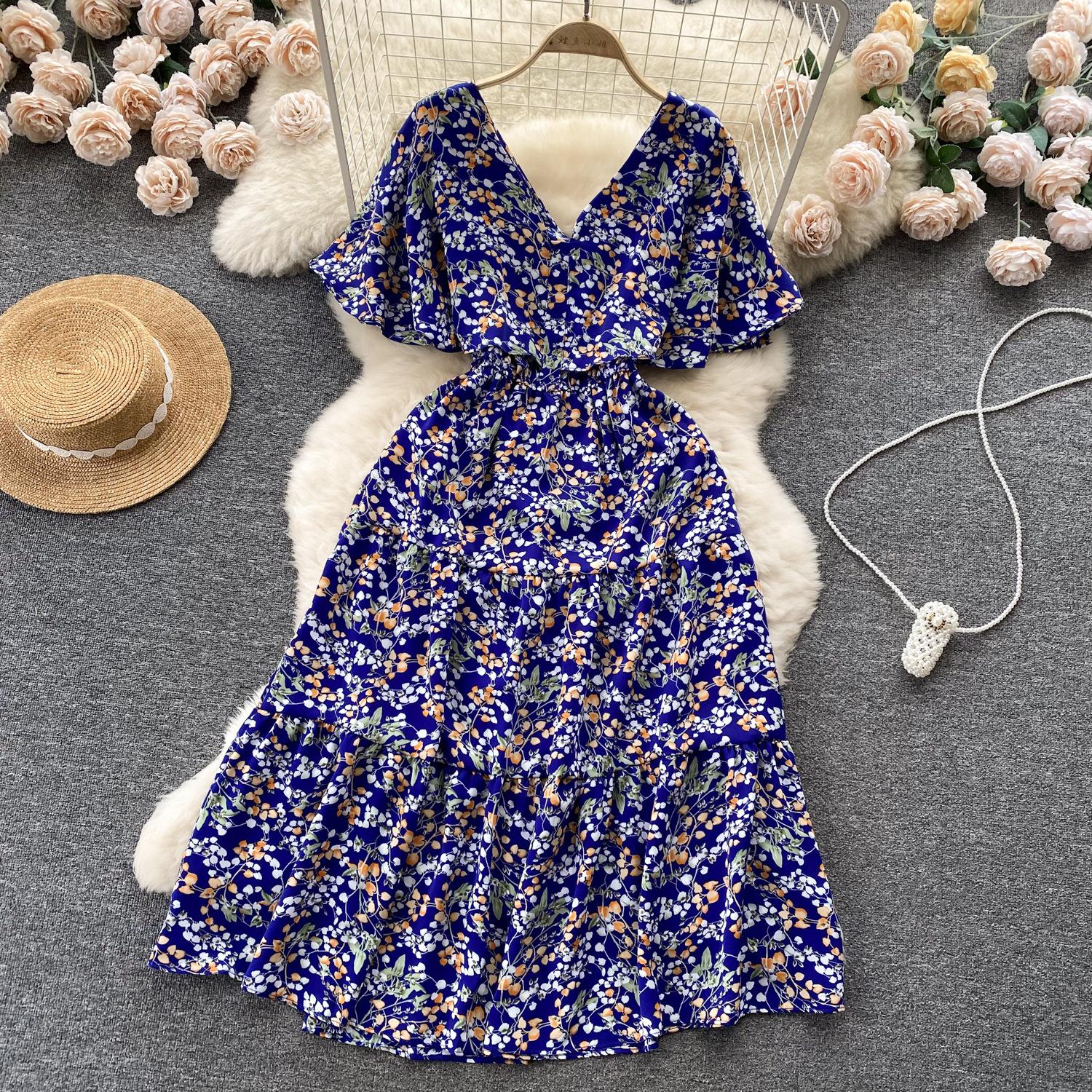 Vestido de verano de gasa con cuello francés, elegante y con volantes florales para mujer, con cintura adelgazante y corte de té.