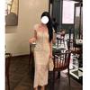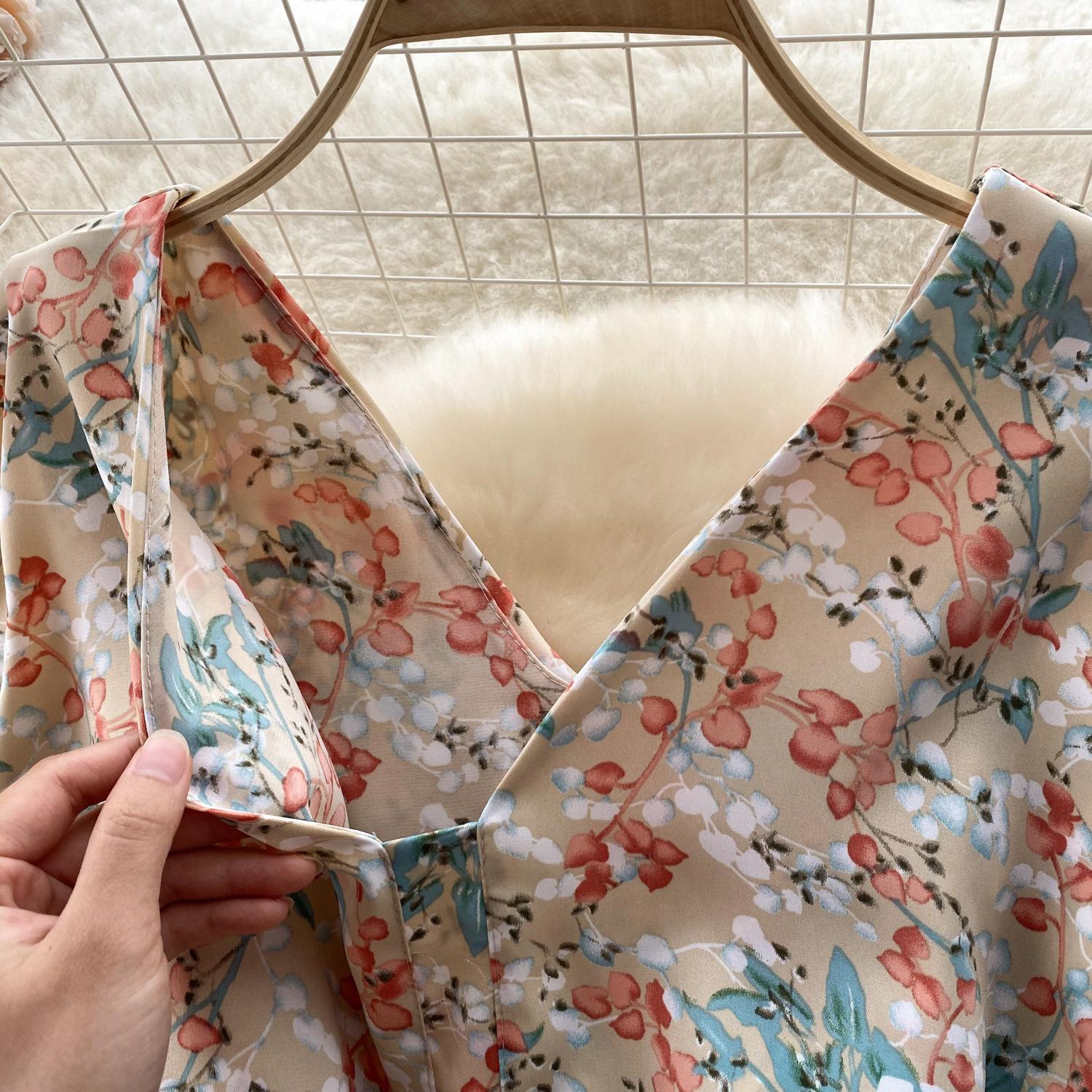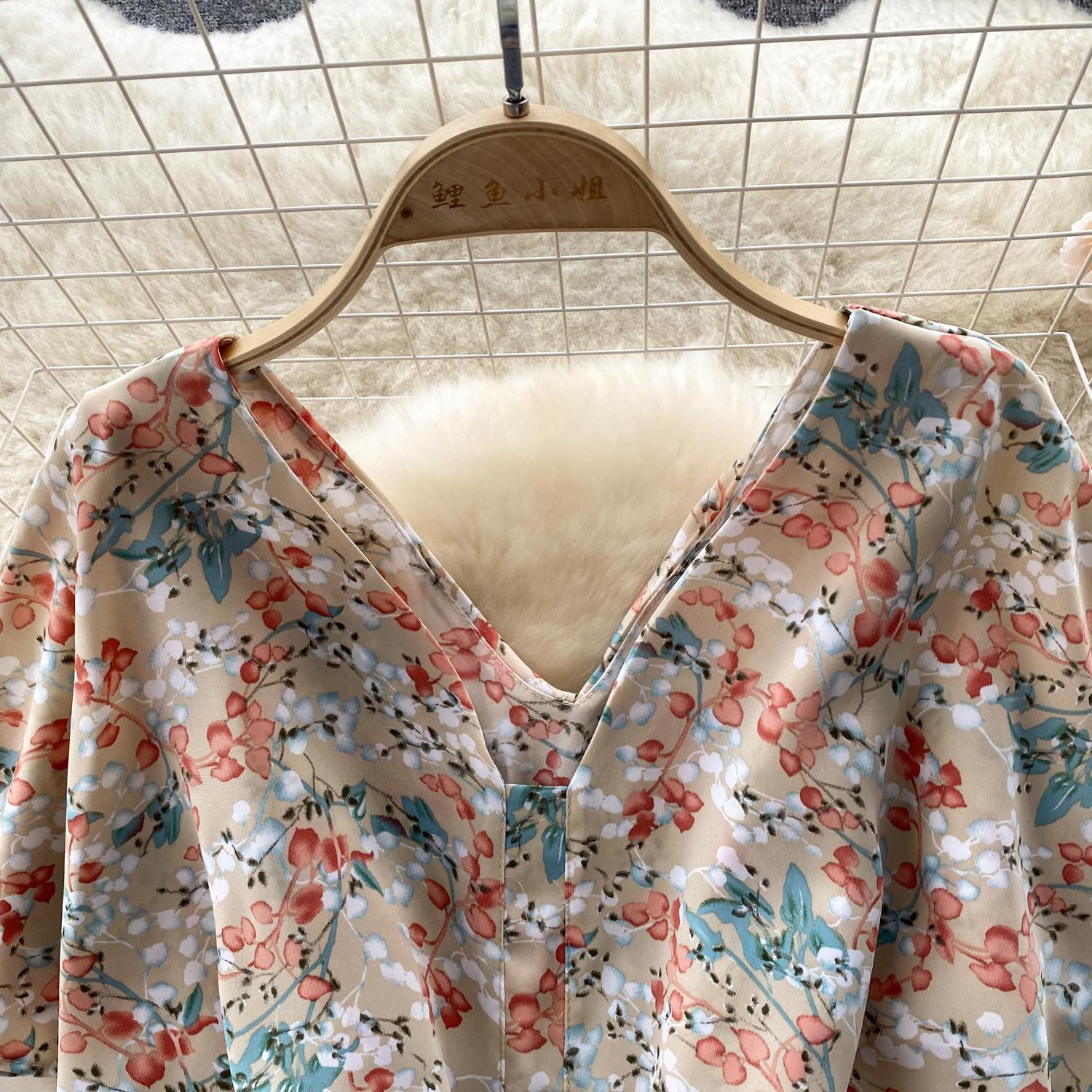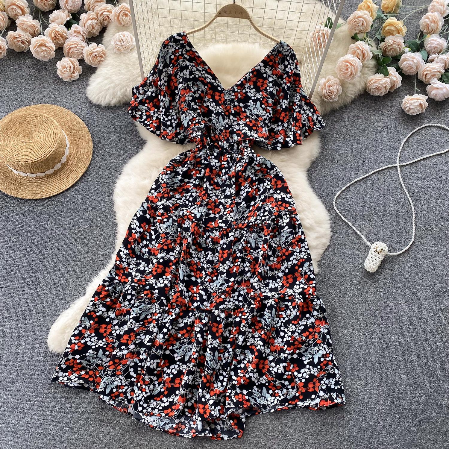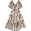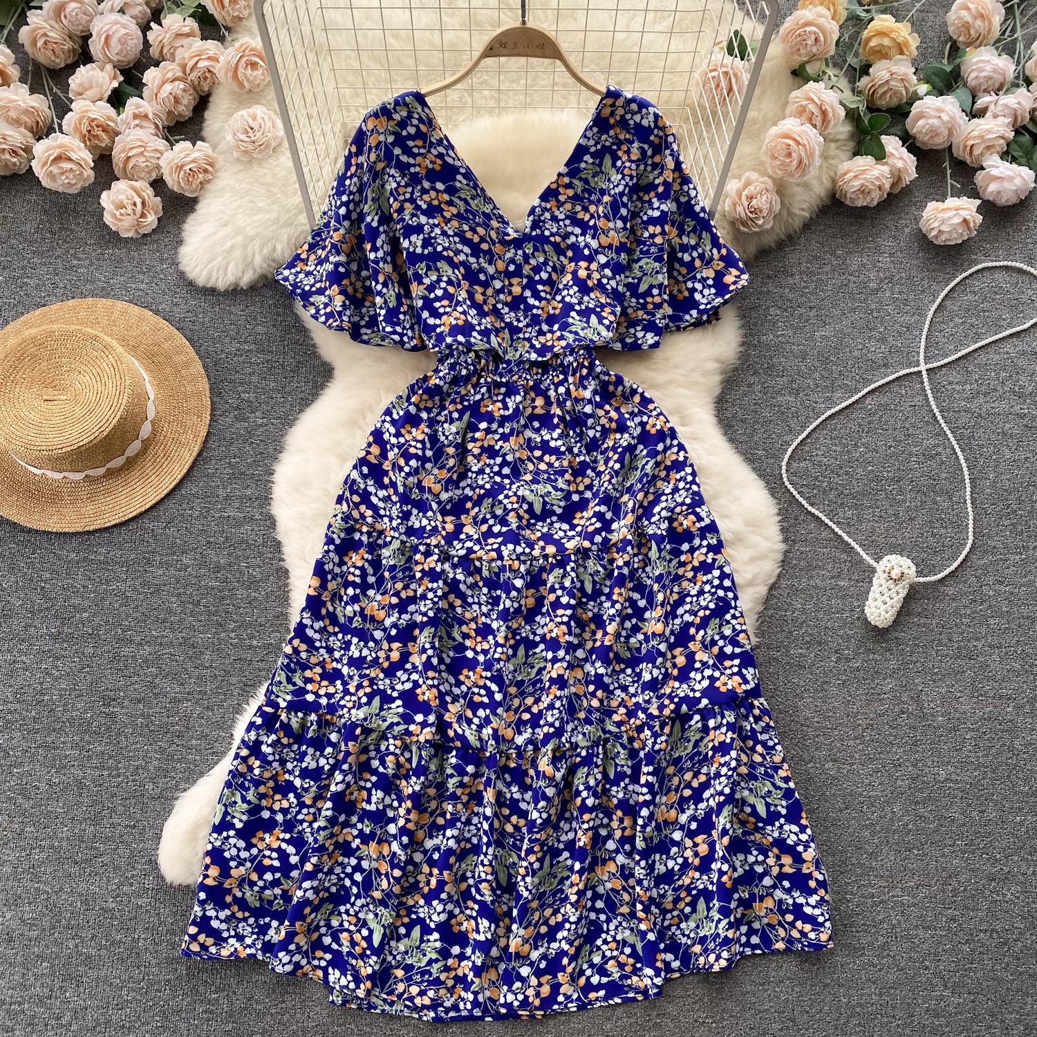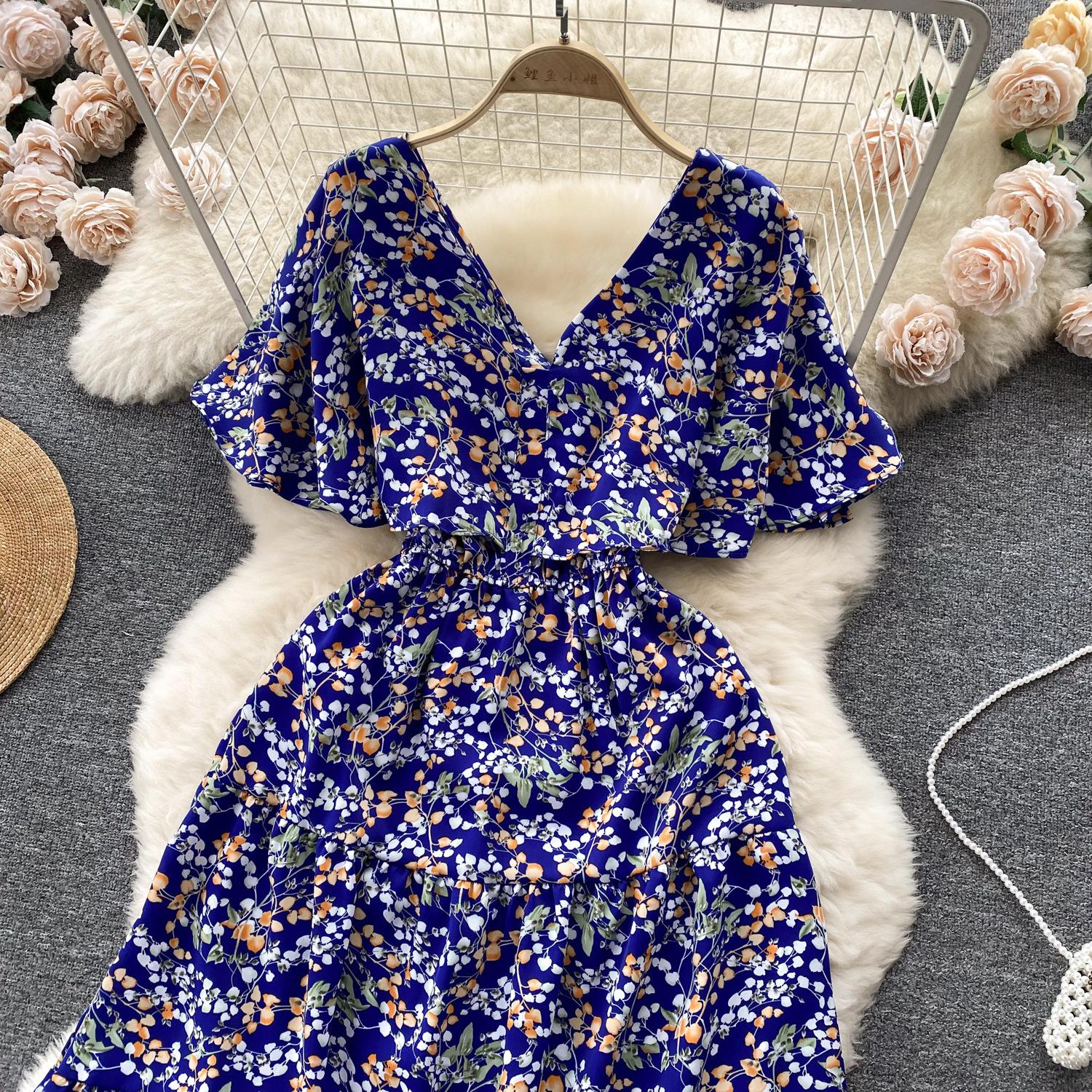 Vestido de verano de gasa con cuello francés, elegante y con volantes florales para mujer, con cintura adelgazante y corte de té.