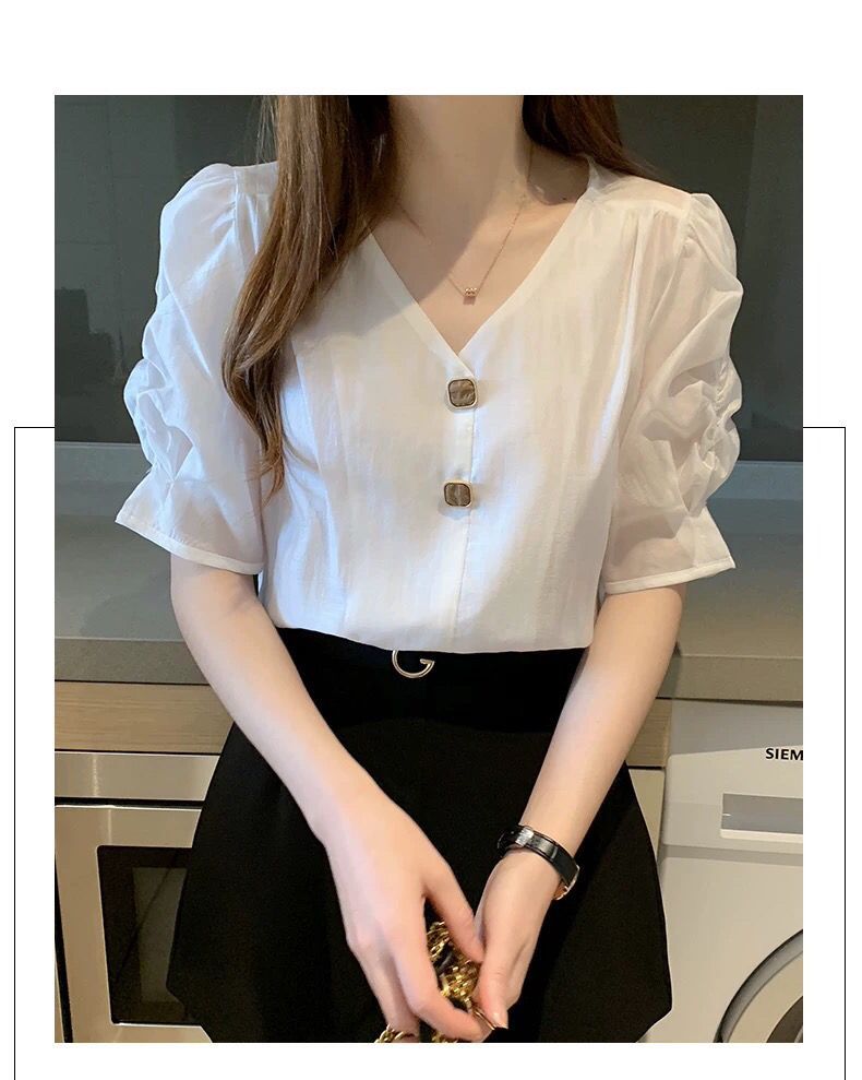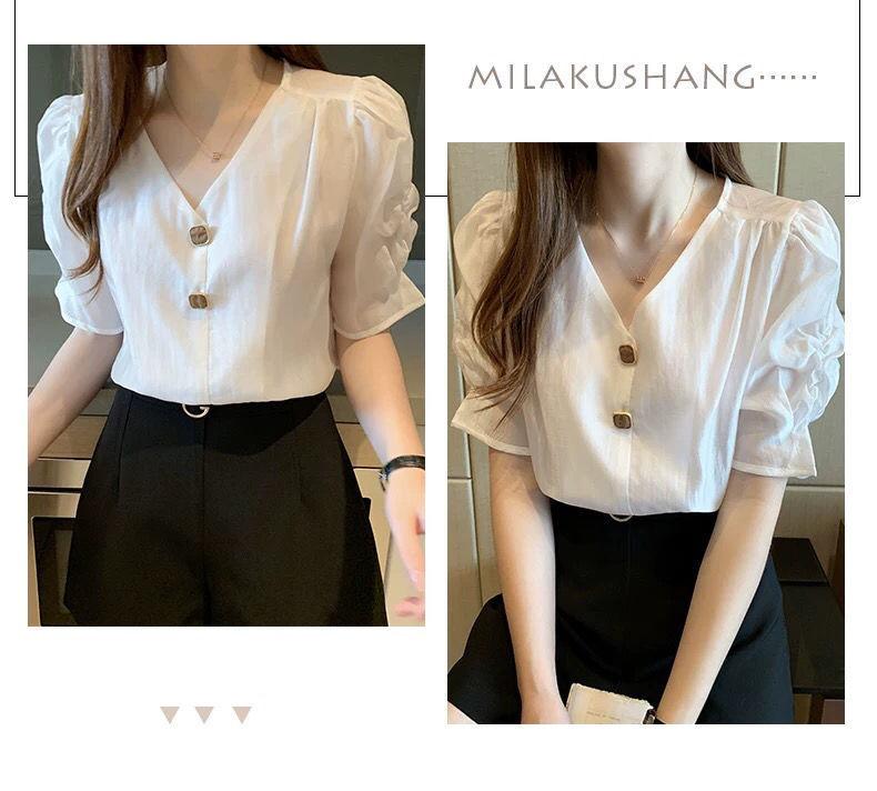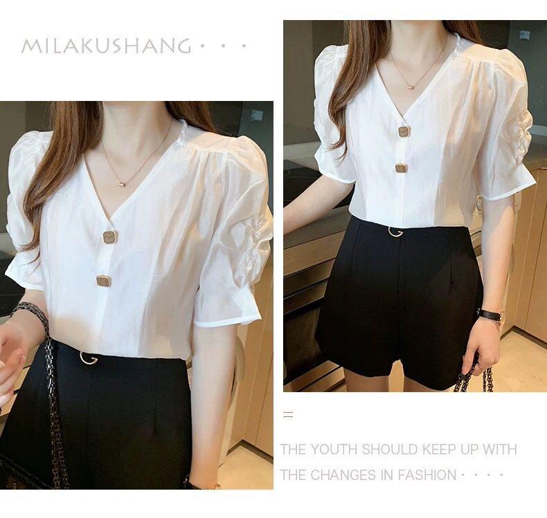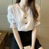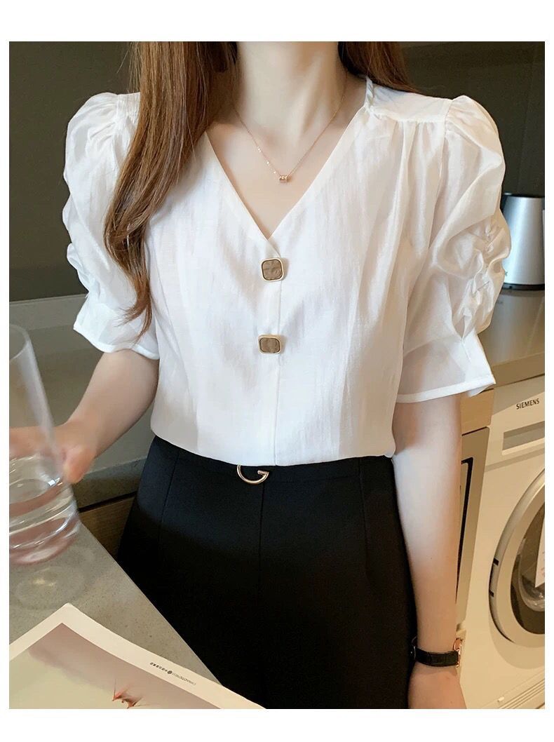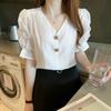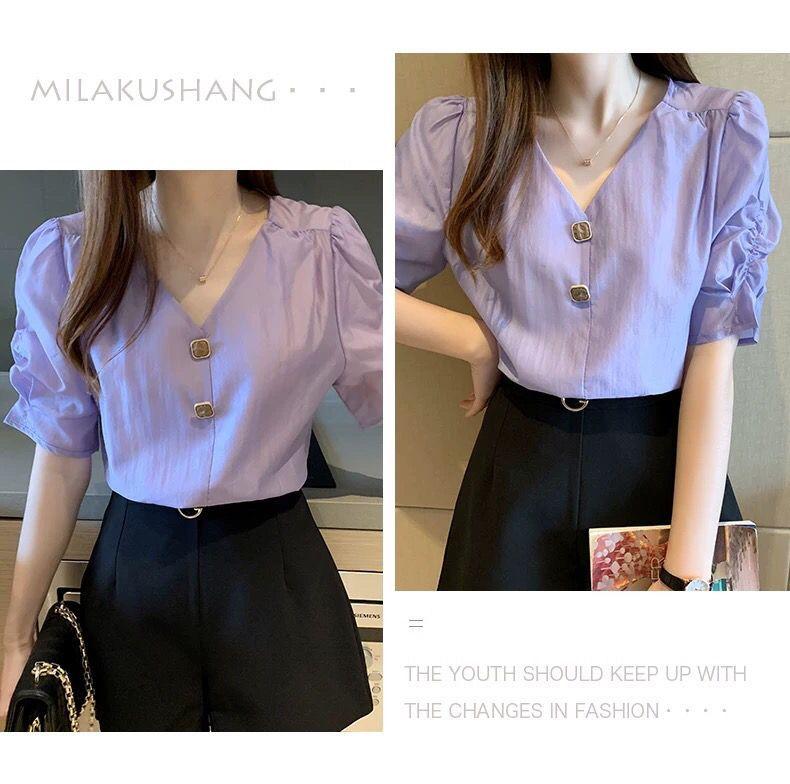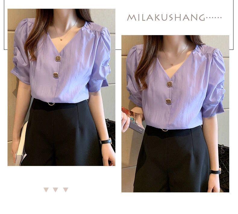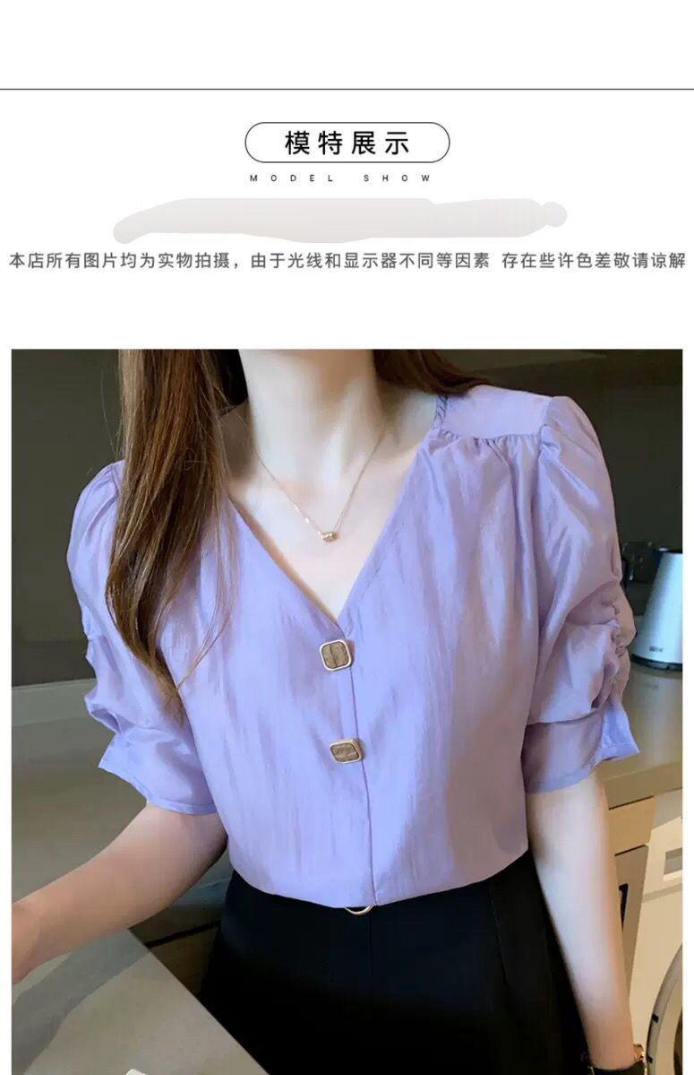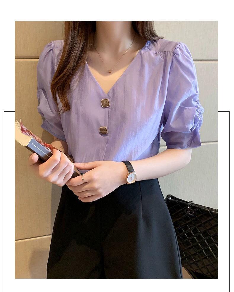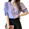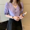 Camisa de gasa para mujer, de manga corta, estilo coreano, holgada, con escote en V y mangas abullonadas, color morado, para verano