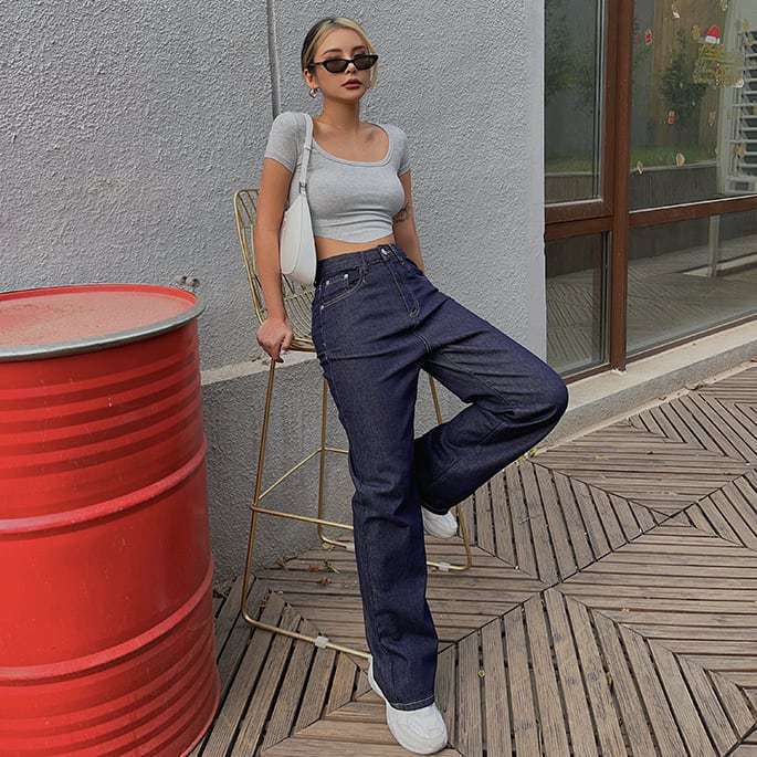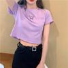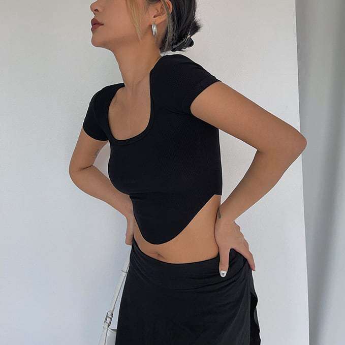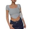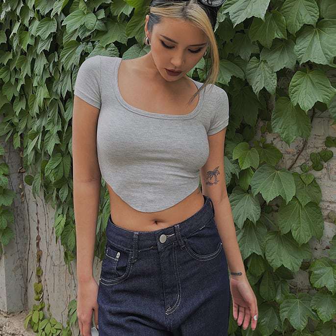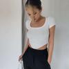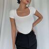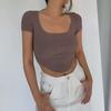 Verano 2023 color sólido verano nuevo camiseta de manga corta con cuello cuadrado para mujer versátil ombliguera top ajustado procesamiento de mercancía de cola