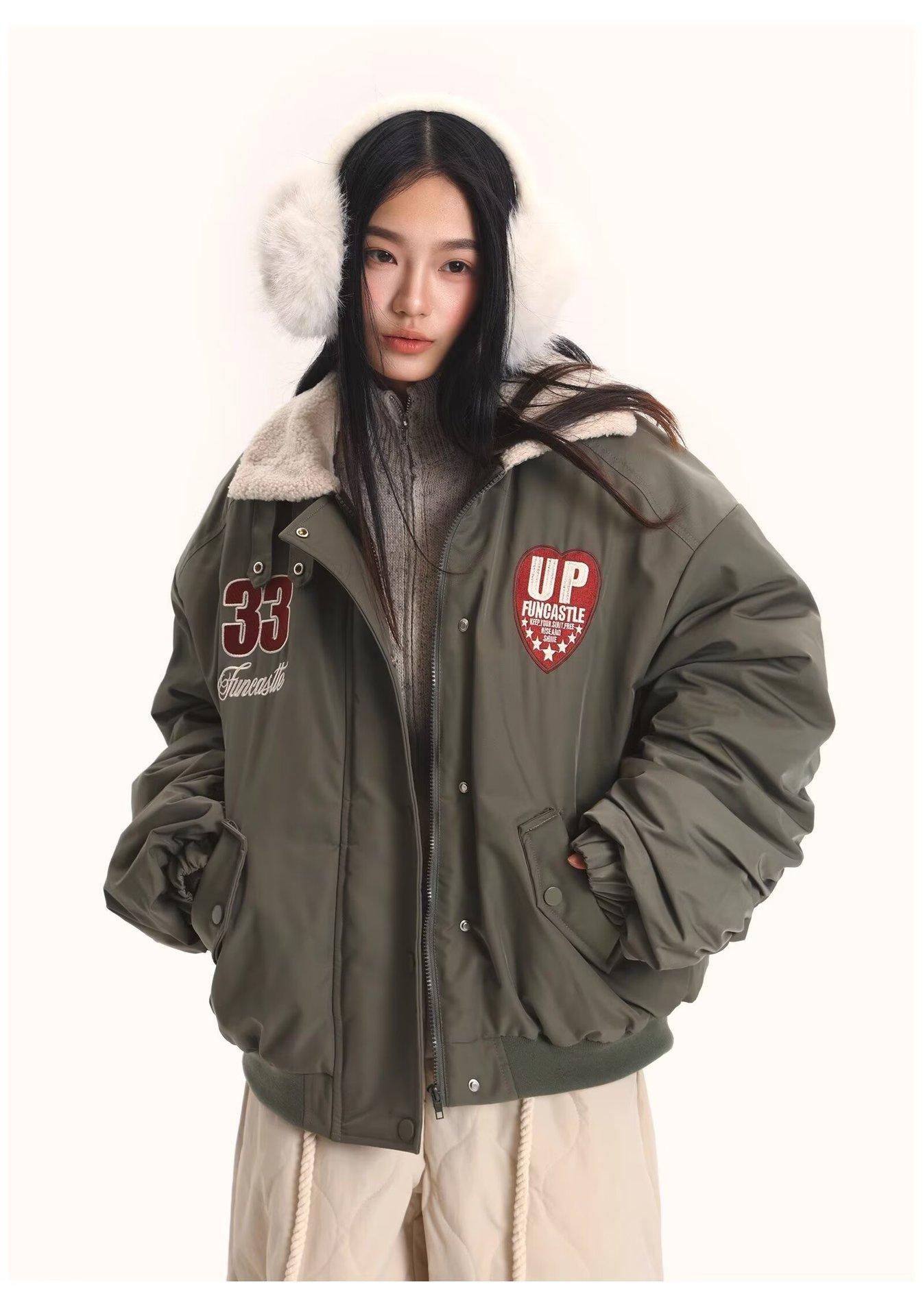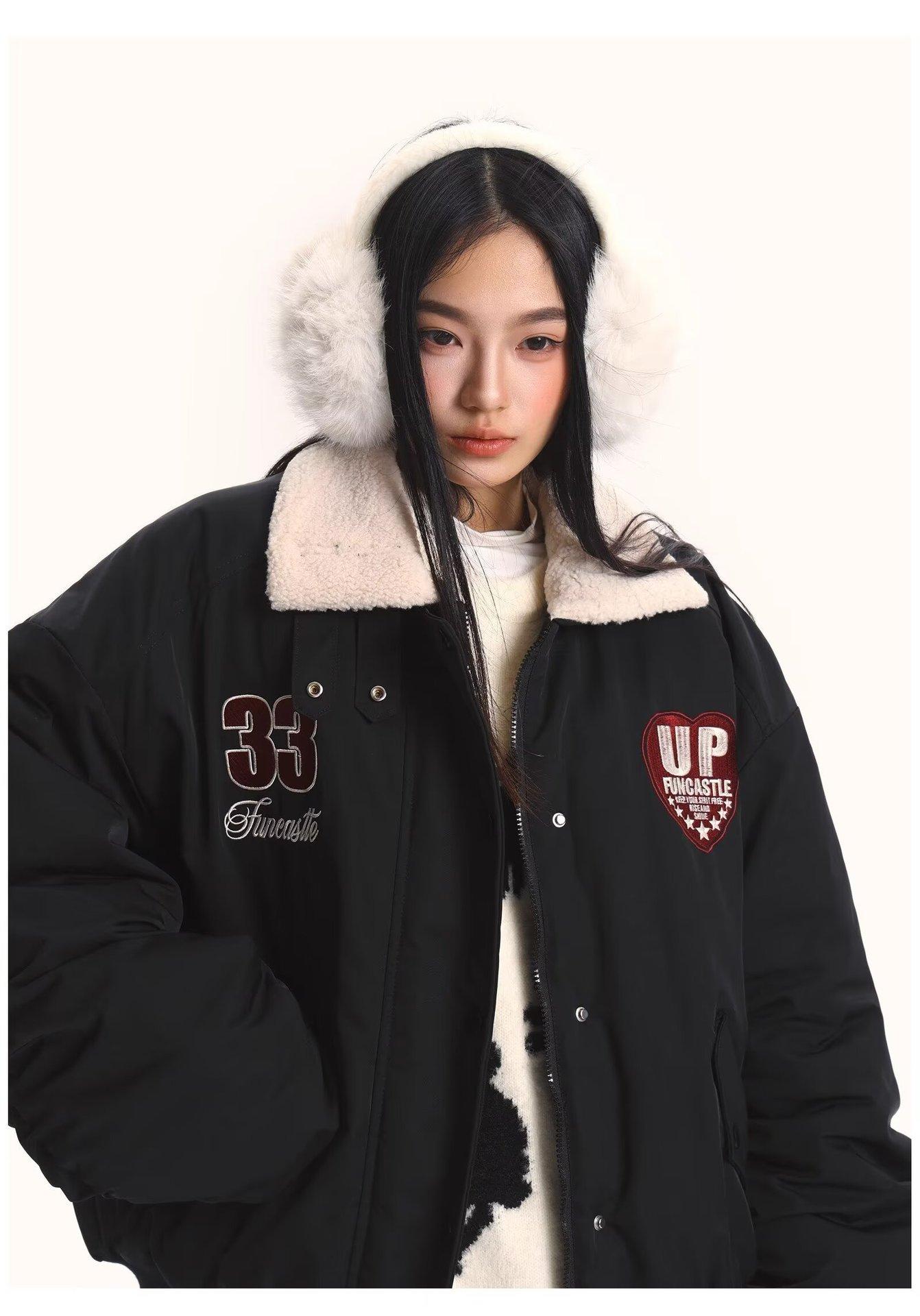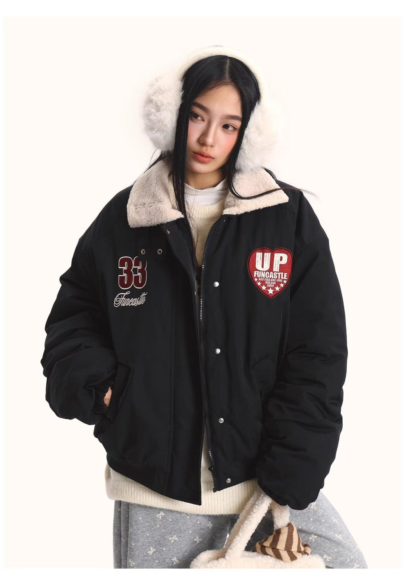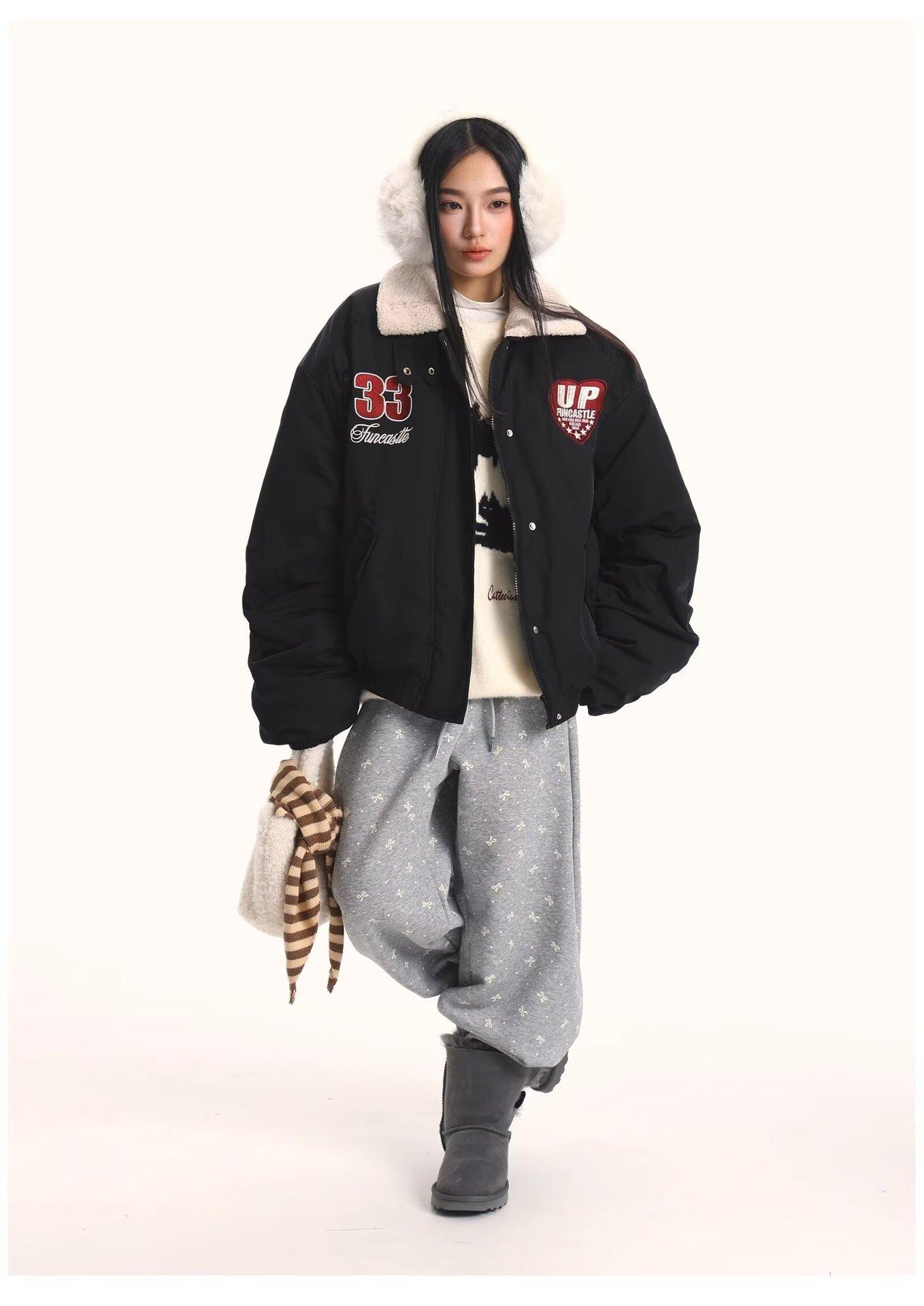 Traje de béisbol vintage de invierno 2024 para mujer, acolchado de algodón, con solapa de lana de cordero, holgado, combinable con bordado de letras