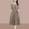 Vestido vintage de algodón y lino de manga corta para mujer, estilo artístico, con cordones, cintura adelgazante, color liso, largo medio, novedad de verano de 2023.