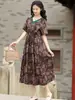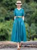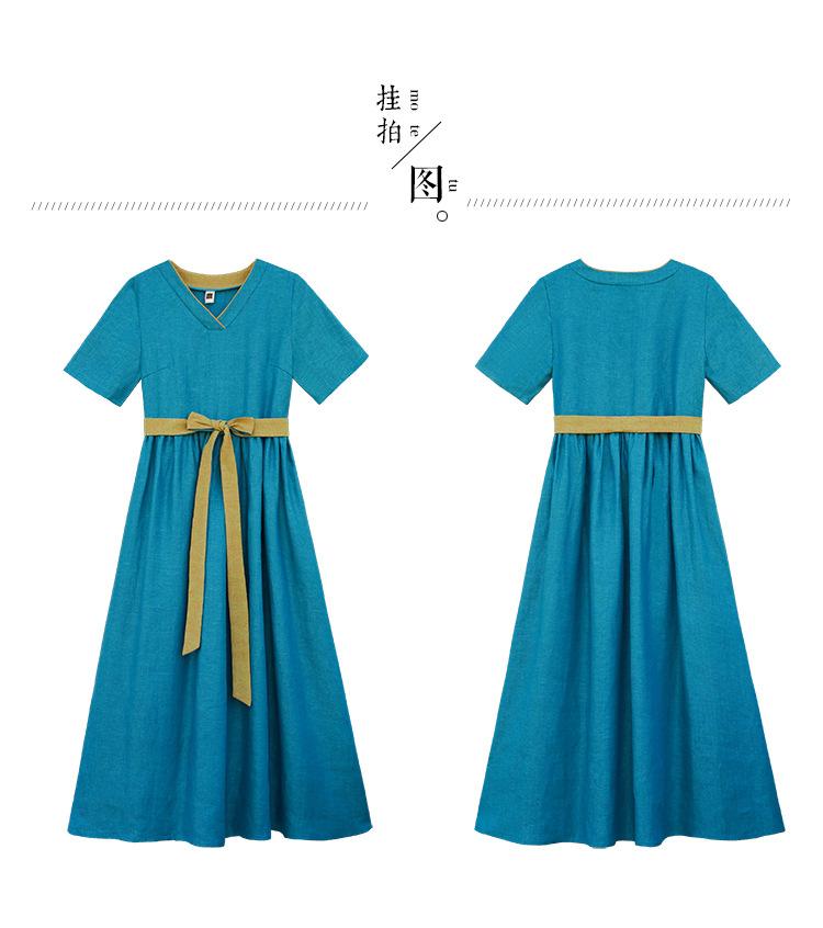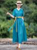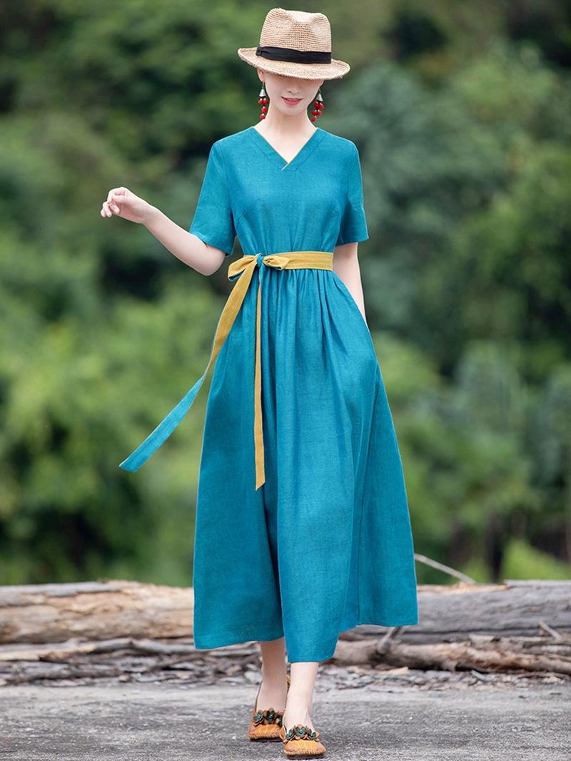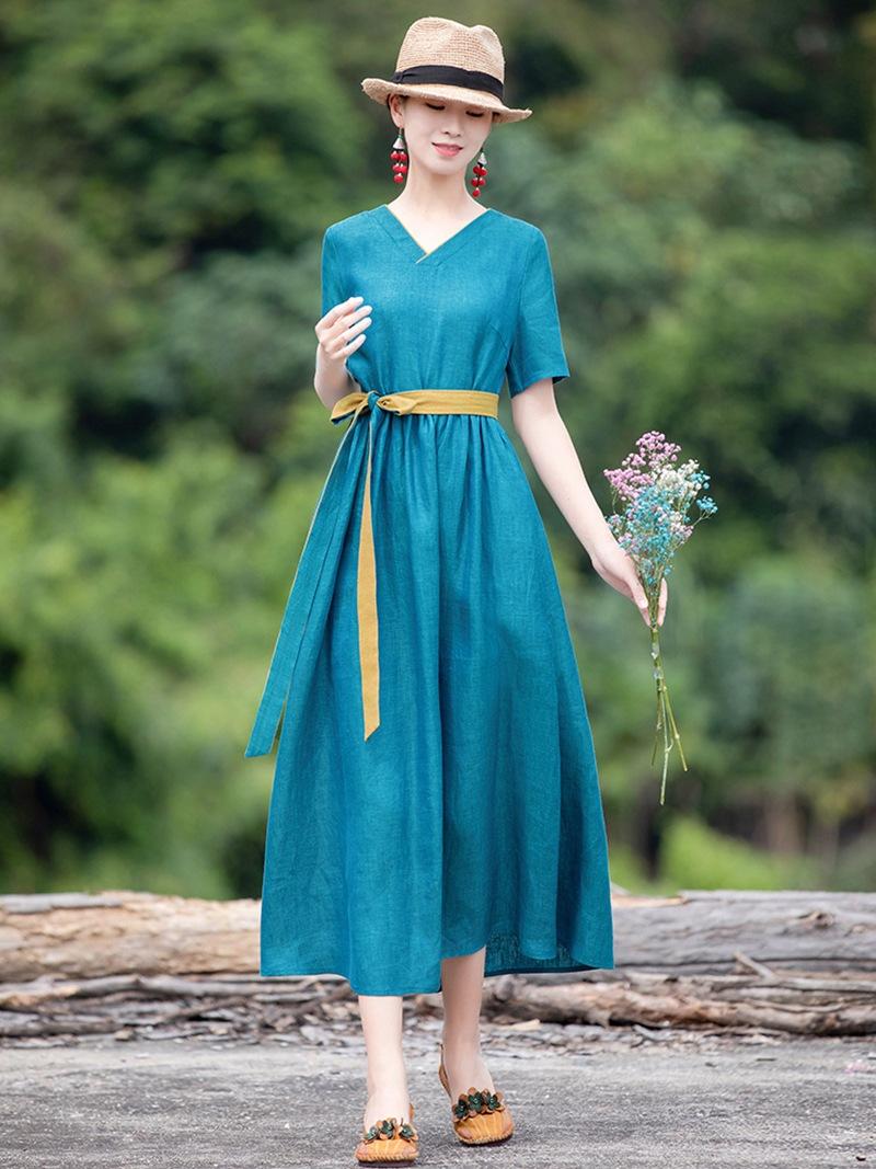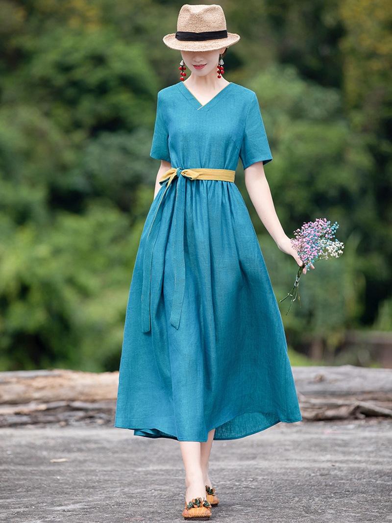 Vestido étnico de algodón y lino con cuello en V y manga corta, novedad de verano 2023, suelto, artístico, adelgazante, con cordones, color liso.