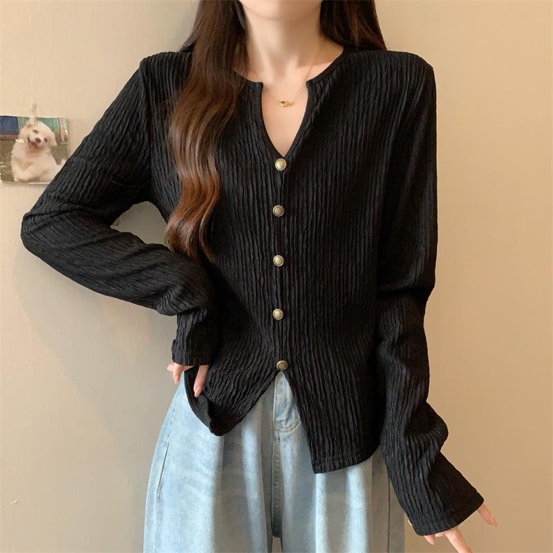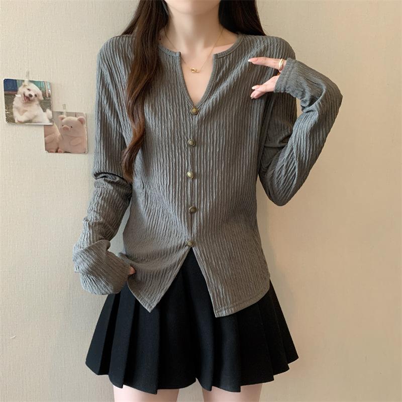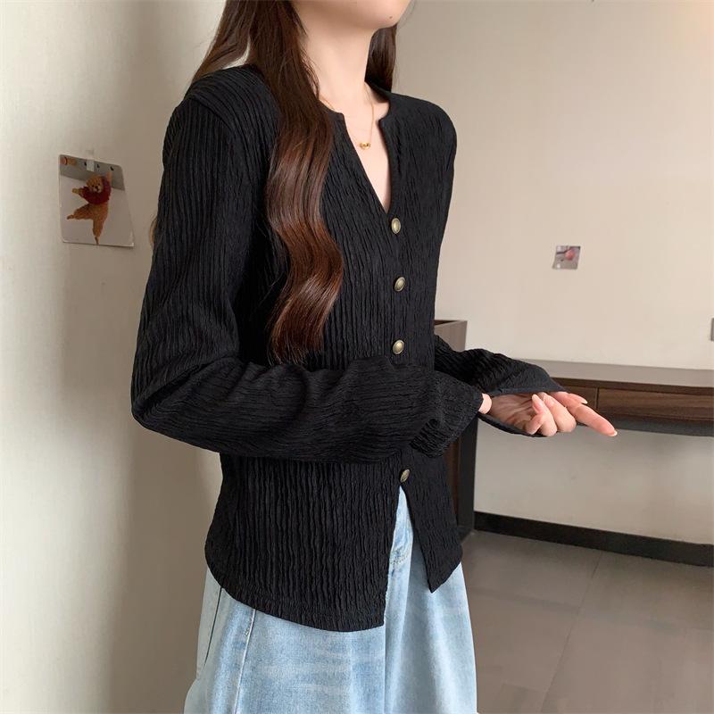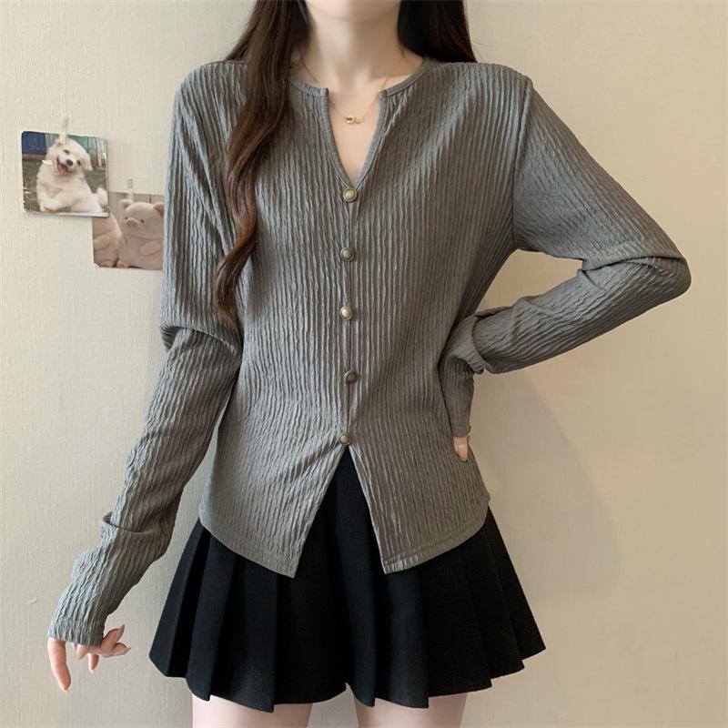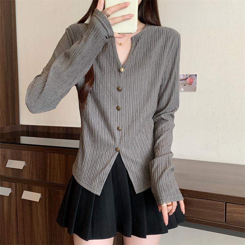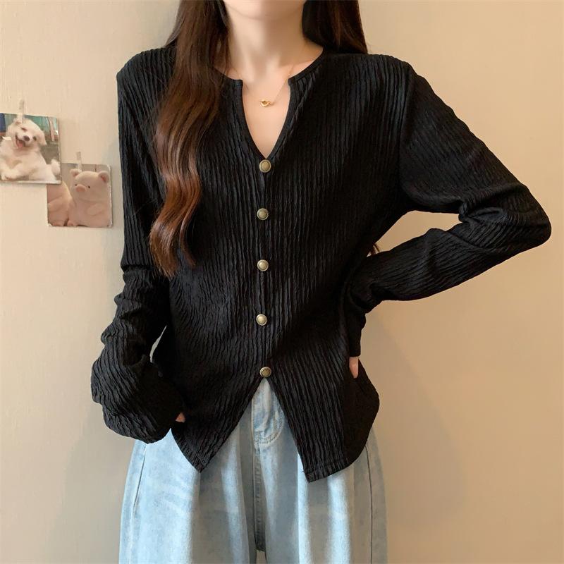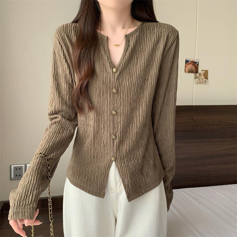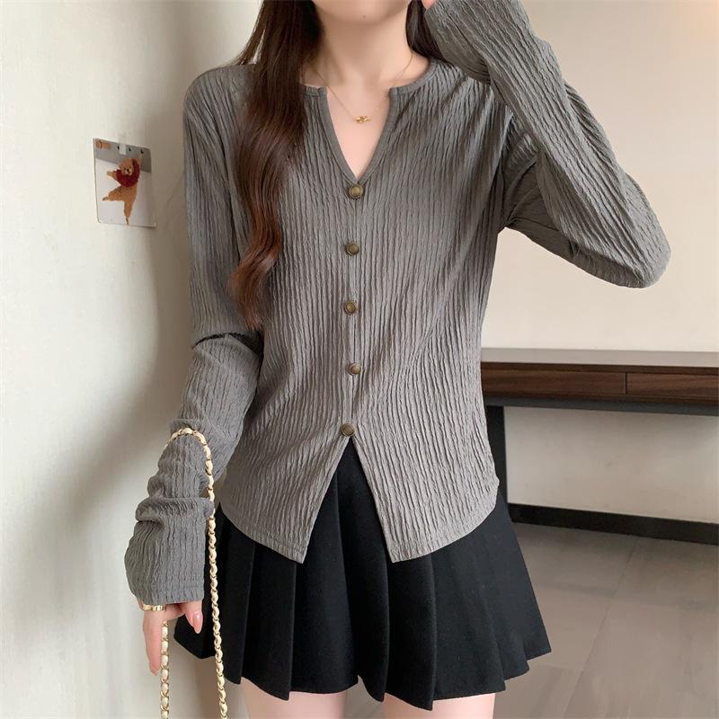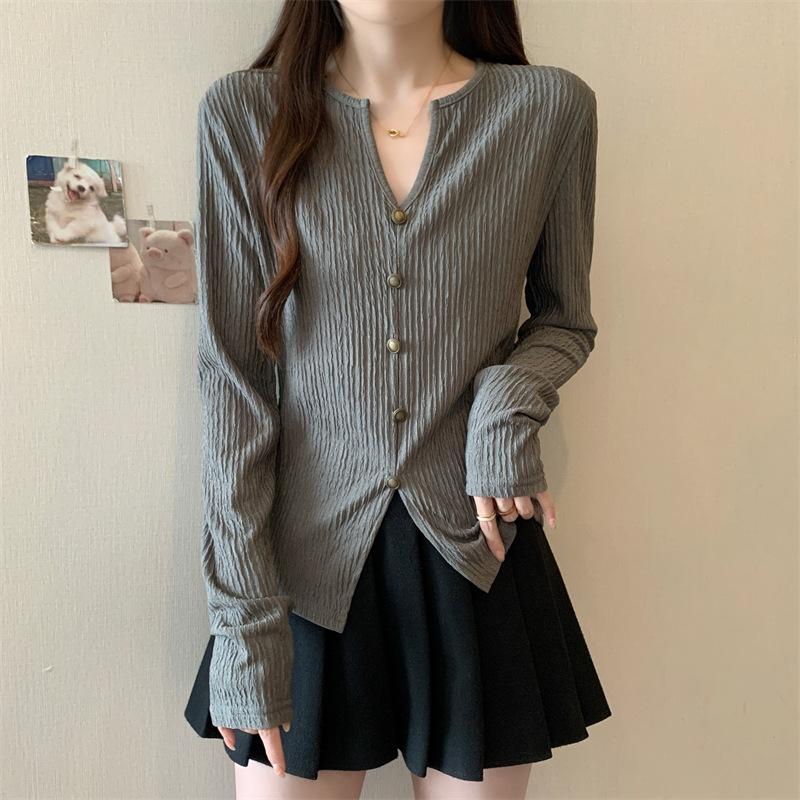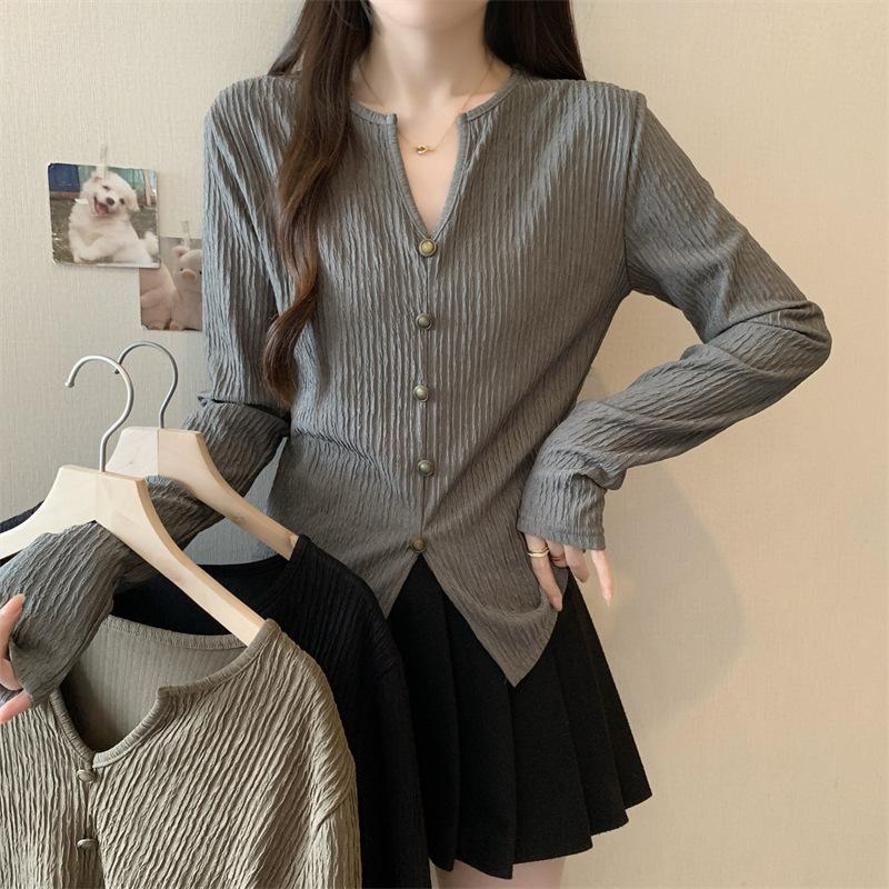 Foto Real de Nueva Camiseta de Otoño 2025 de Cuello en V y Manga Larga para Mujer, Diseño Nicho, Camiseta Versátil, Top Adelgazante para Mujer
