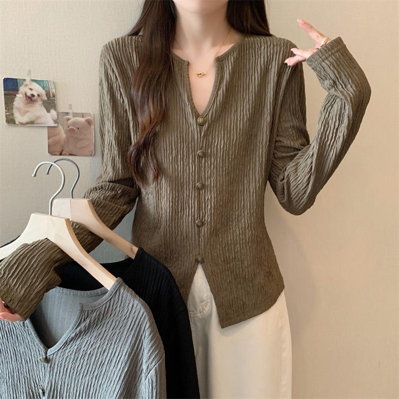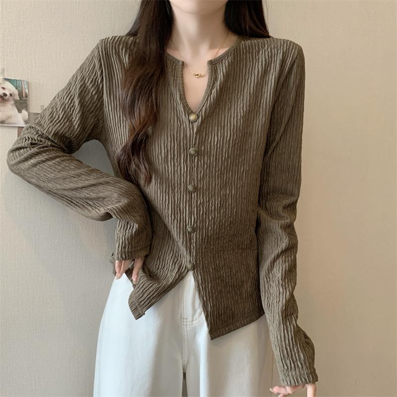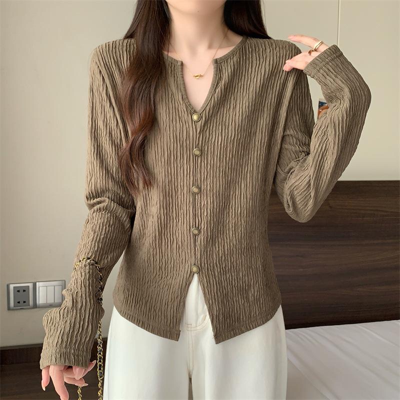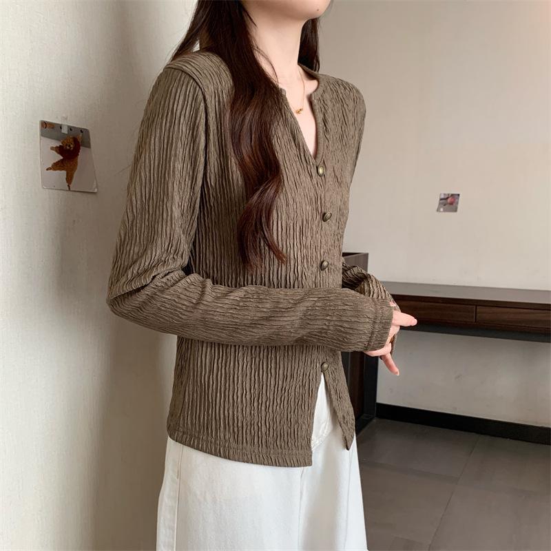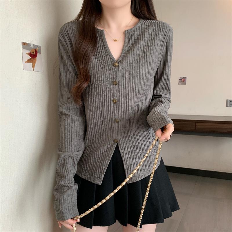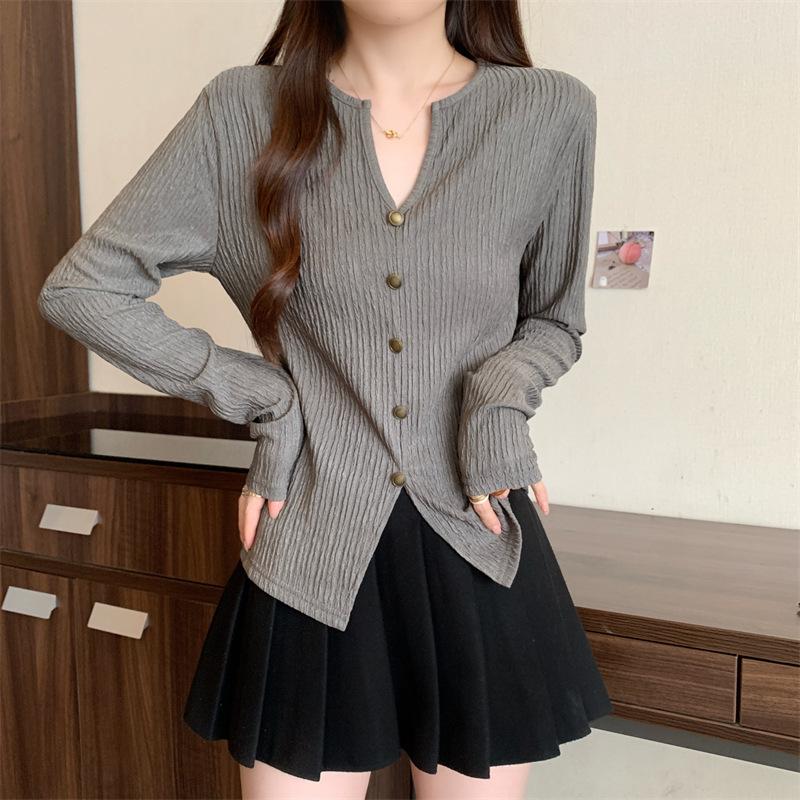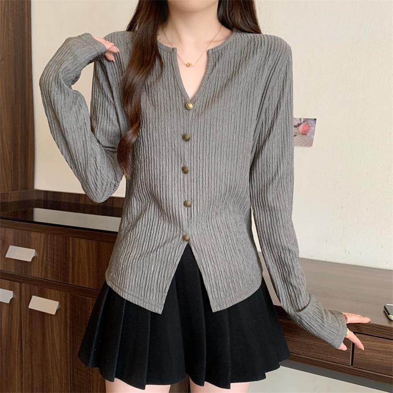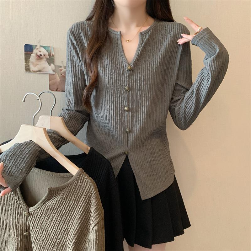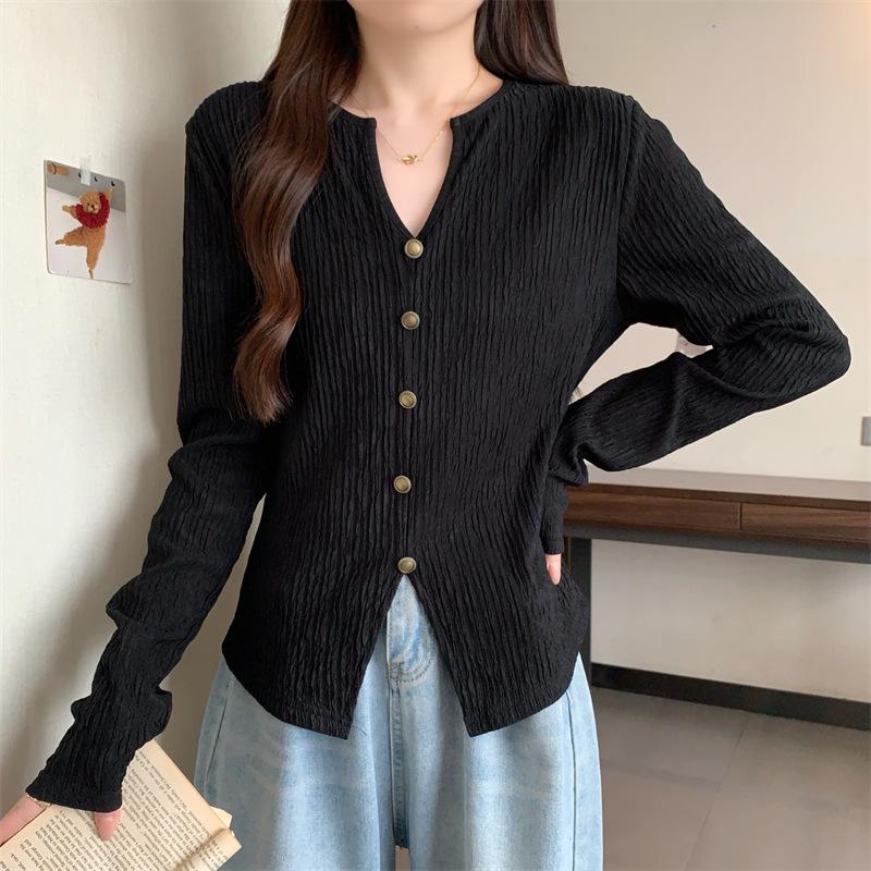 Foto Real de Nueva Camiseta de Otoño 2025 de Cuello en V y Manga Larga para Mujer, Diseño Nicho, Camiseta Versátil, Top Adelgazante para Mujer