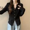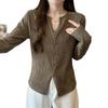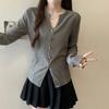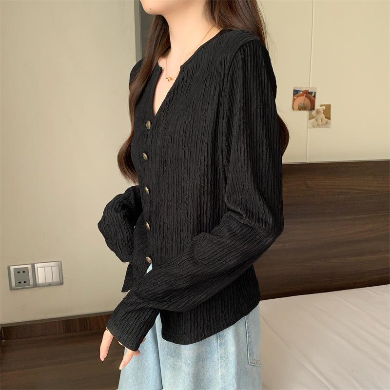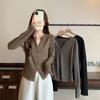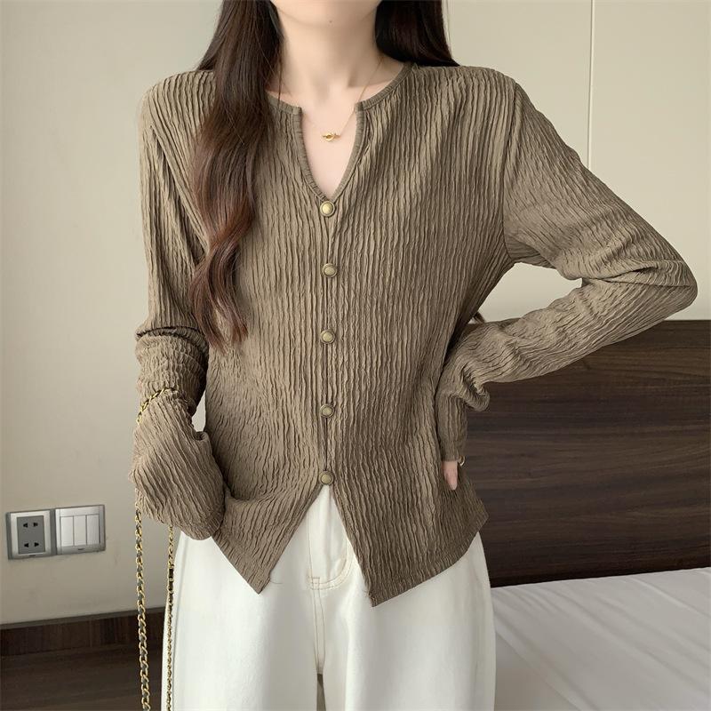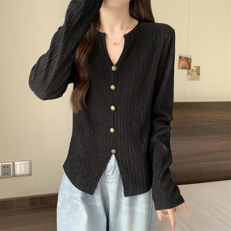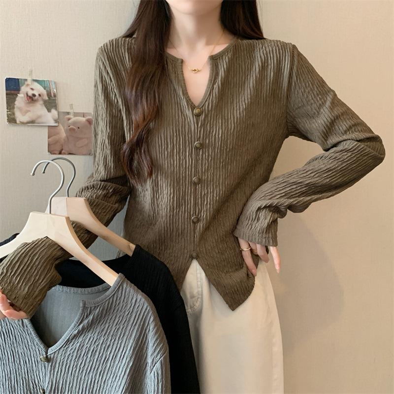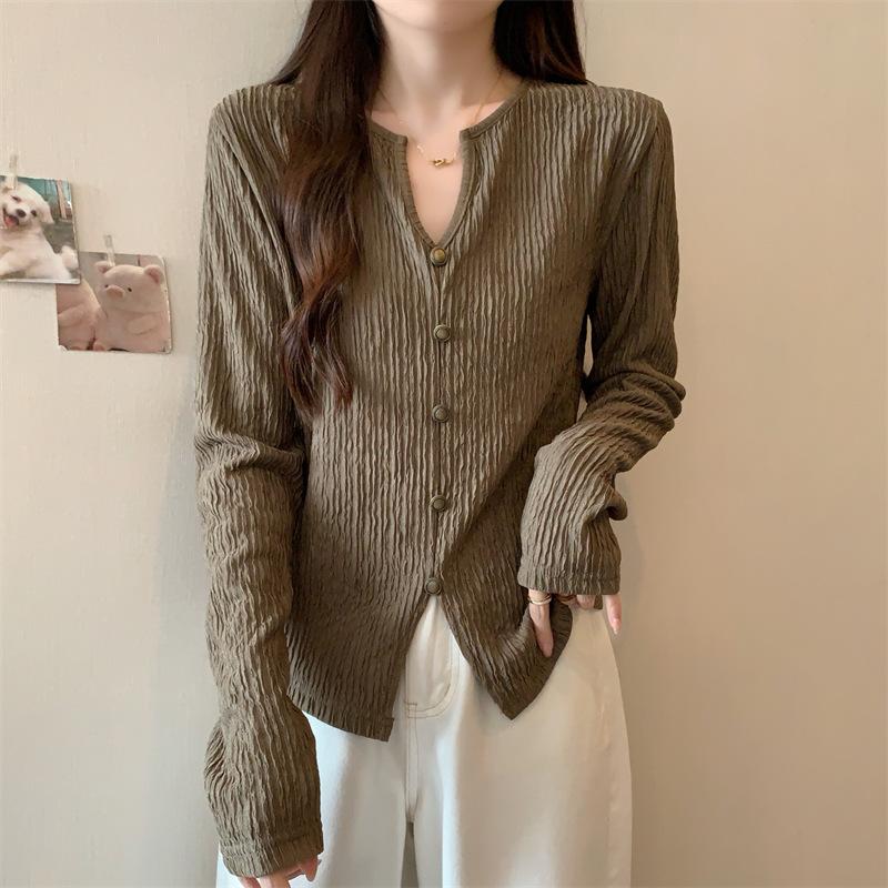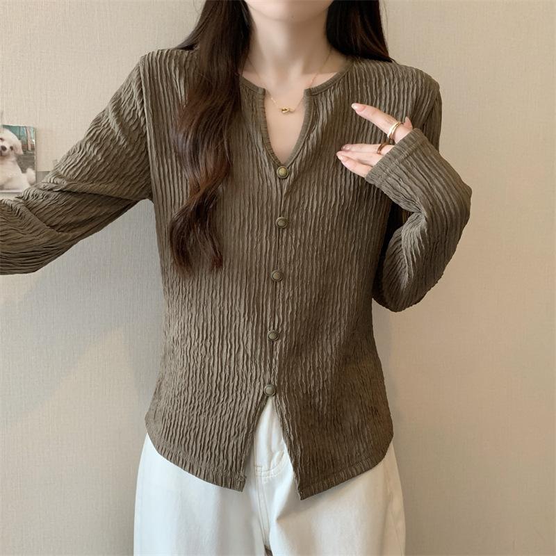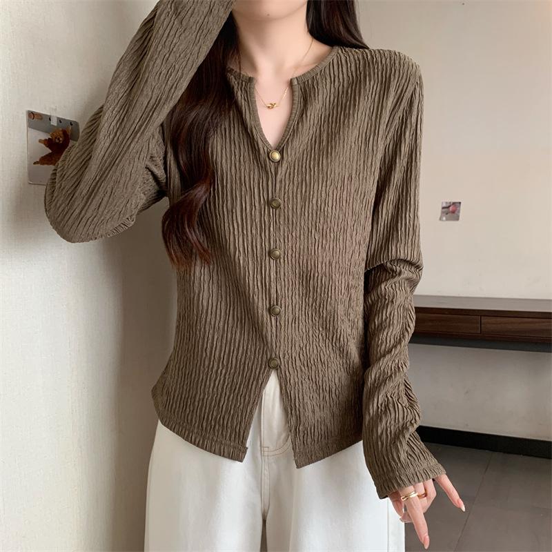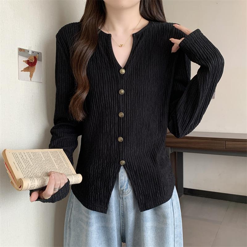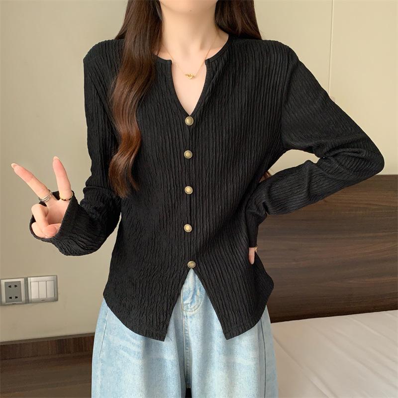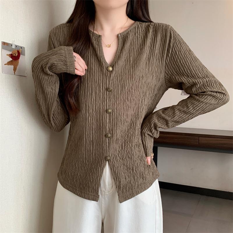 Foto Real de Nueva Camiseta de Otoño 2025 de Cuello en V y Manga Larga para Mujer, Diseño Nicho, Camiseta Versátil, Top Adelgazante para Mujer