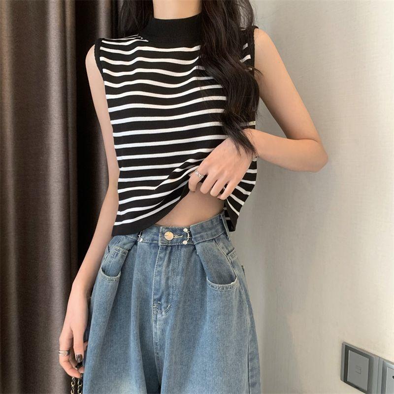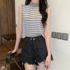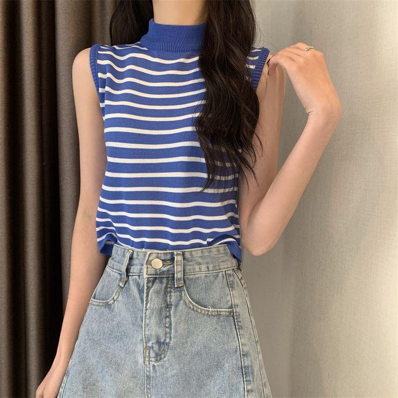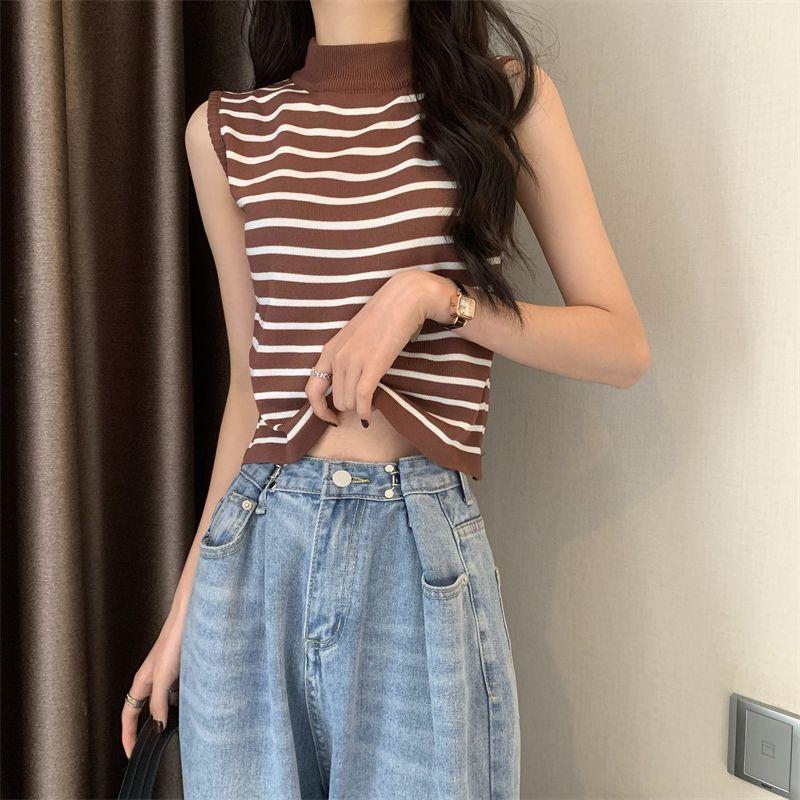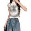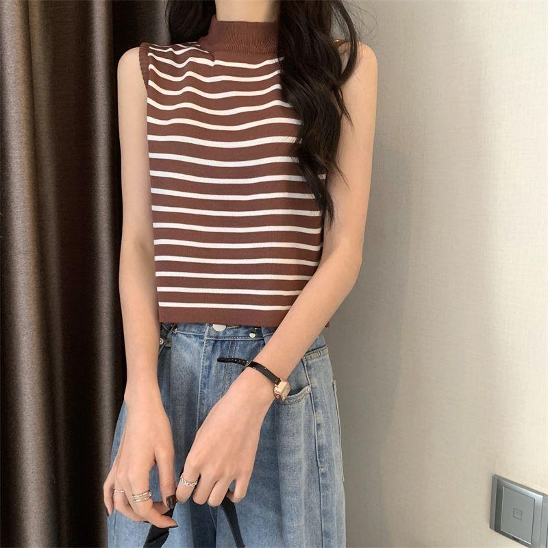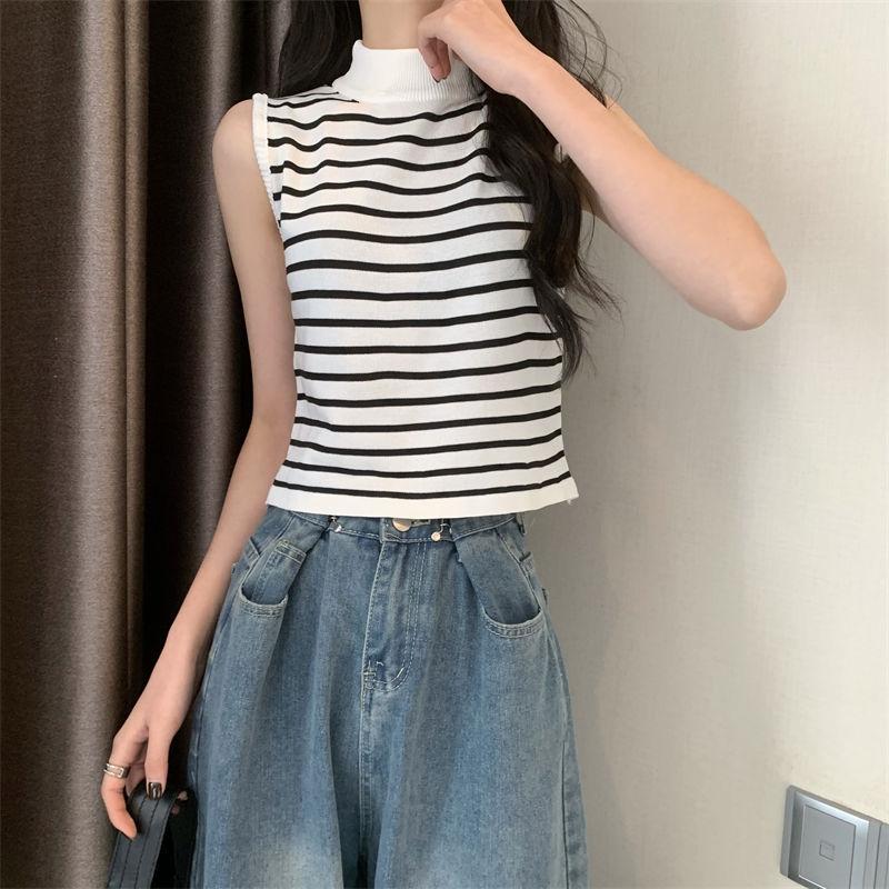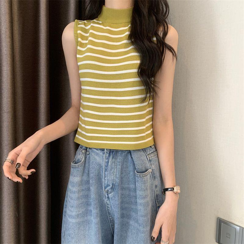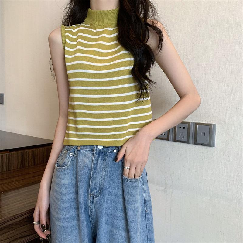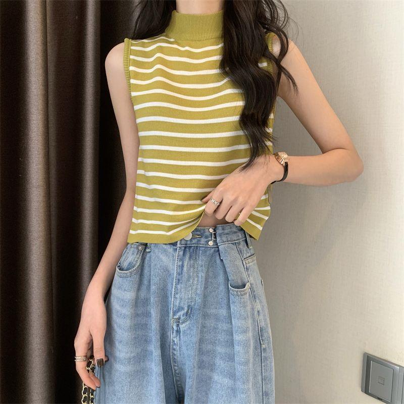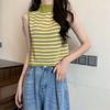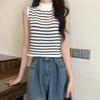 Camiseta interior ajustada de otoño para mujer, estilo coreano, con rayas de colores contrastantes, cuello alto, sin mangas