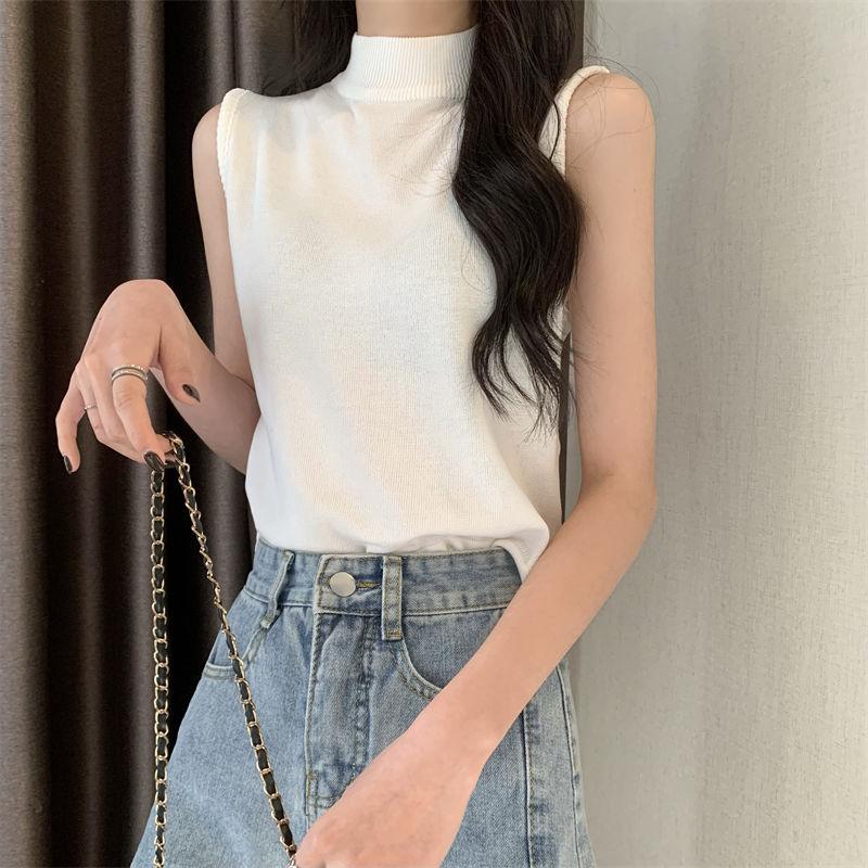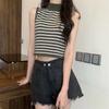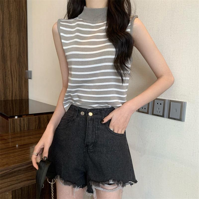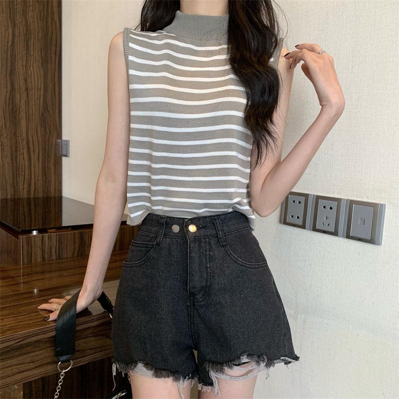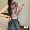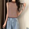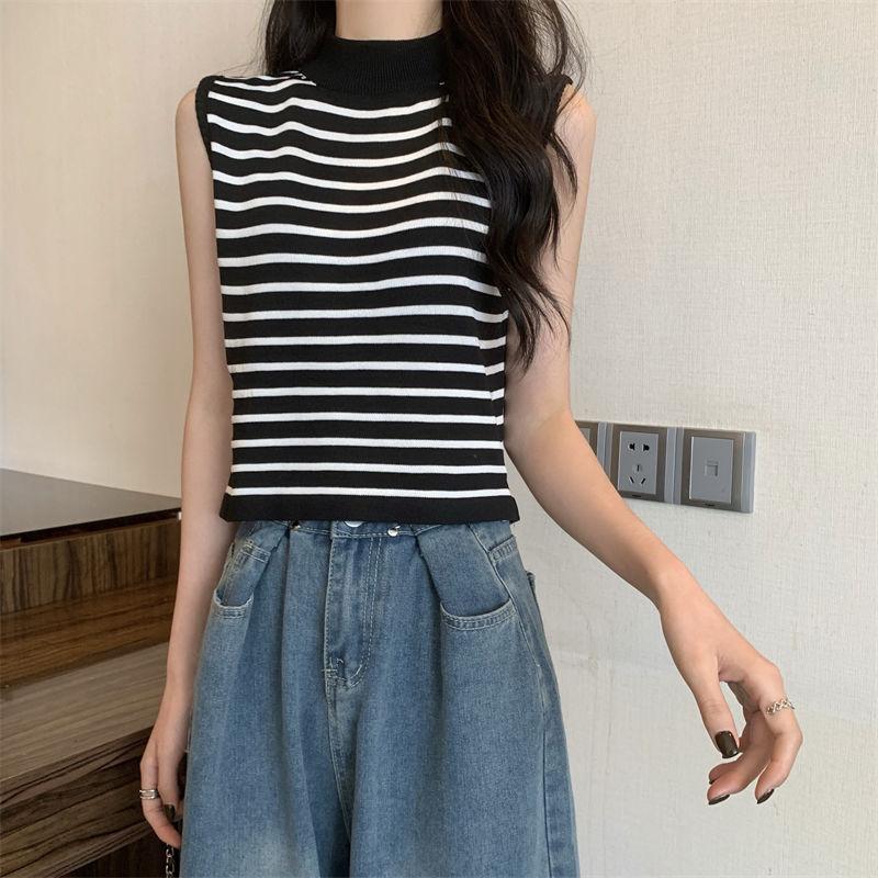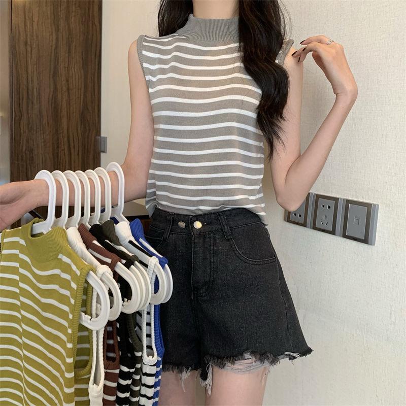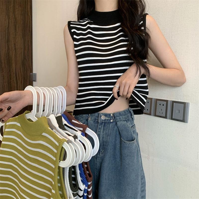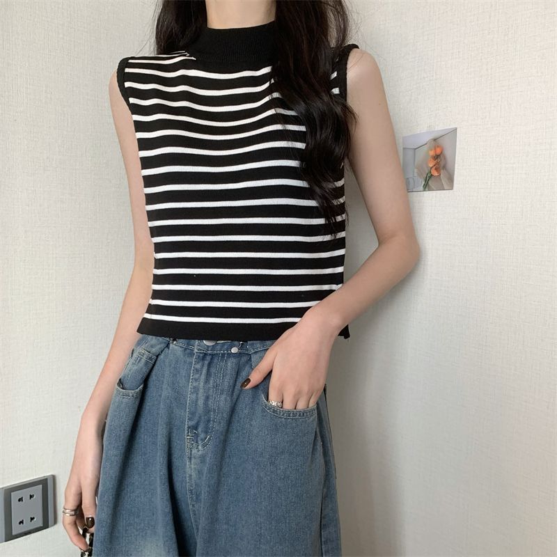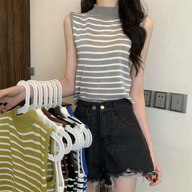 Camiseta interior ajustada de otoño para mujer, estilo coreano, con rayas de colores contrastantes, cuello alto, sin mangas