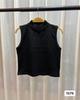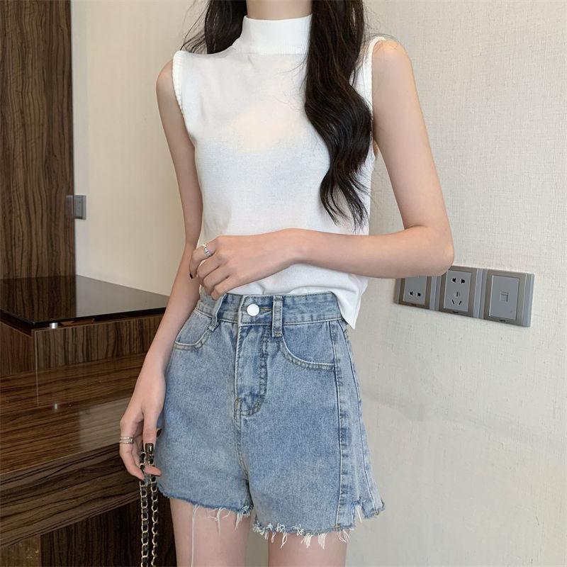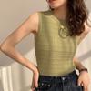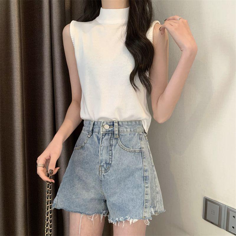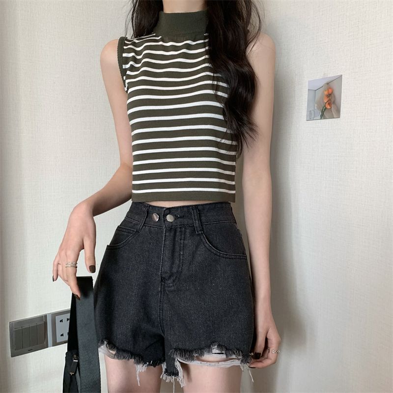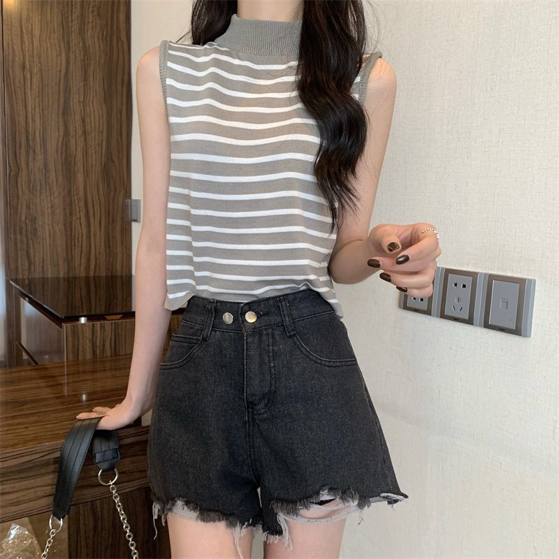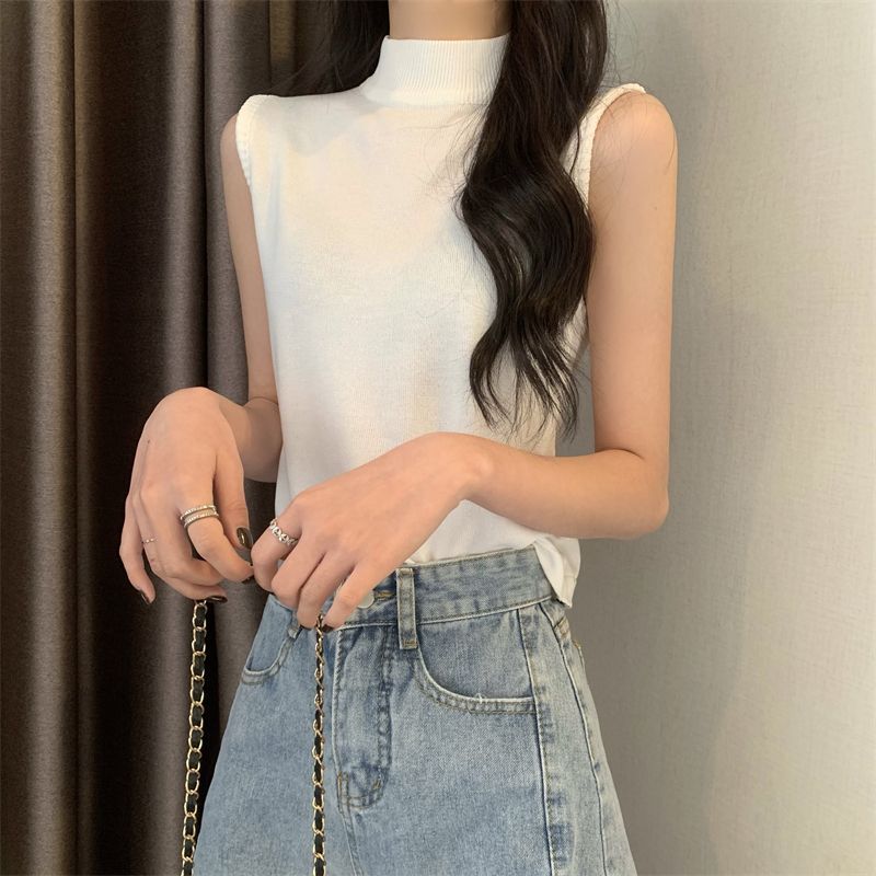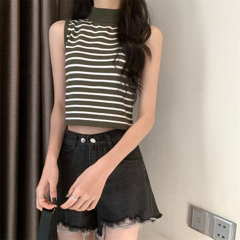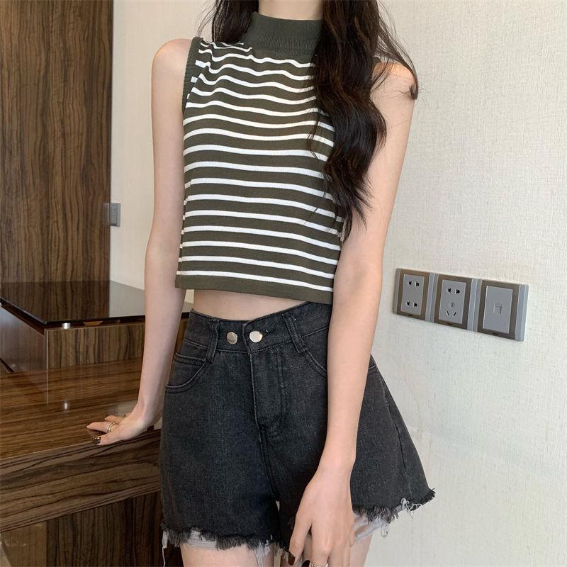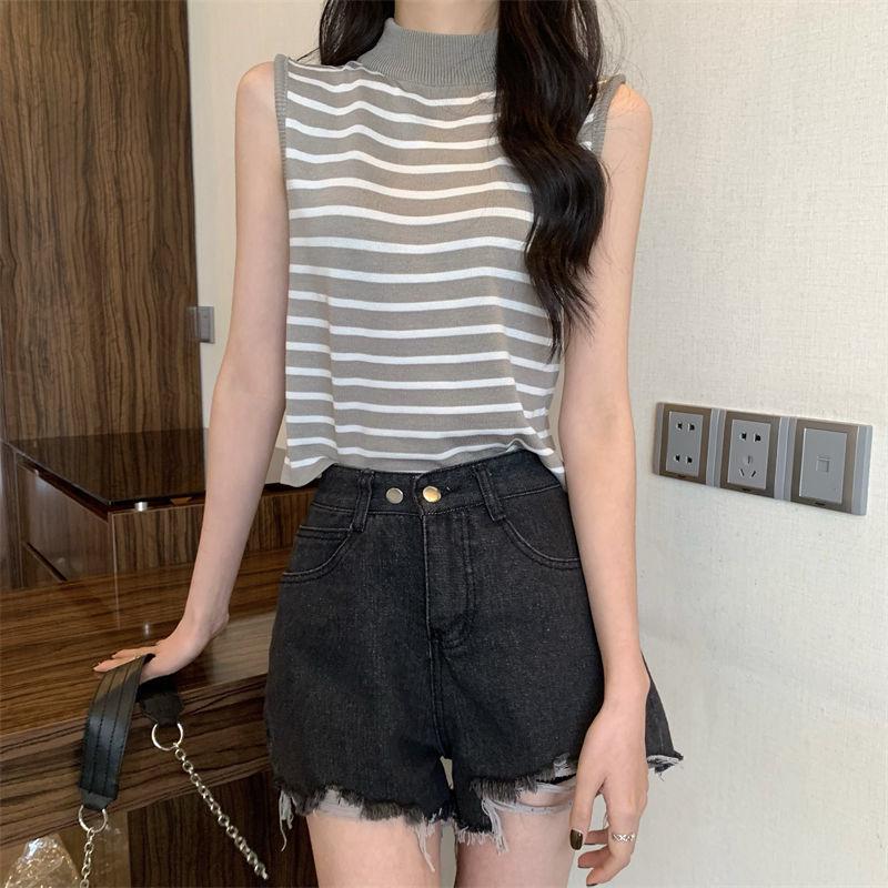 Camiseta interior ajustada de otoño para mujer, estilo coreano, con rayas de colores contrastantes, cuello alto, sin mangas