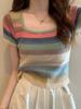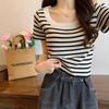 Camiseta de manga corta de punto de seda helada entallada a rayas con cuello cuadrado ondulado para mujer, top corto elegante y suave de verano