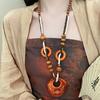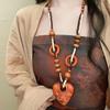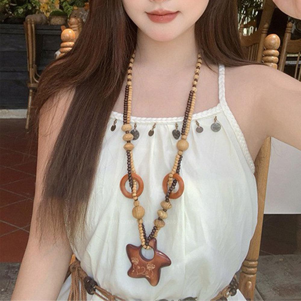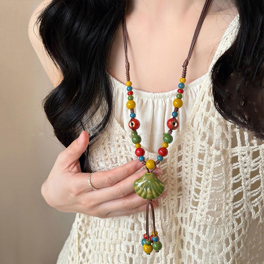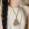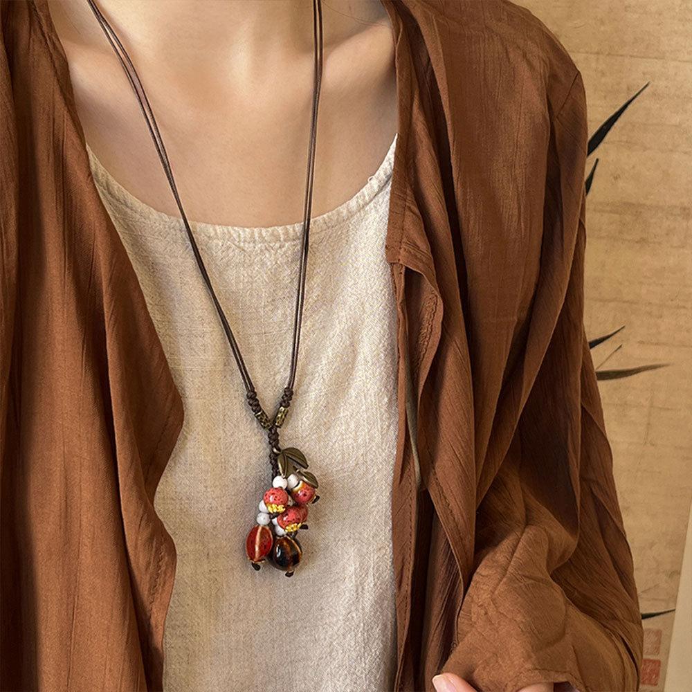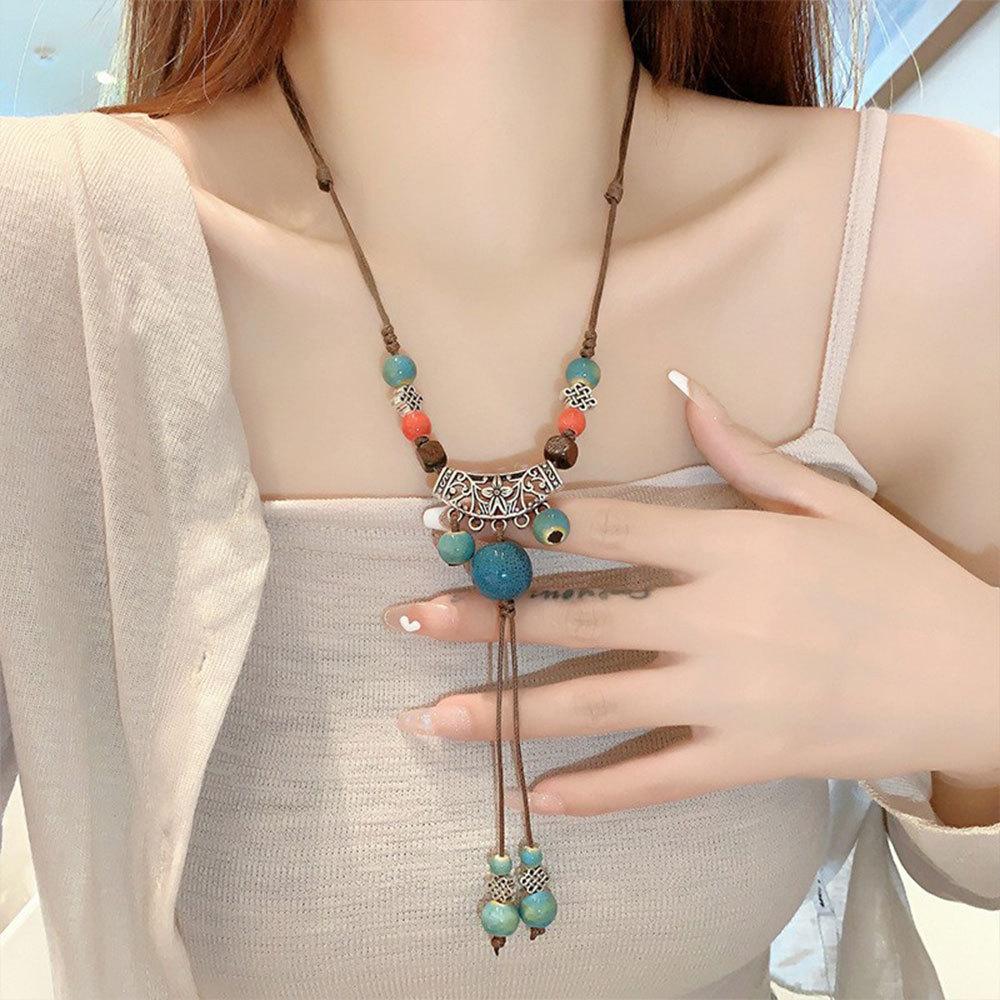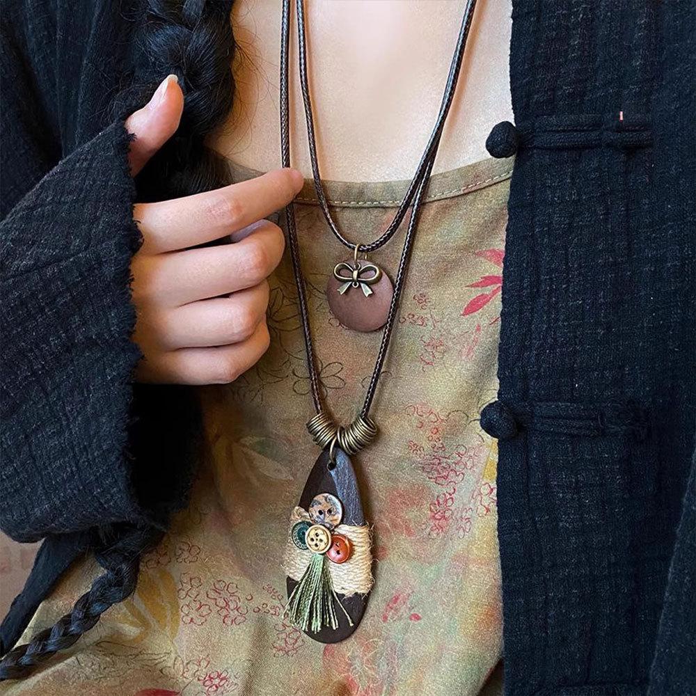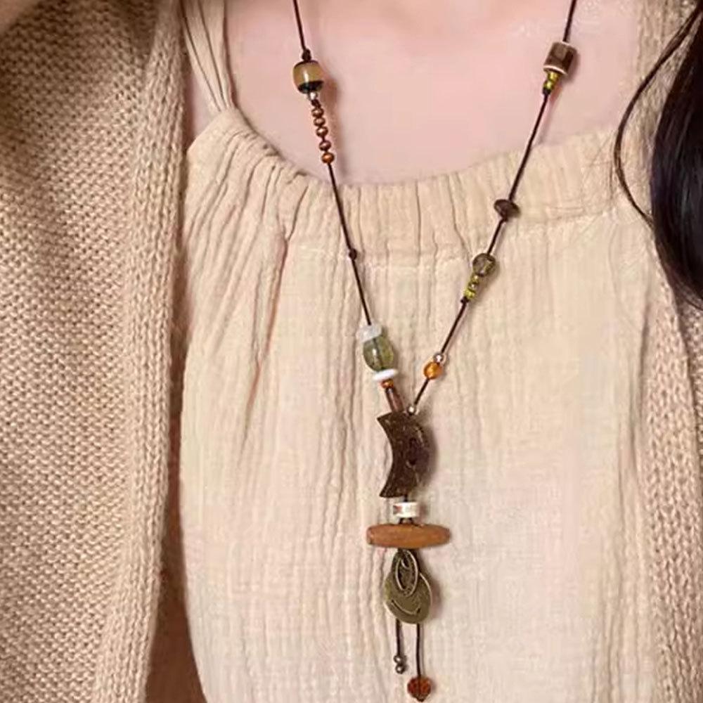 Collar de Cuerda Tejida Estilo Zen Estilo Nacional para Mujer Estilo Étnico Bohemio Largo de Madera Retro Hoja Cadena para Suéter