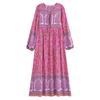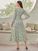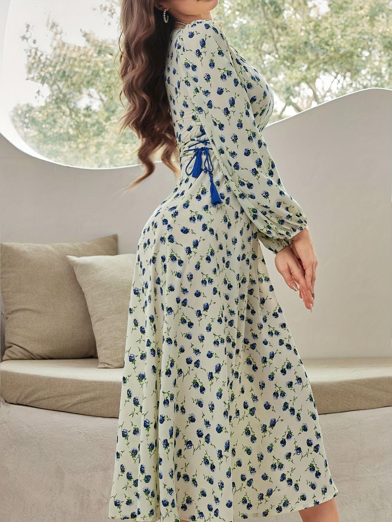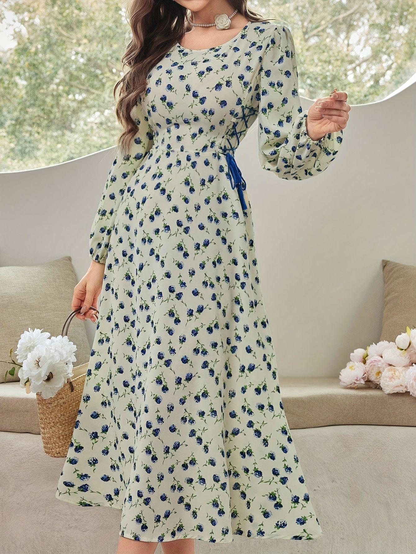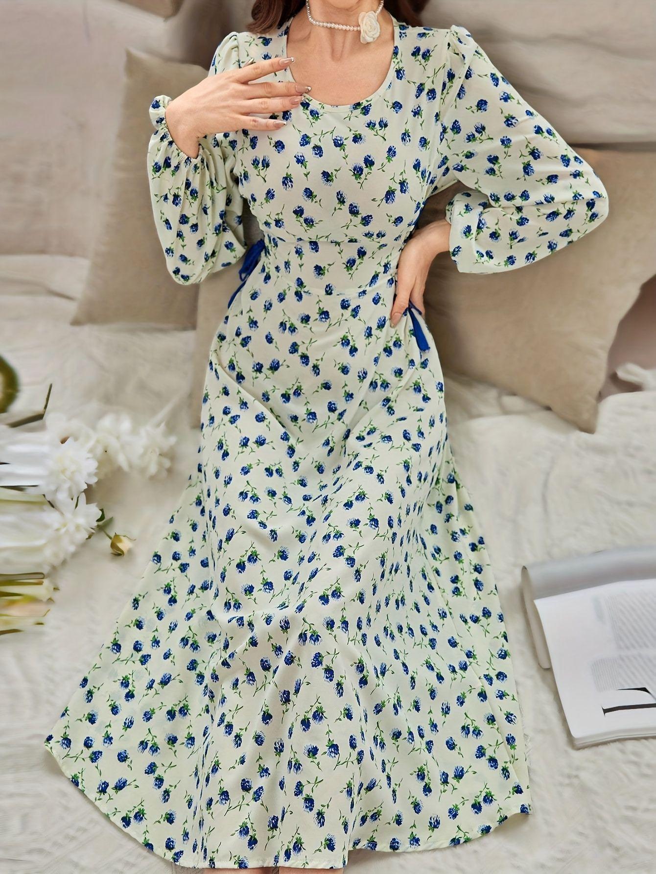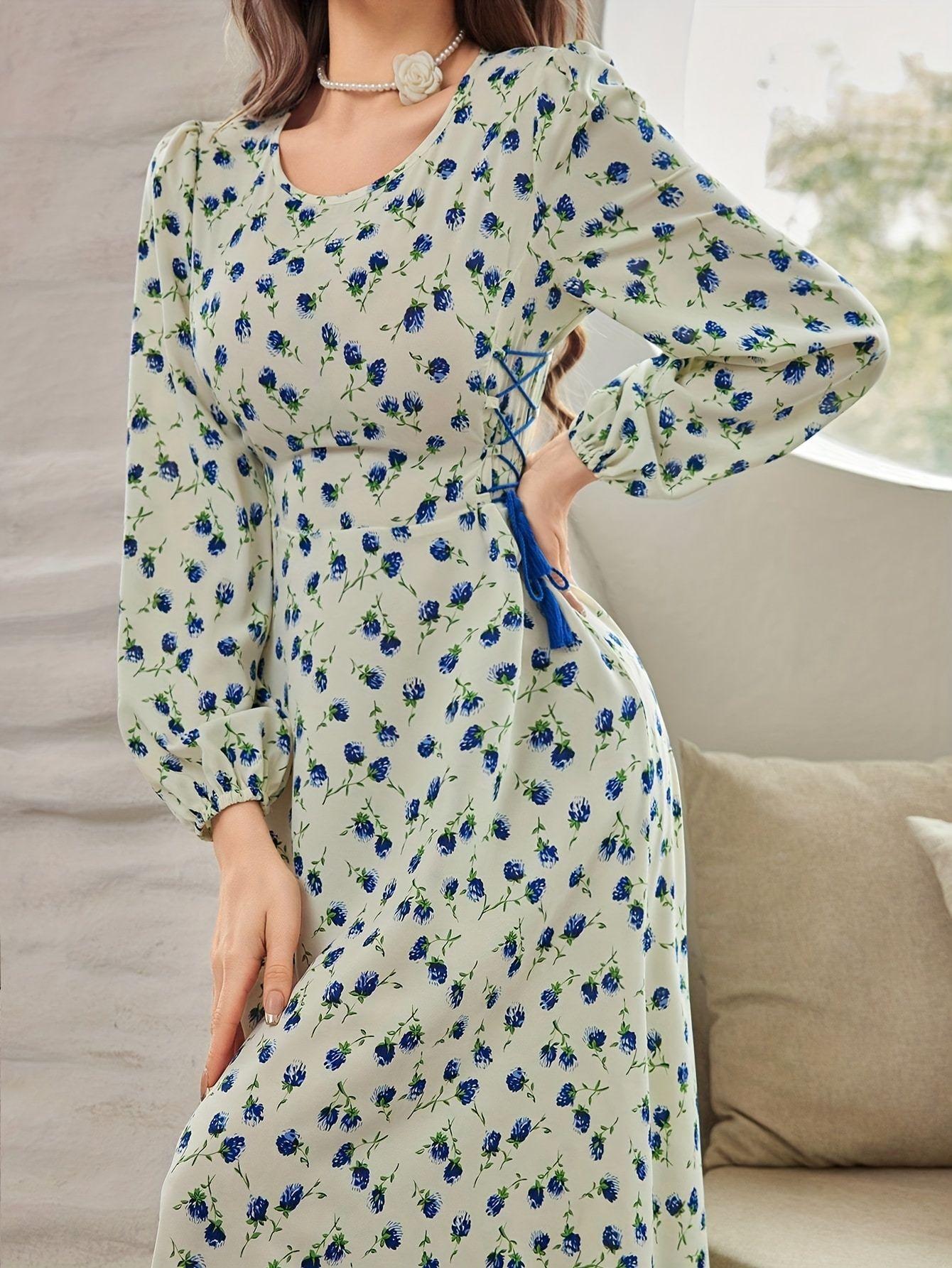 Vestido largo elegante de verano con estampado floral, manga larga, cuello redondo, cintura ajustada, ajustado, 5181