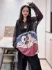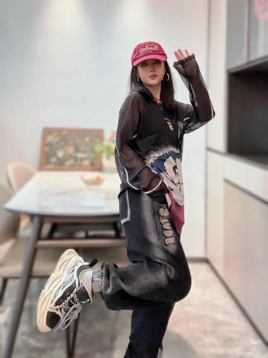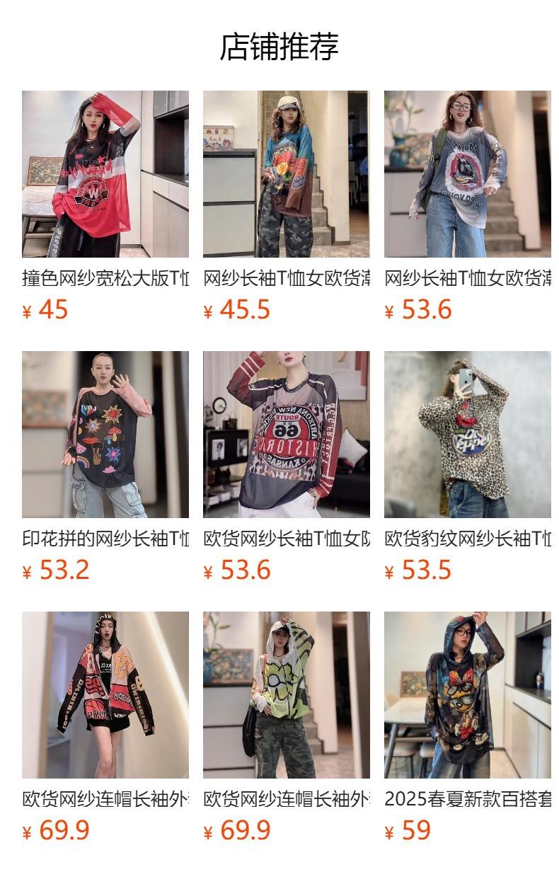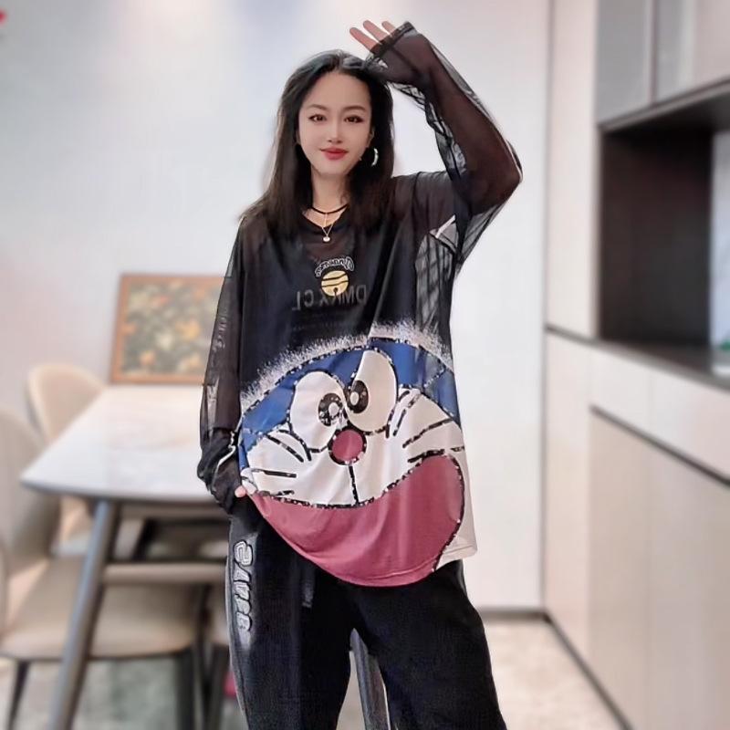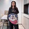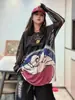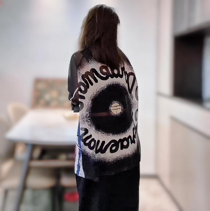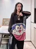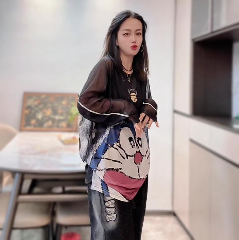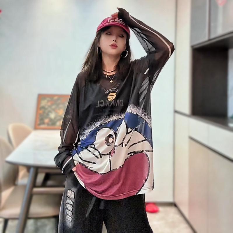 Camiseta de Malla de Manga Larga Estilo Americano para Mujer Camisa Base Blusa Top de Moda Estilo Europeo Marca Trendy Camiseta Estampada de Dibujos Animados Antiguos