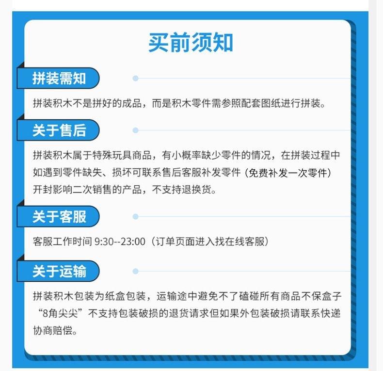 (1) La caja de embalaje se utilizará como carcasa para proteger los bloques de construcción. Si no se proporciona una caja de protección especial, los bloques pueden deformarse o estar incompletos. ¡Esto no es un problema de calidad! No puede utilizarse como motivo de devolución. Si necesita una caja de embalaje más gruesa, póngase en contacto con el servicio de atención al cliente después de realizar el pedido. ¡Es gratis! Para los modelos de caja de color, no se aceptarán devoluciones ni reembolsos si el embalaje está abierto. No existe un período de 7 días sin motivo para la venta al por mayor. Si el embalaje original de los bloques de construcción debe devolverse, el cliente correrá con los gastos de envío de ida y vuelta.
