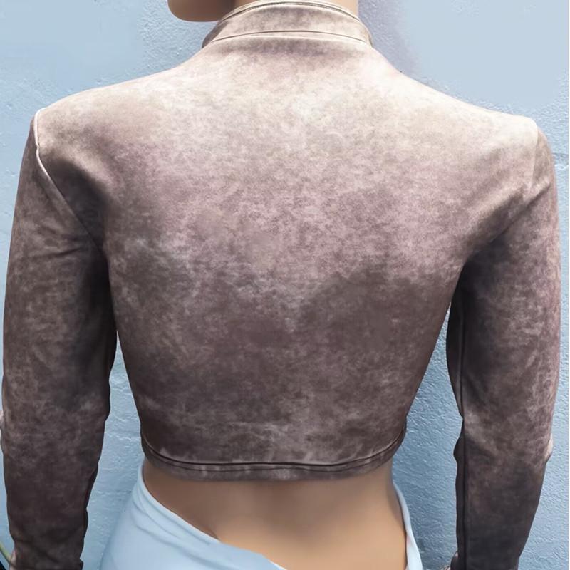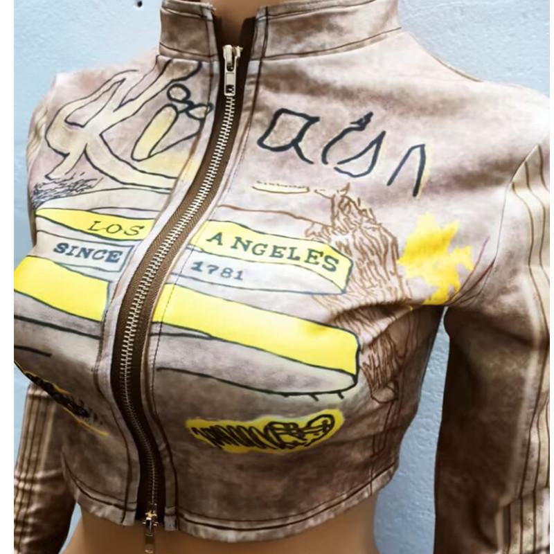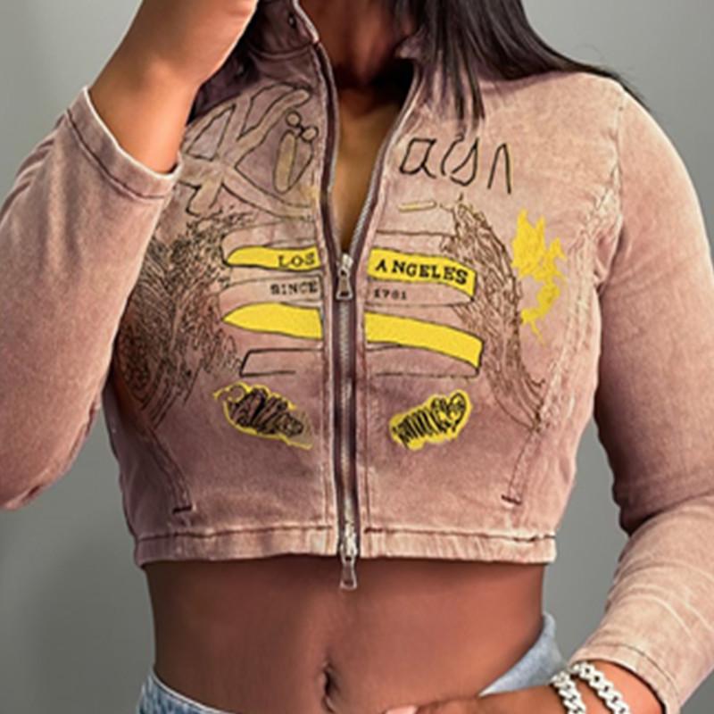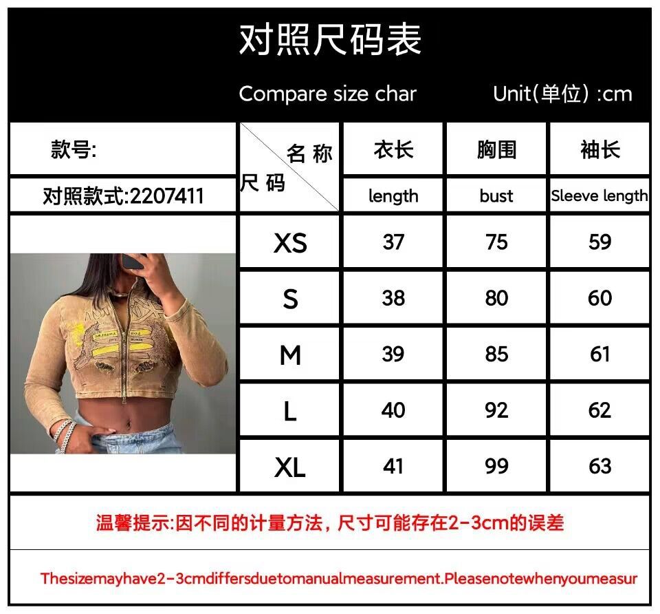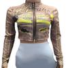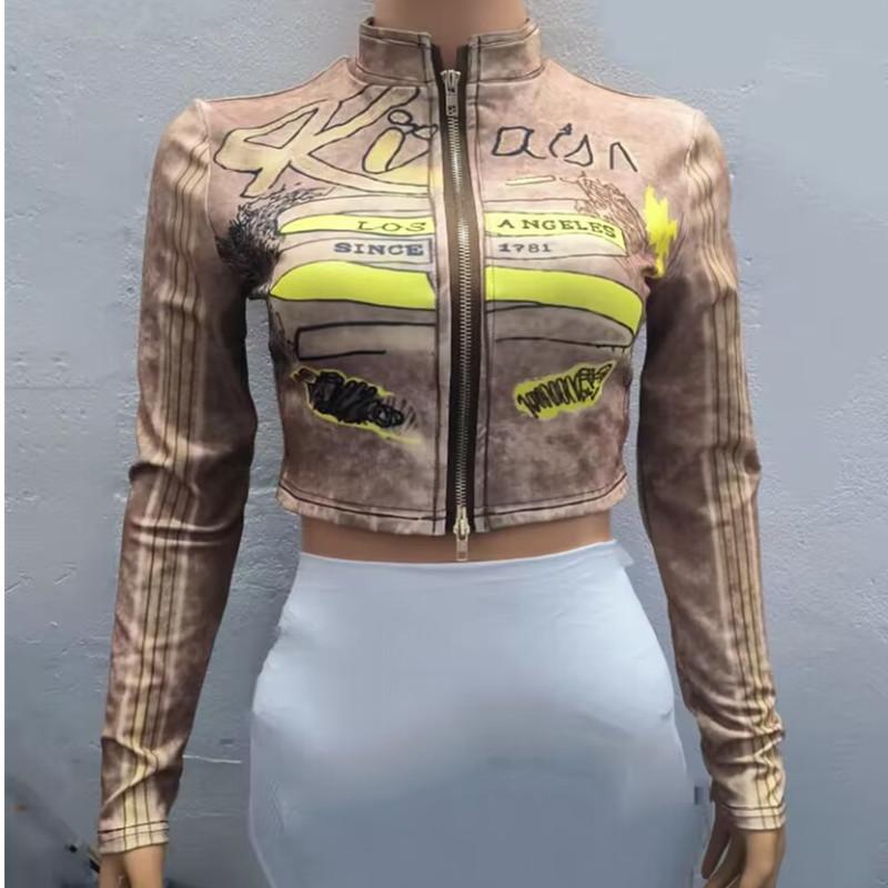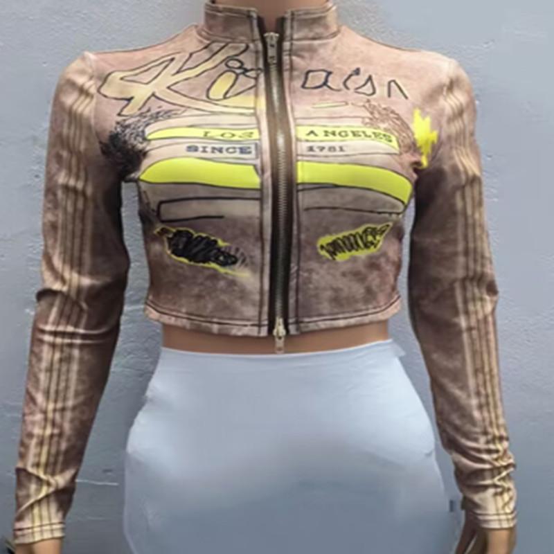 Chaqueta de punto corta de manga larga con estampado europeo y americano para mujer, nueva, marrón, con cremallera y corte entallado.