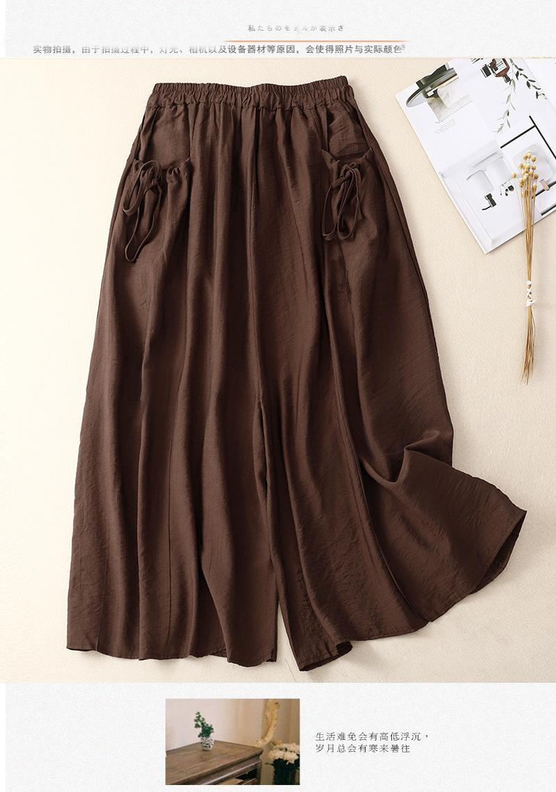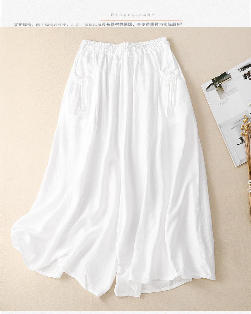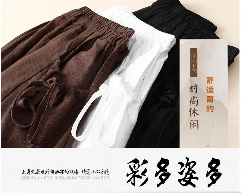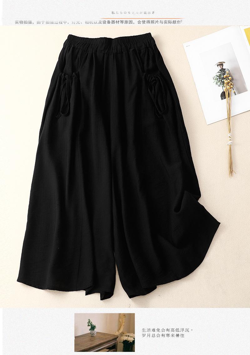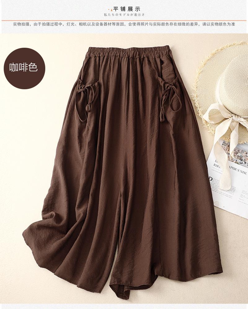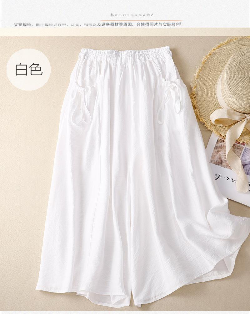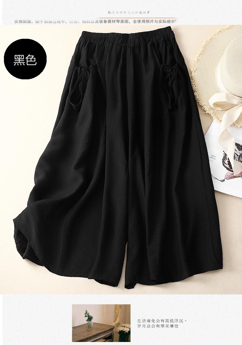 Foto real 2024 verano nuevo retro suelto adelgazante color sólido algodón y lino pantalones casuales pierna ancha pantalones capri de mujer 1360#