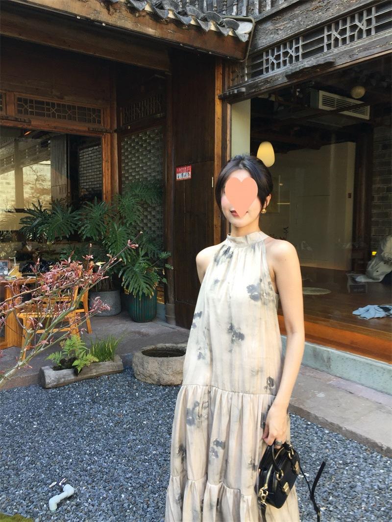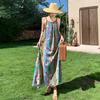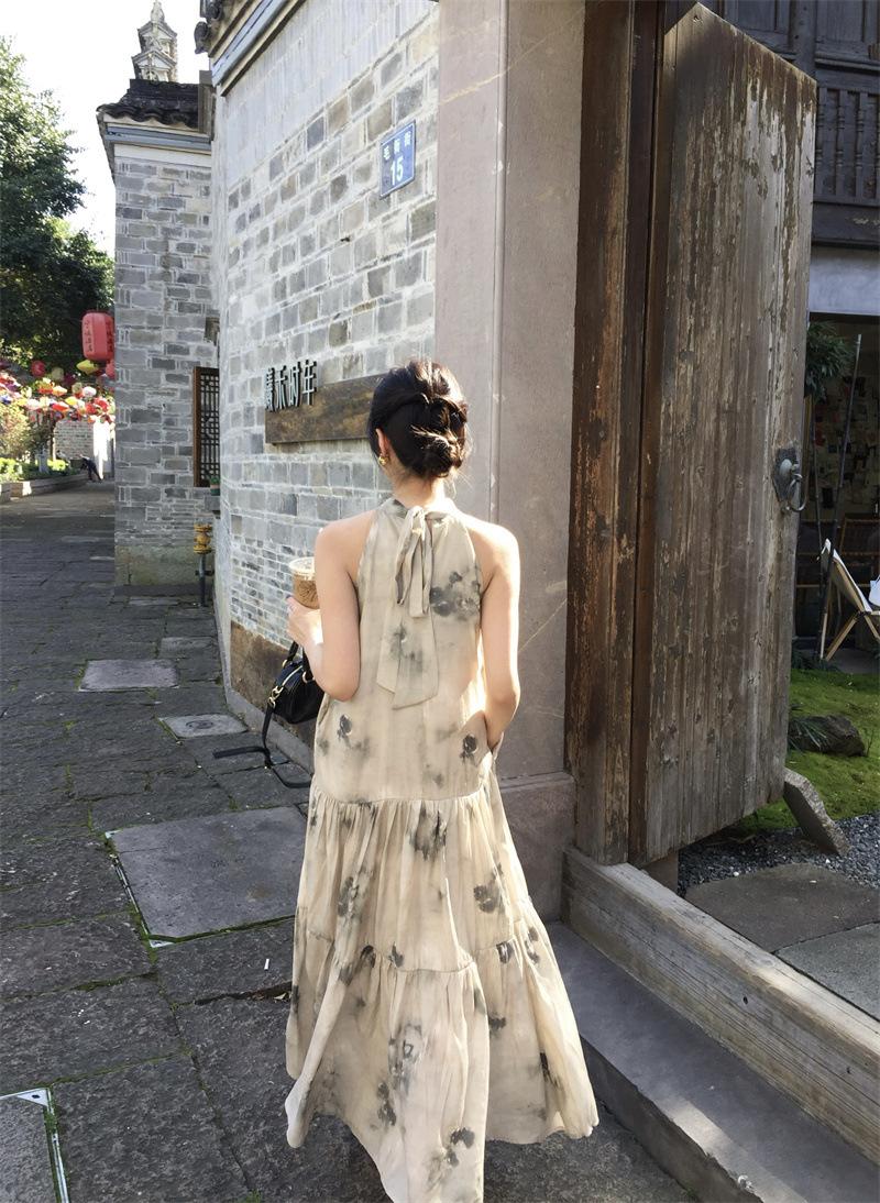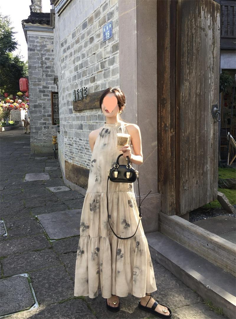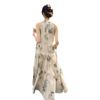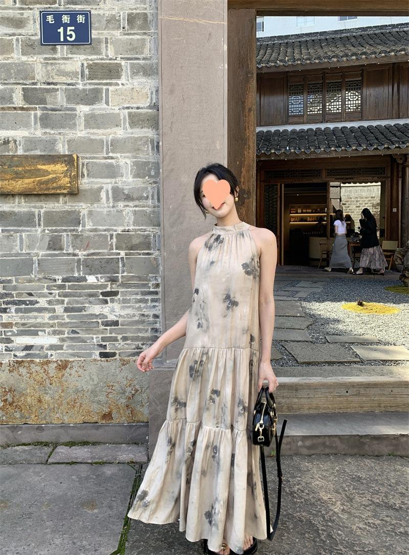 Vestido de verano de estilo chino con cuello teñido anudado, elegante y holgado, con corte en A y hombros descubiertos.