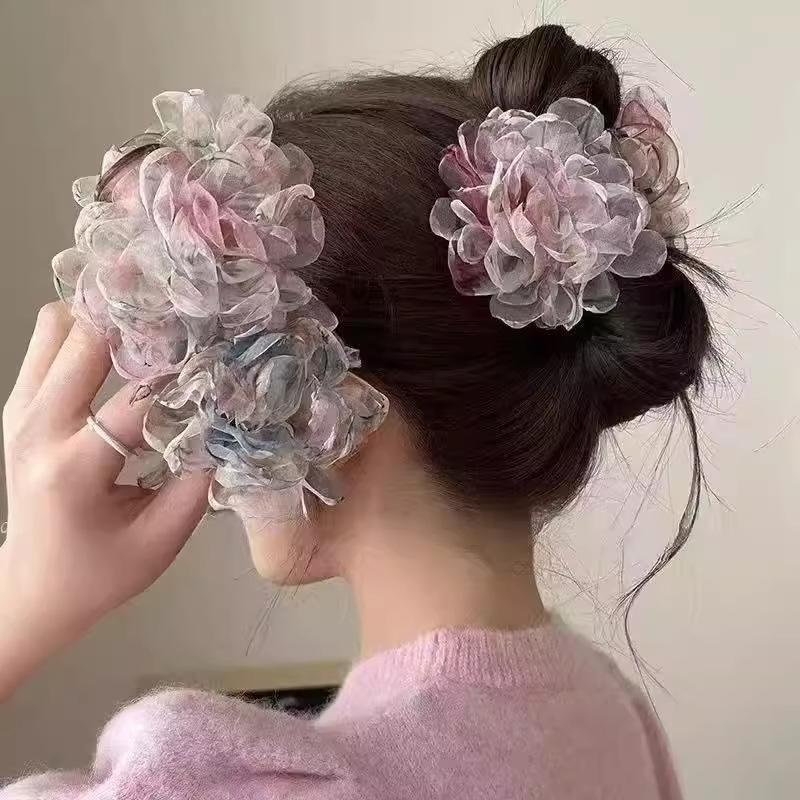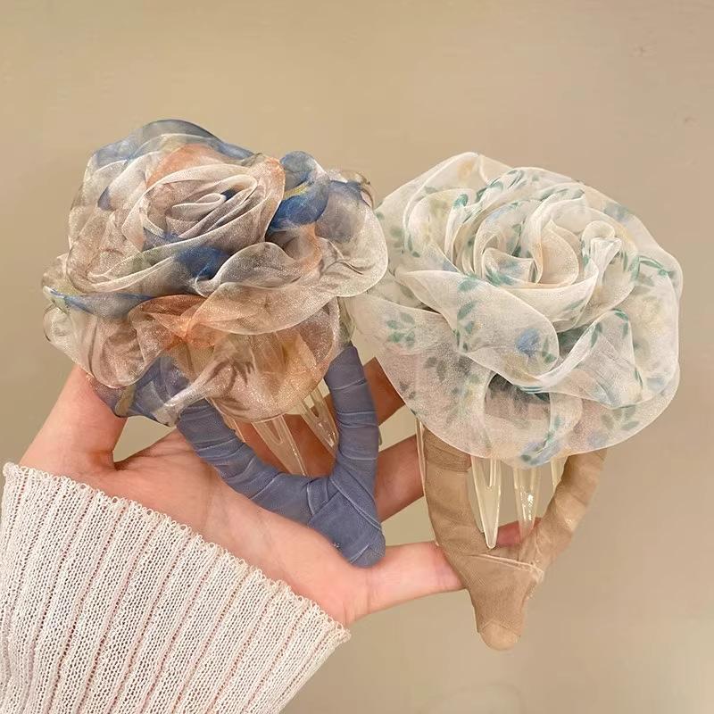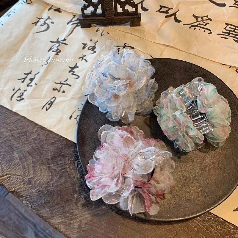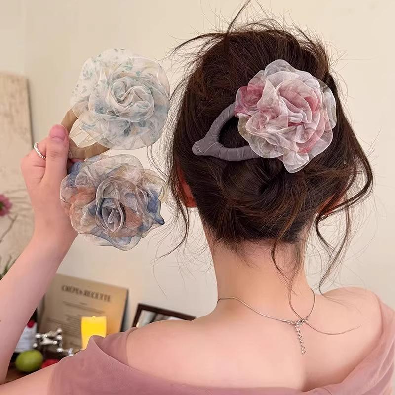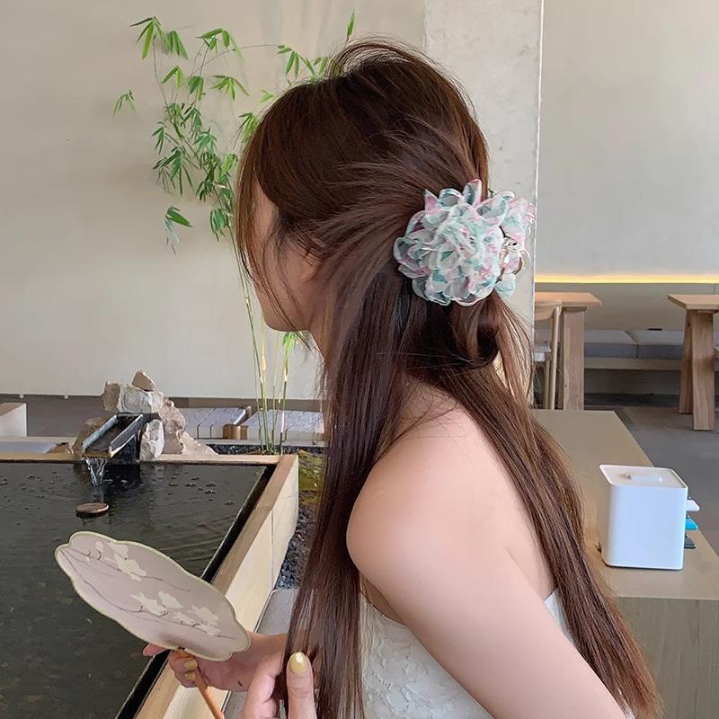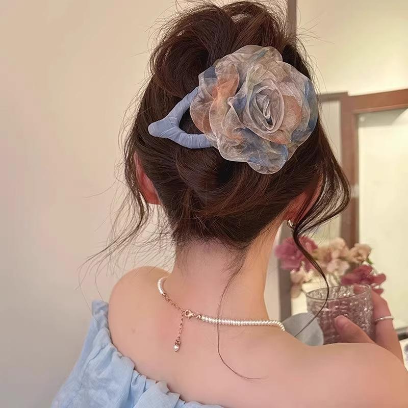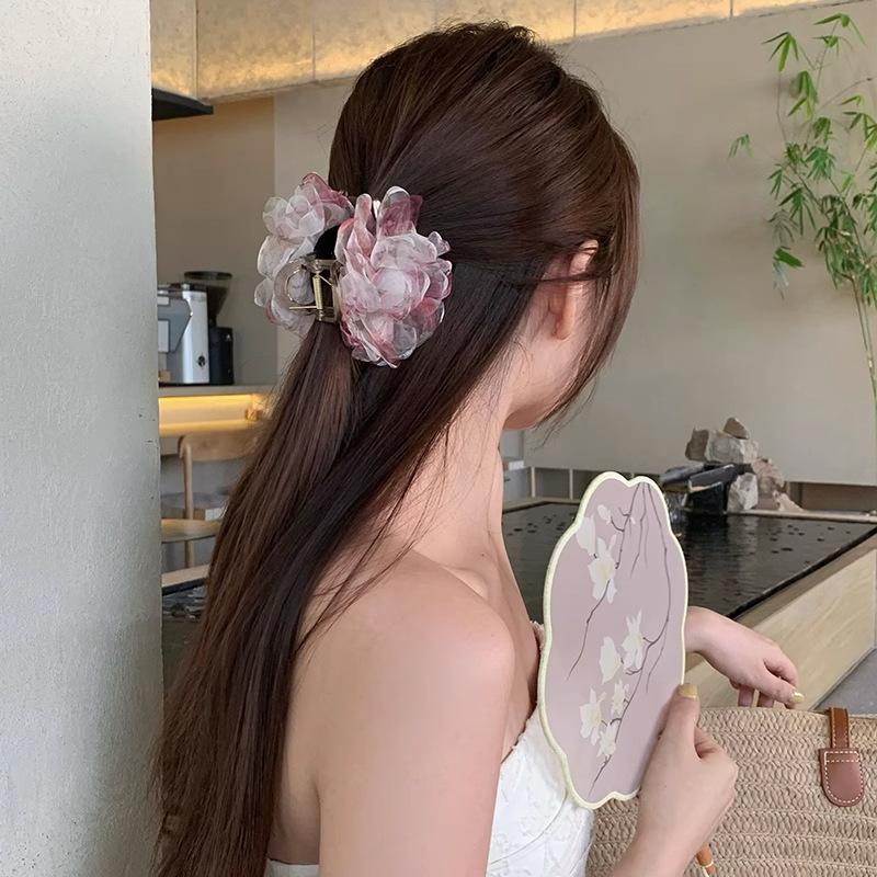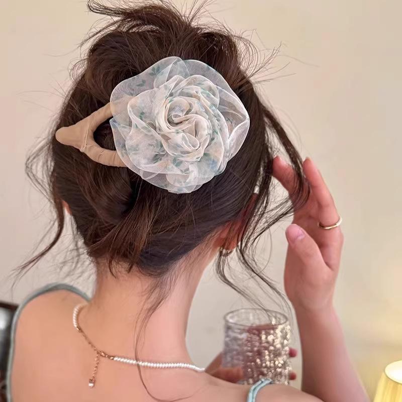 Horquilla de malla de flores de hada súper para mujer, horquilla francesa de alta gama para la parte posterior de la cabeza, diadema con clip de tiburón grande