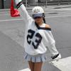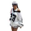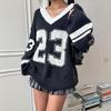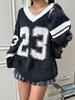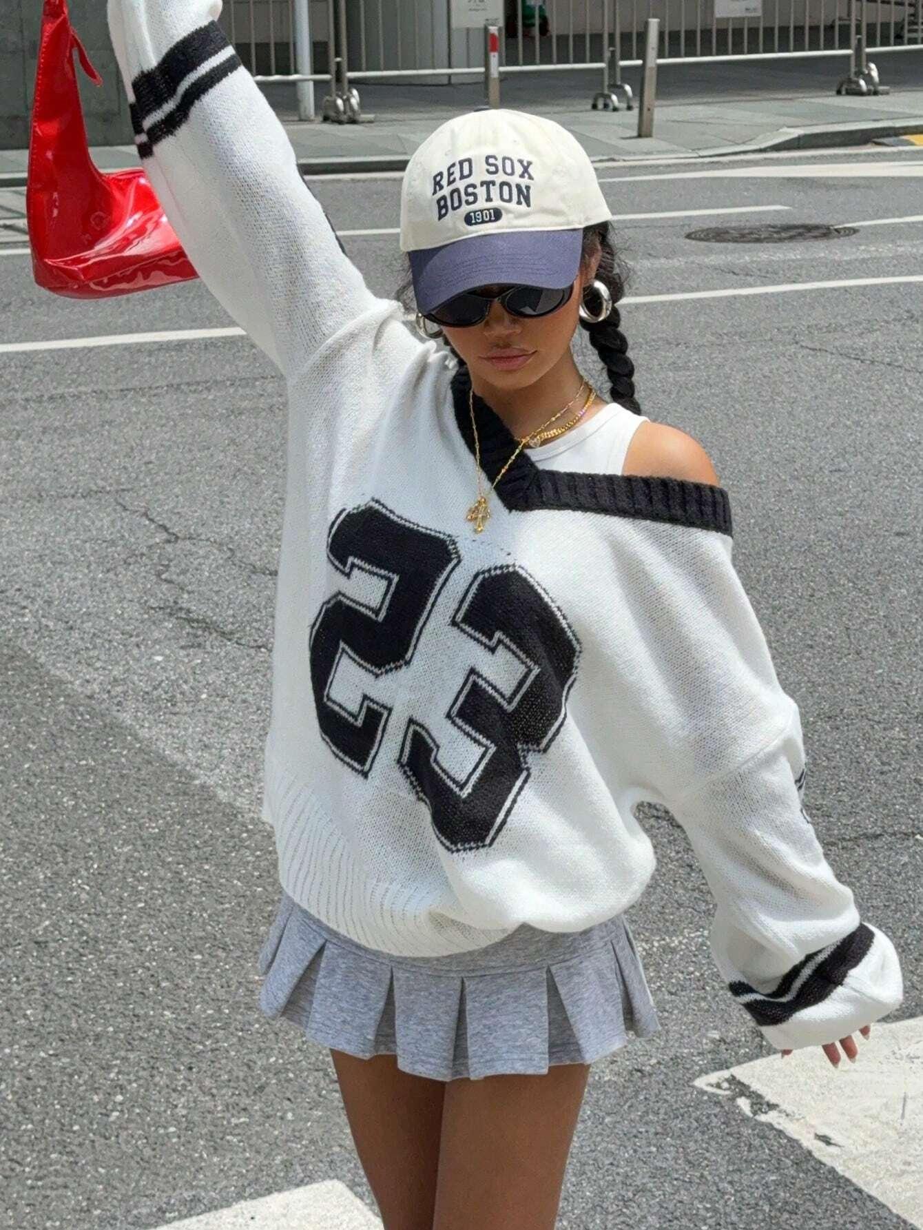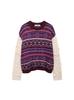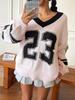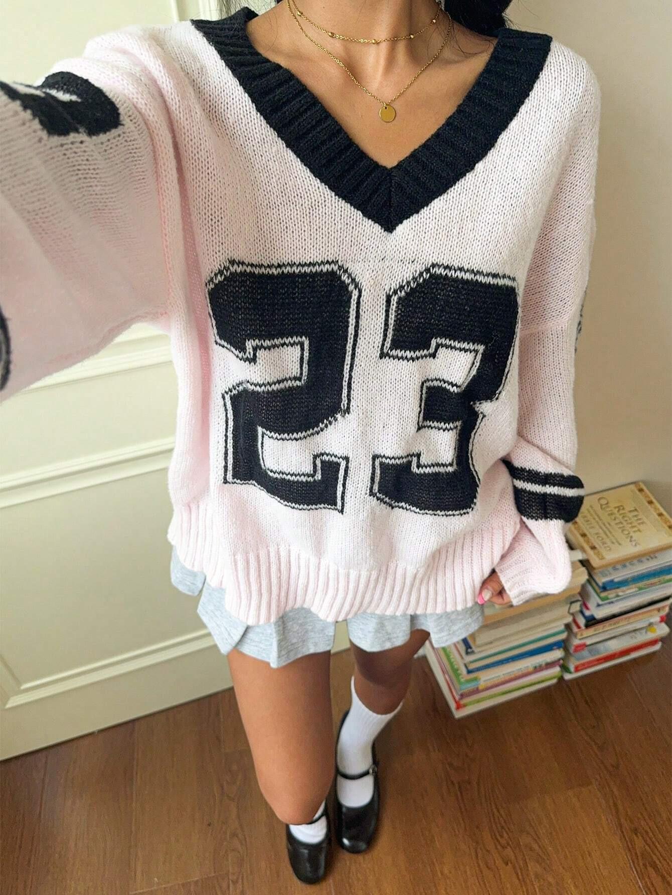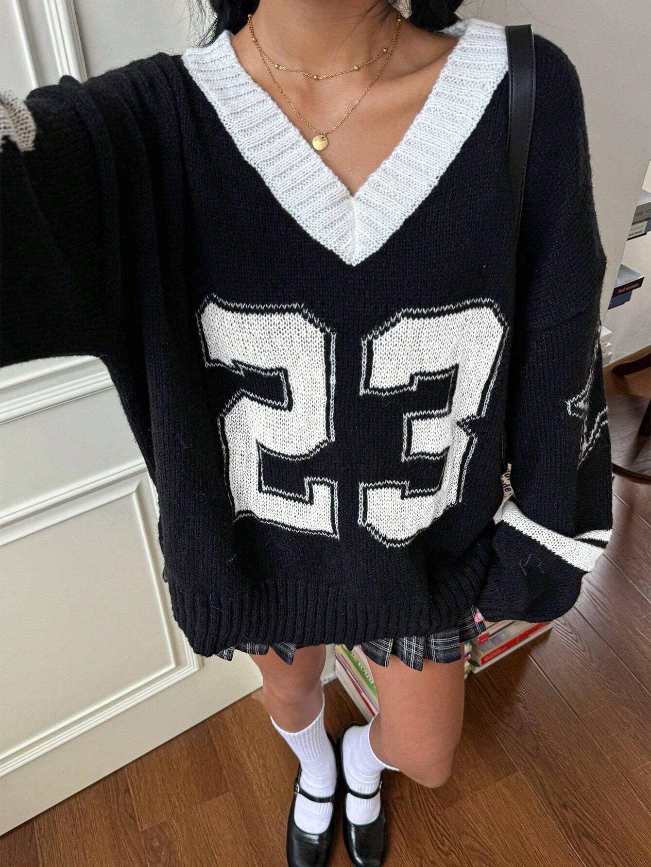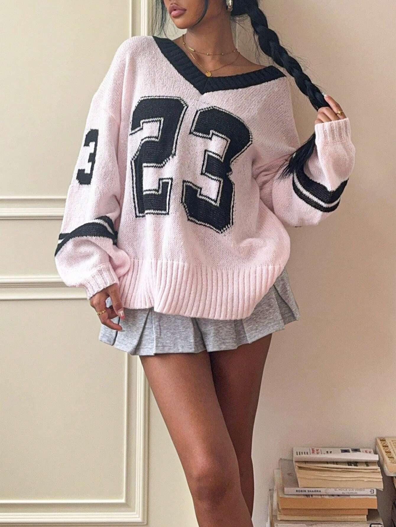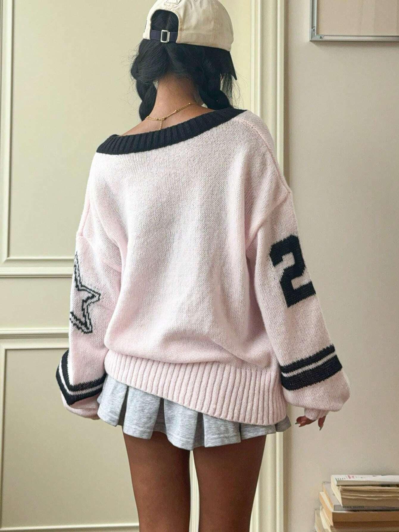 Suéter de otoño e invierno 2024, estilo europeo y americano, con estampado digital de jacquard en color contrastante, holgado, con cuello en V y manga larga para mujer