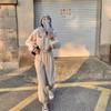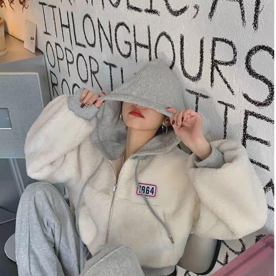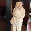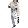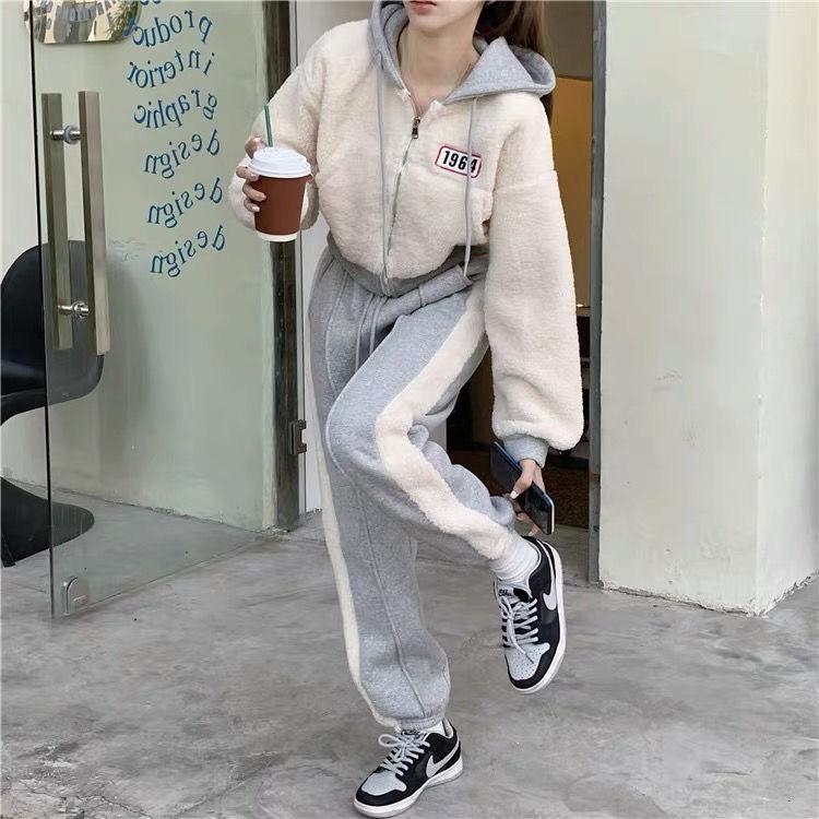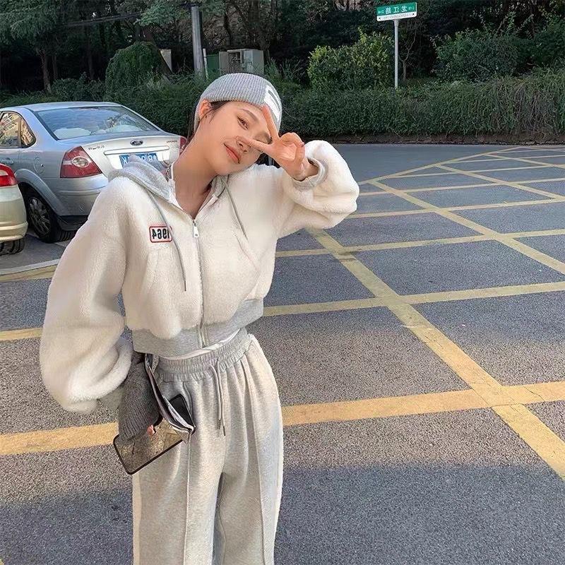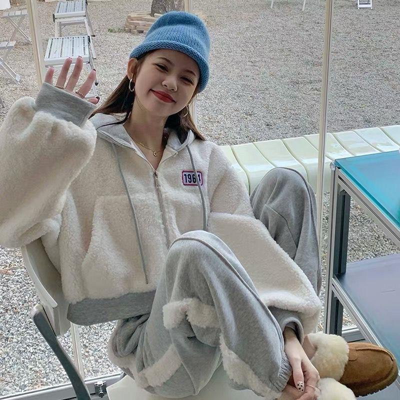 Traje de lana de cordero con forro polar para mujer, estilo universitario de invierno, suéter corto grueso, pantalones deportivos sueltos, traje deportivo de dos piezas