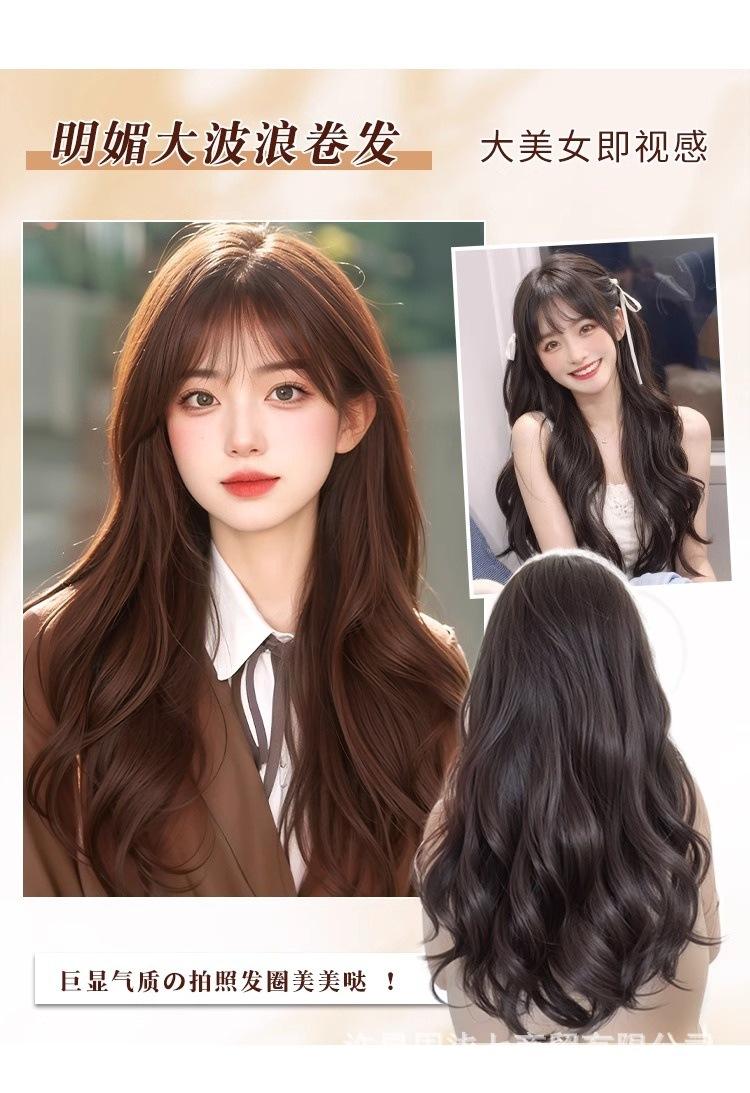 | Peluca para mujer, cabello largo natural, flequillo de aire de verano, ondas grandes, cabello largo y rizado, peluca de cabeza completa |