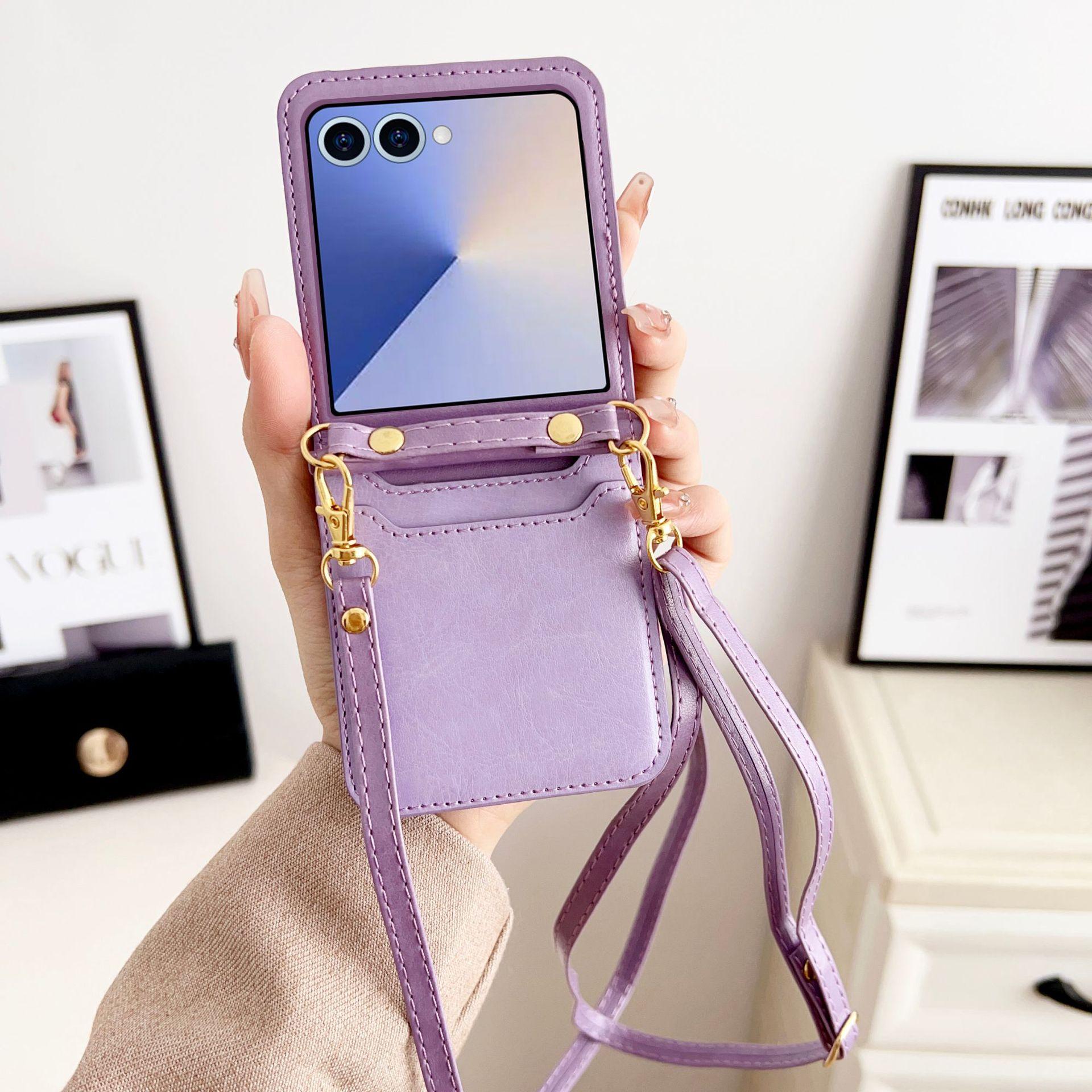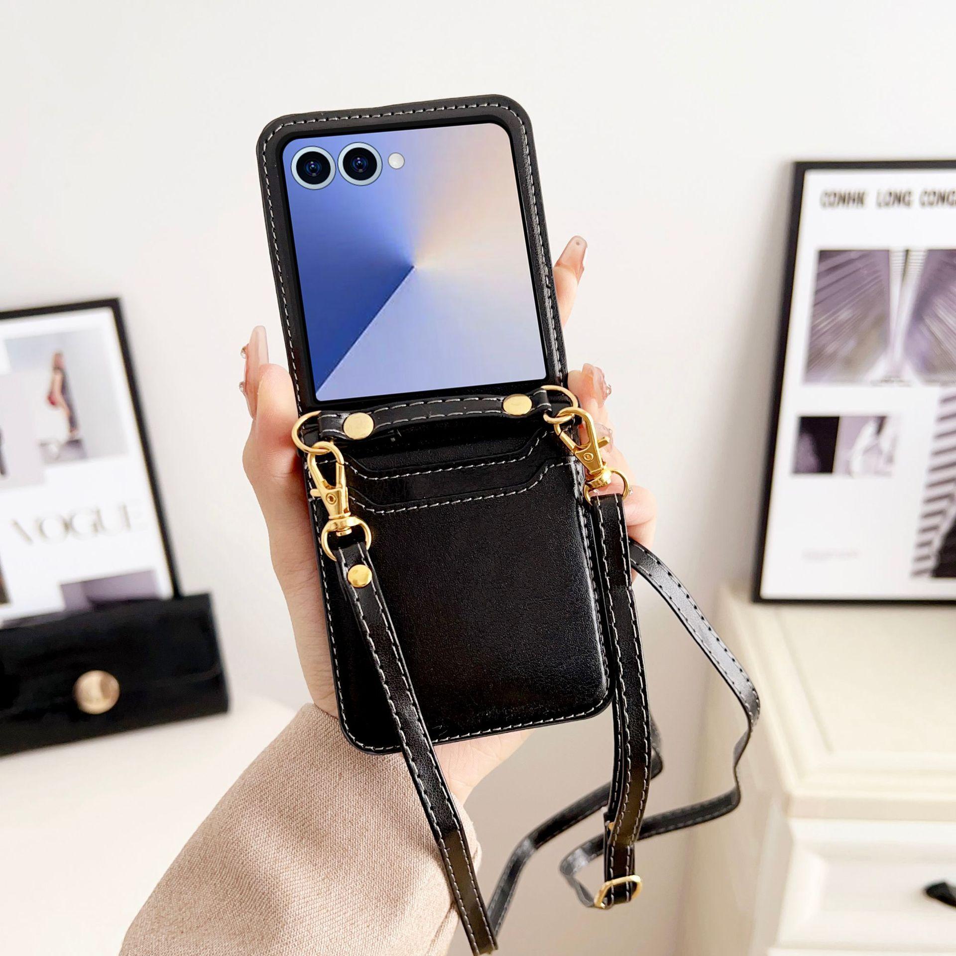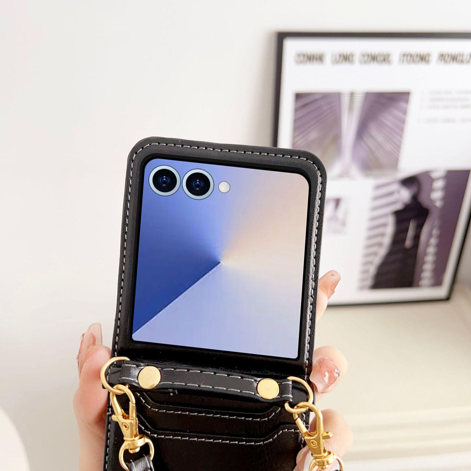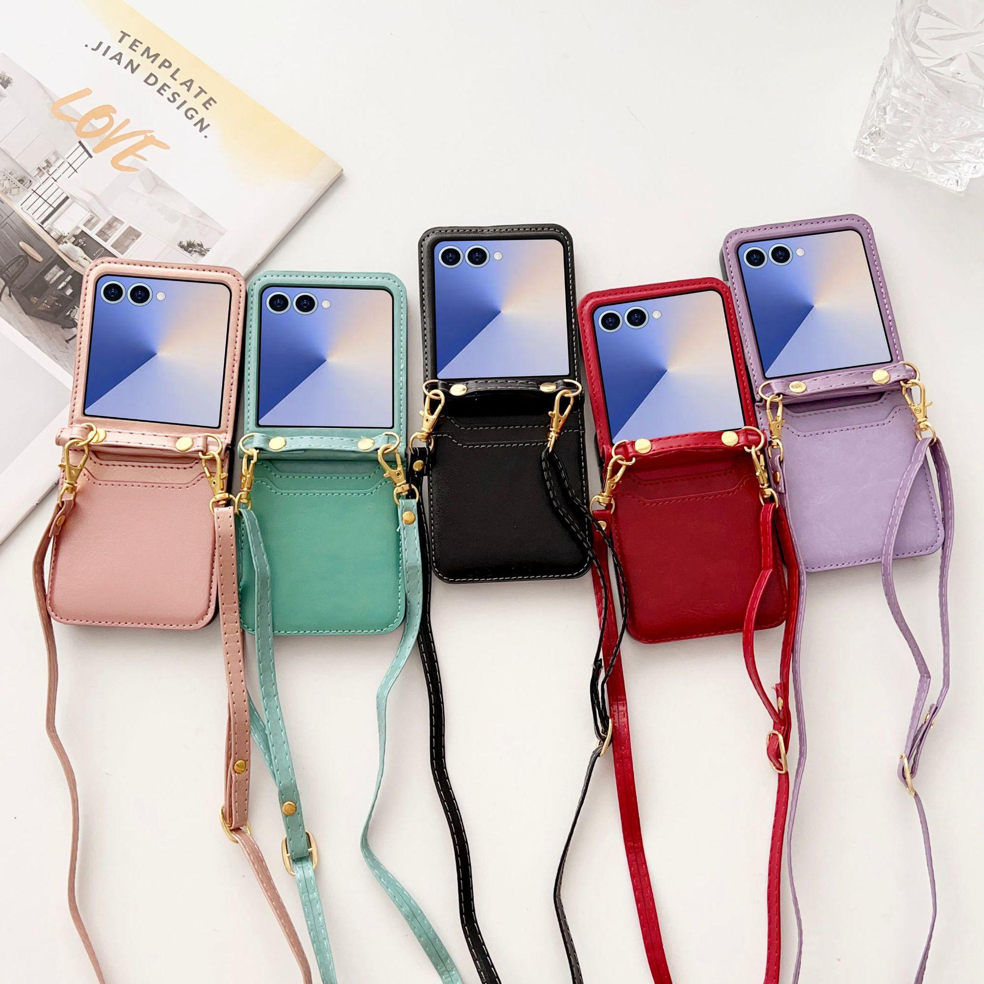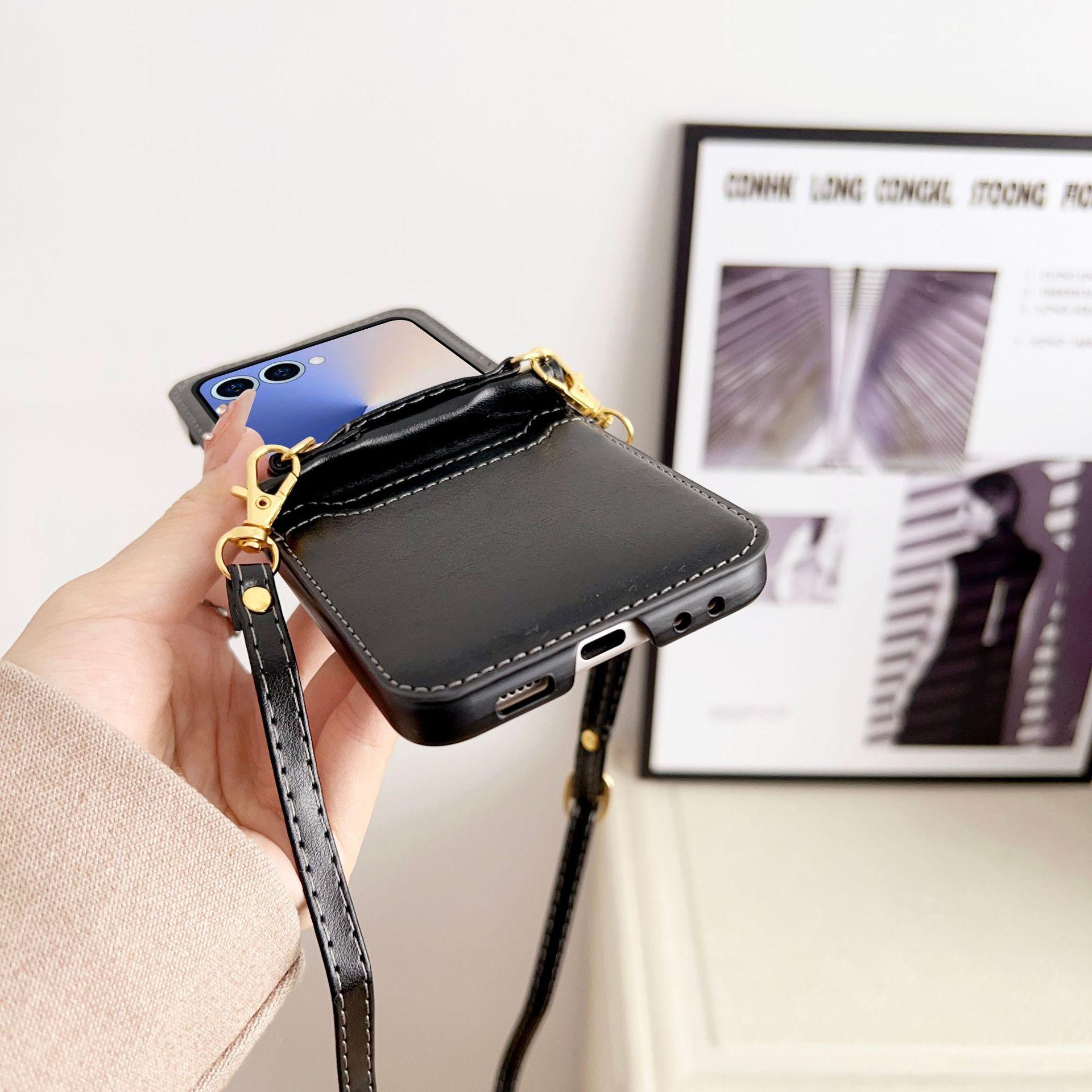 Adecuado para Funda de Teléfono Móvil Samsung Z Flip7 Z Flip 50% de Descuento Apilado Teléfono Móvil Color Puro Tarjeta Cuero Funda Correa Cuerda Cruzada Diagonal