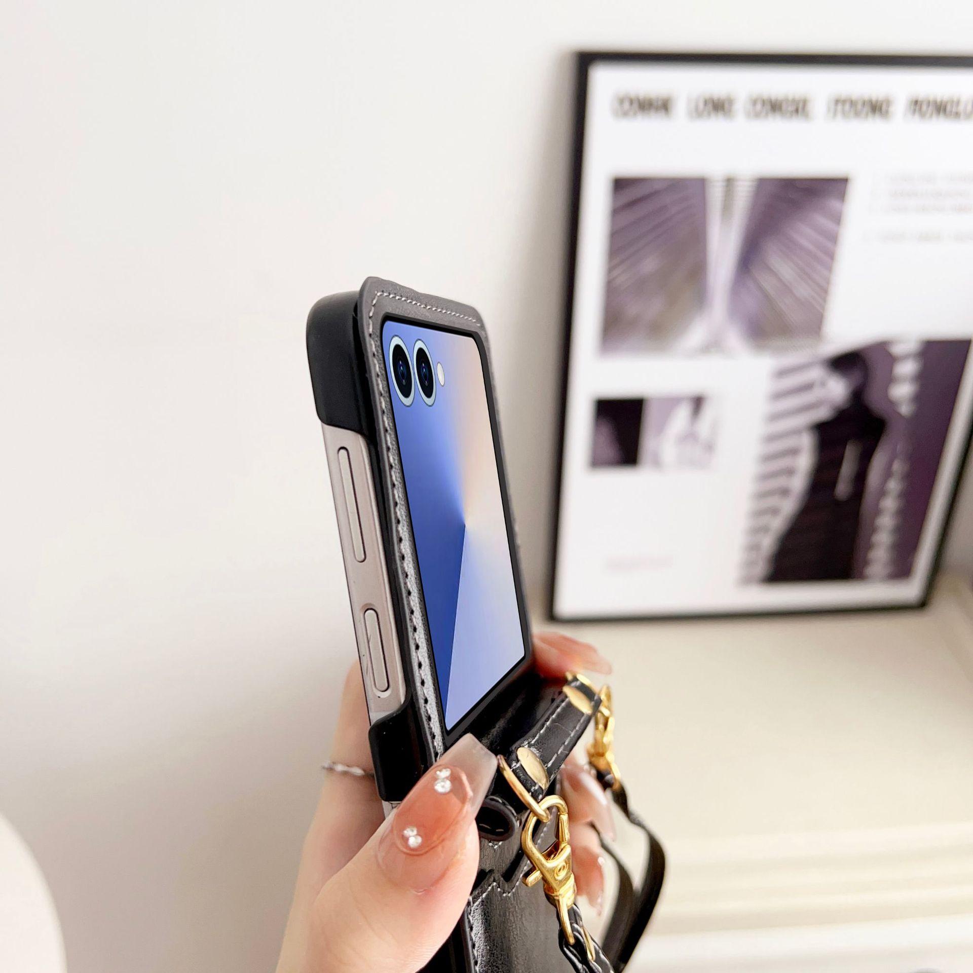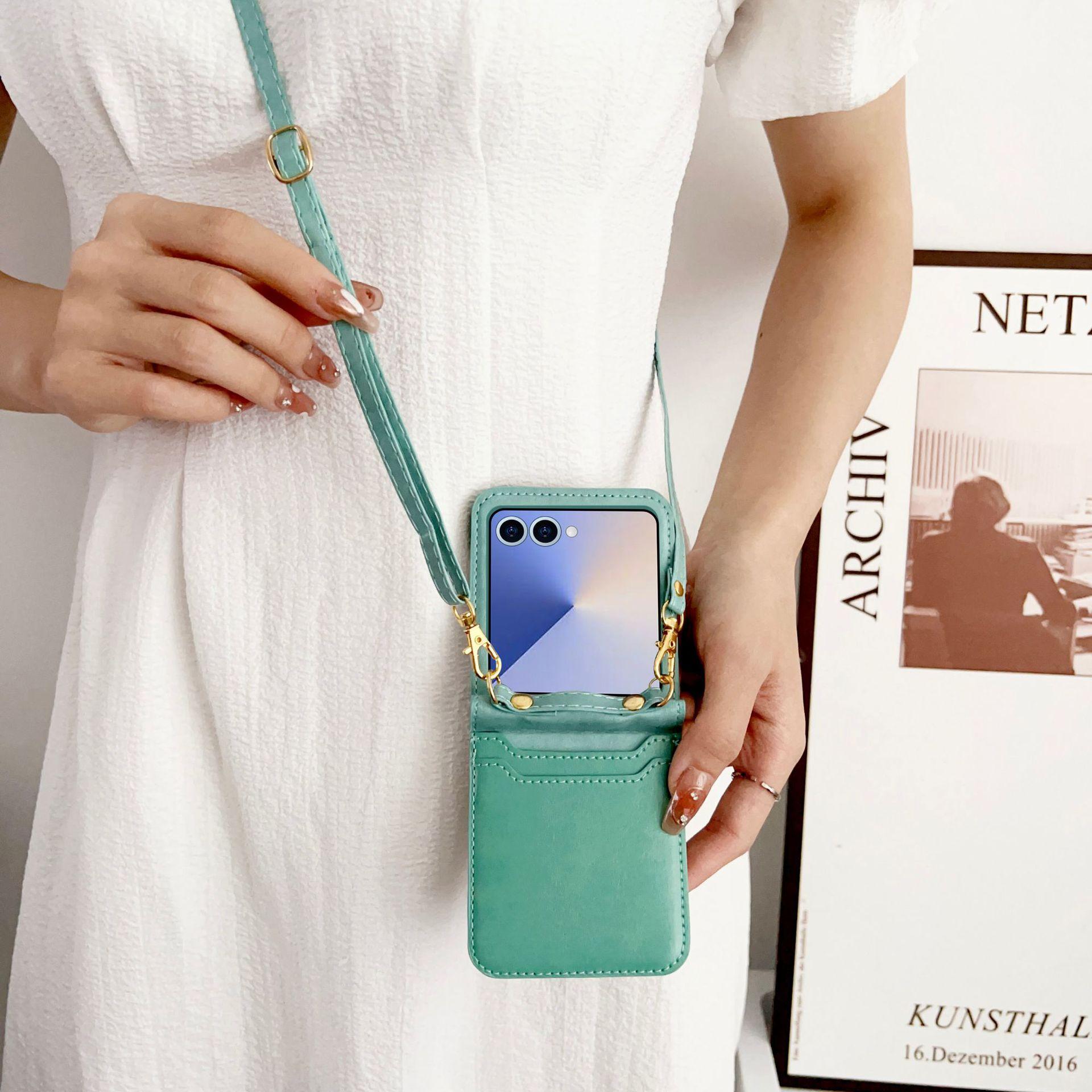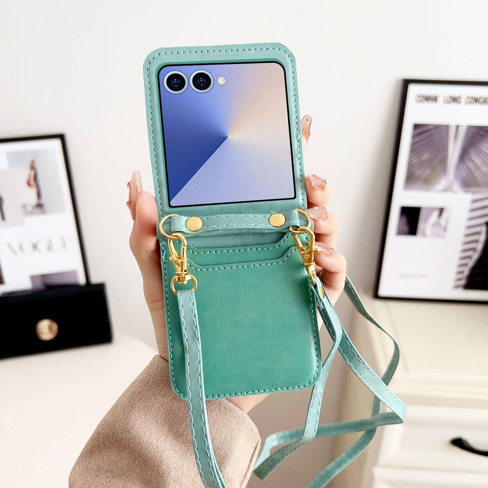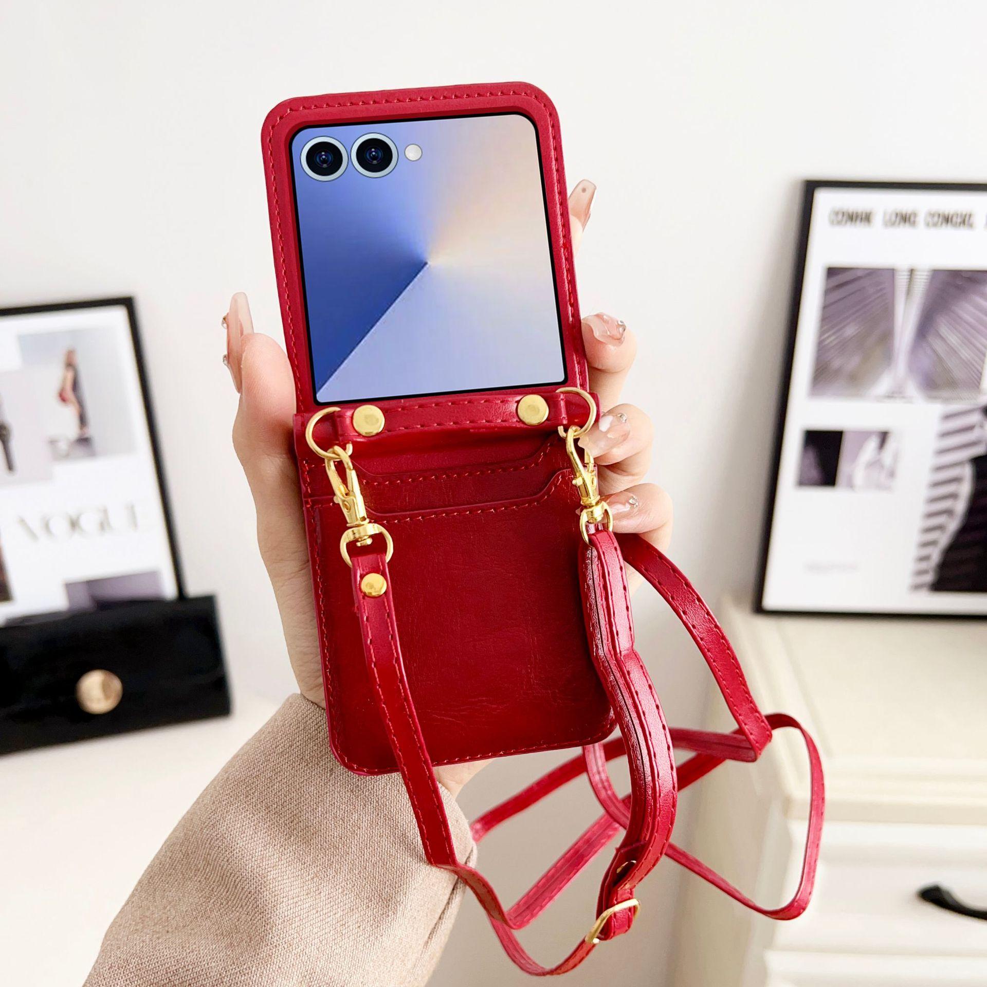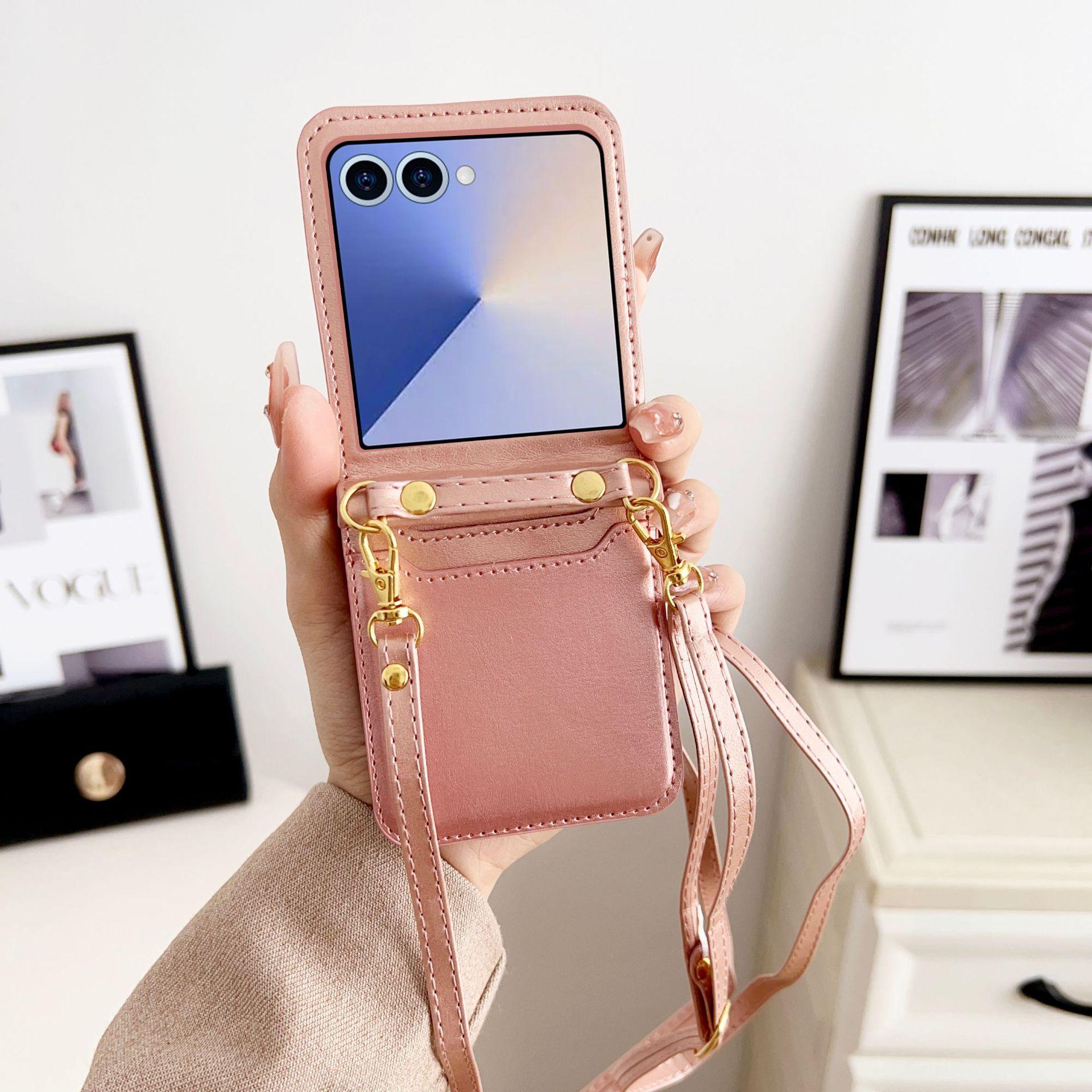 Adecuado para Funda de Teléfono Móvil Samsung Z Flip7 Z Flip 50% de Descuento Apilado Teléfono Móvil Color Puro Tarjeta Cuero Funda Correa Cuerda Cruzada Diagonal