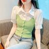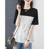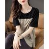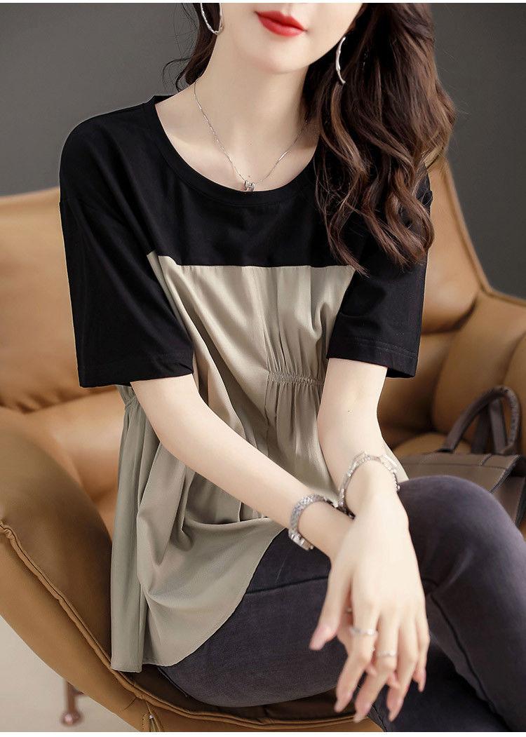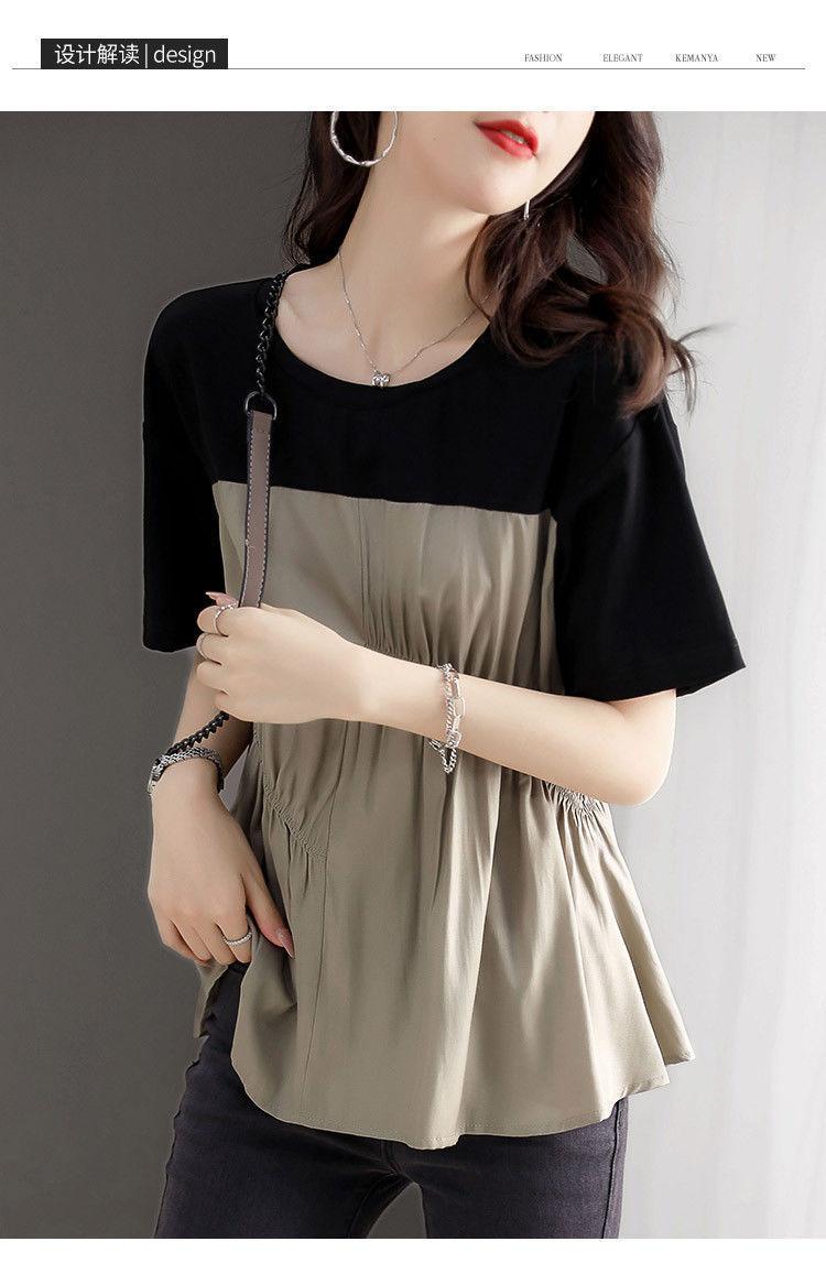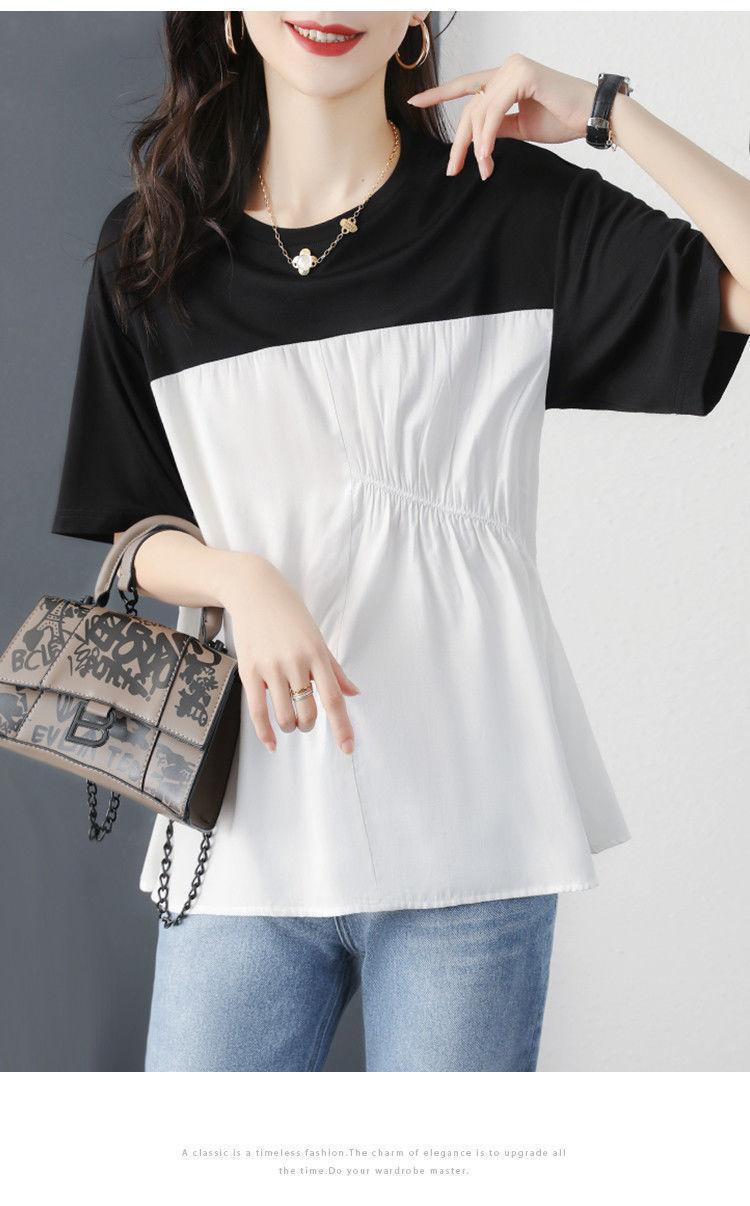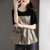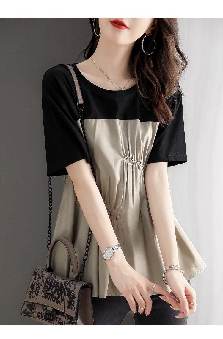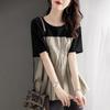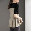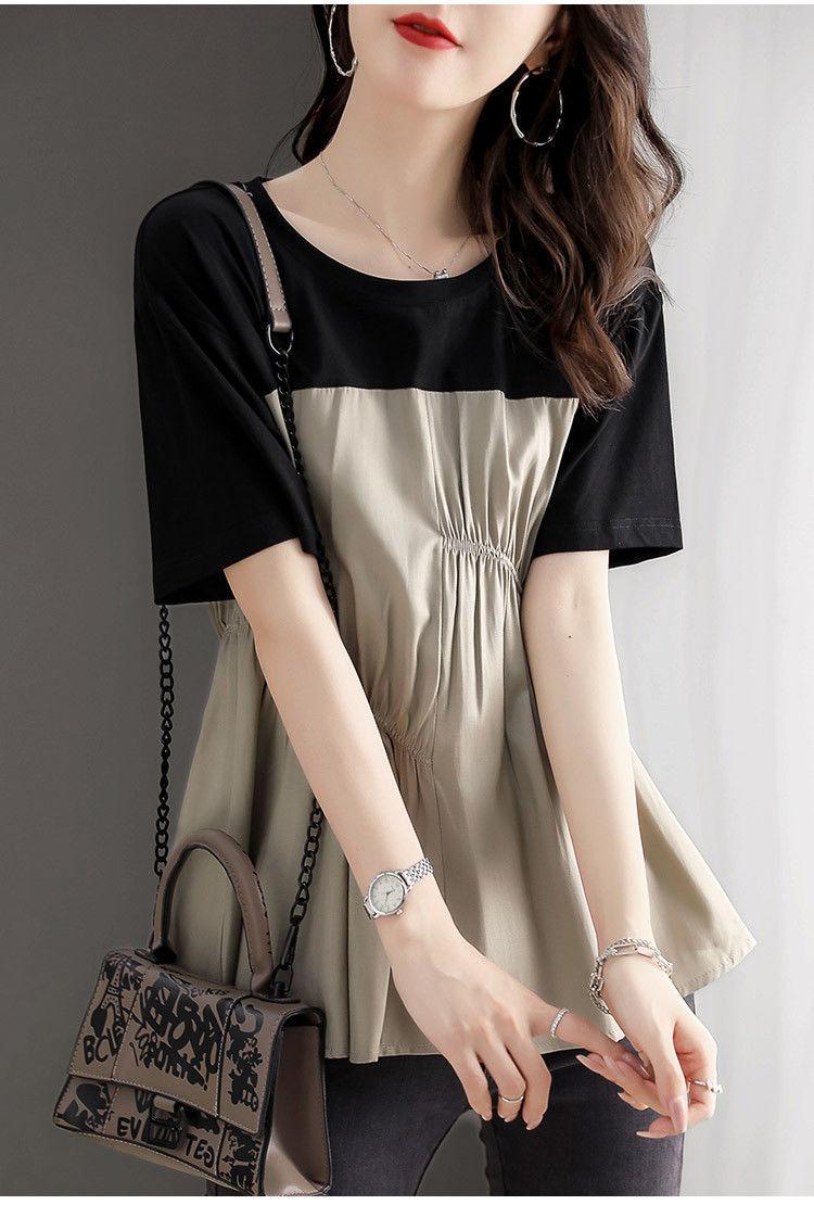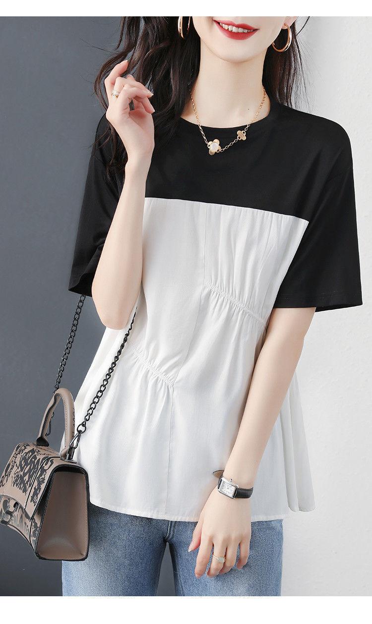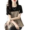 2024 Verano Nueva Moda Falso Dos Piezas Costura Camiseta de Manga Corta para Mujer Casual Holgada Plisada Estilo Occidental Top Combinable