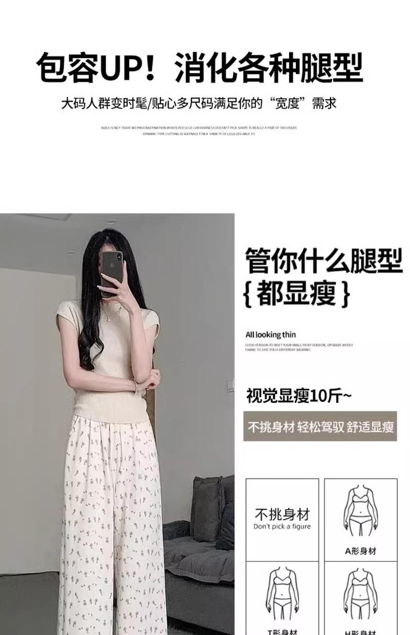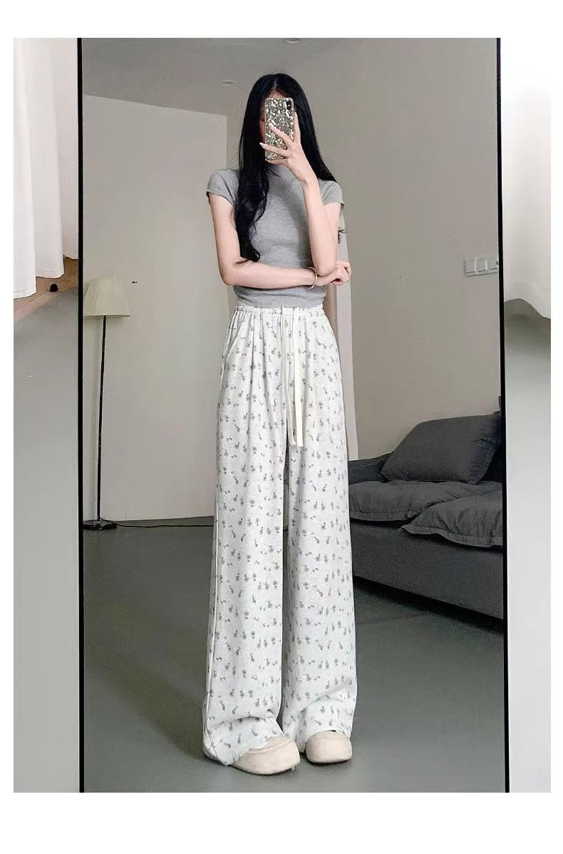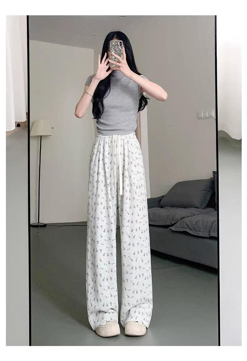 150 Pantalones de Pierna Ancha Florales de Estilo Fresco para Mujer Nuevo Cintura Alta Combinable Casual Ajustado 145 Pantalones Casuales