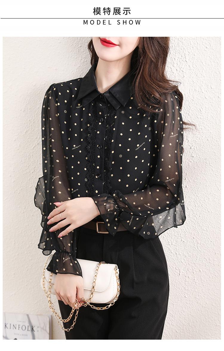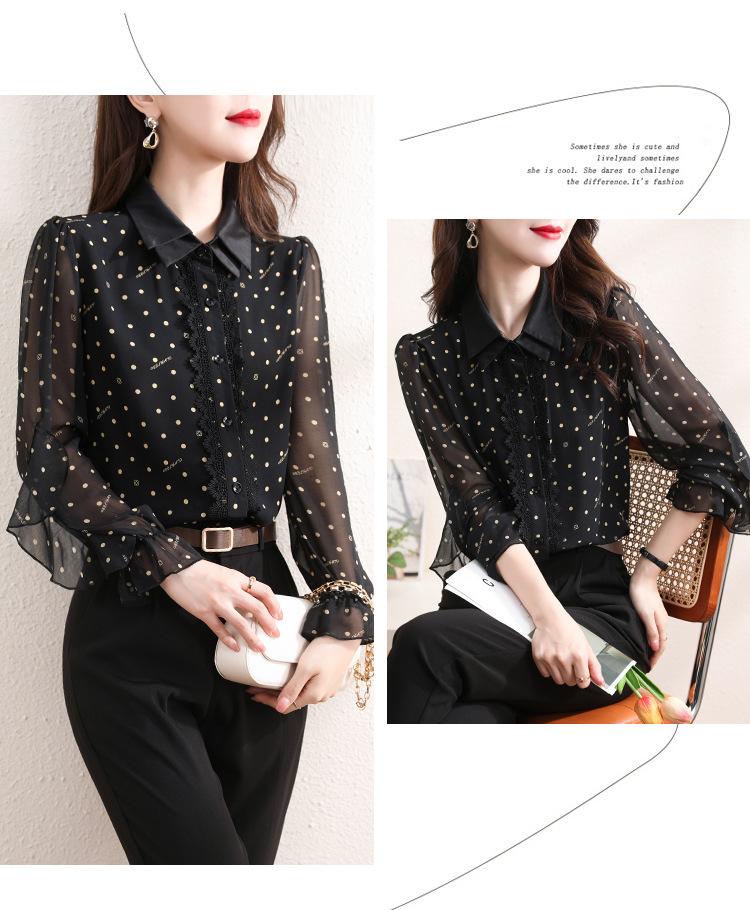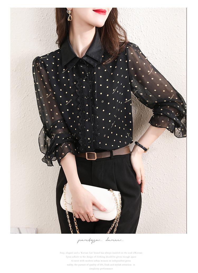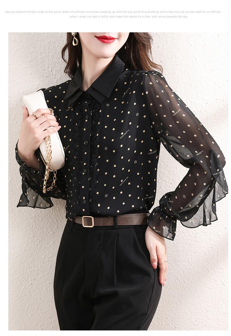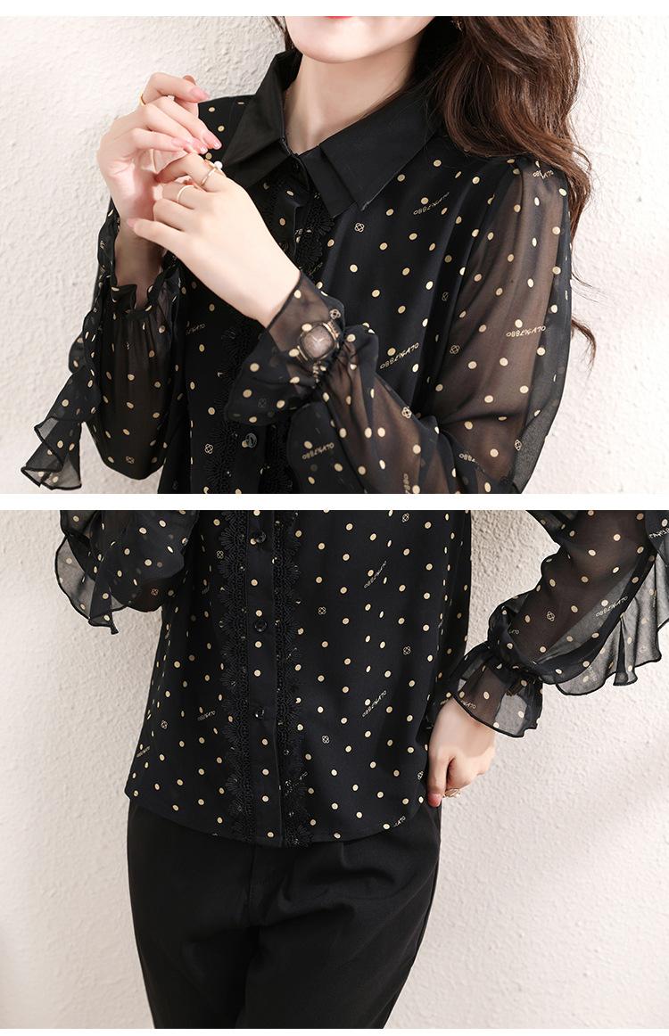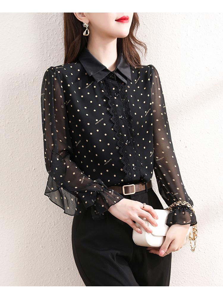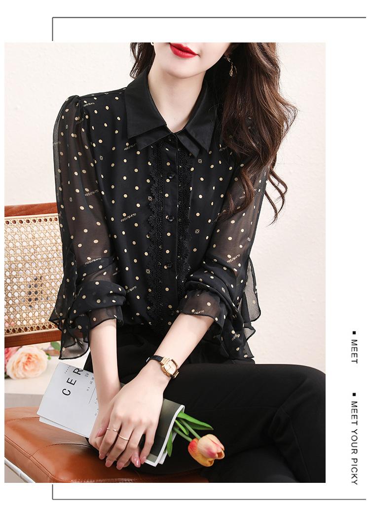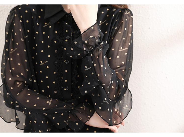 Camisa elegante y moderna con lunares y costuras de malla y mangas voladoras para mujer, otoño 2023, holgada, adelgazante, estilo occidental, antiedad.
