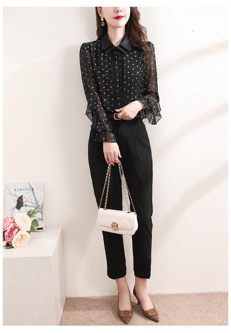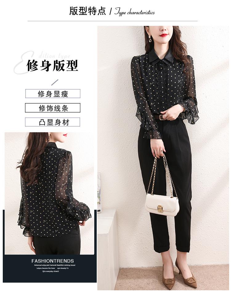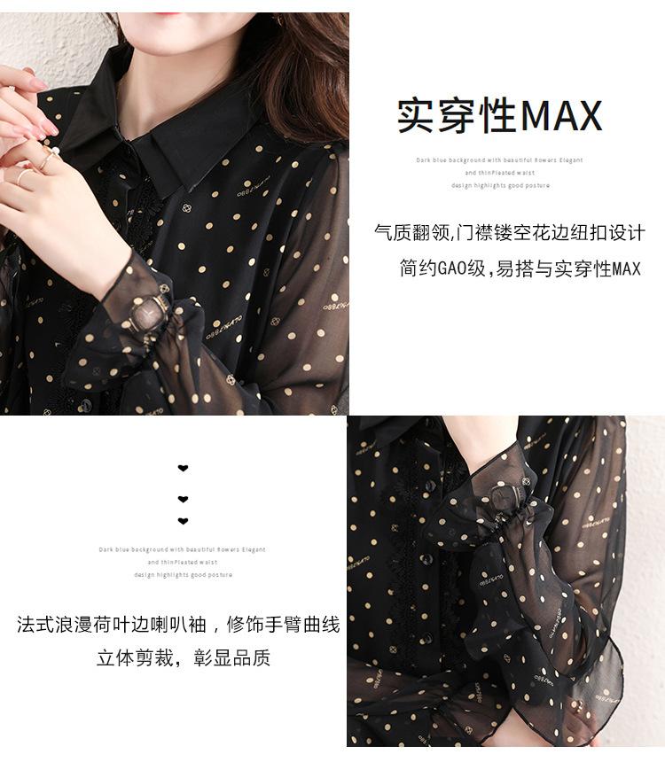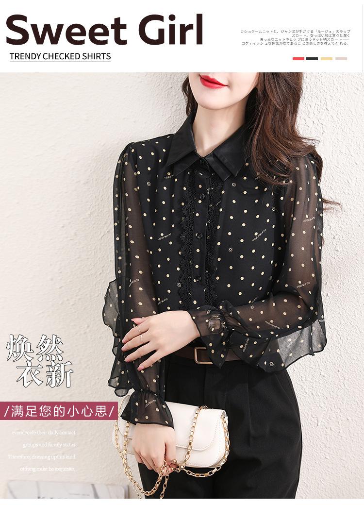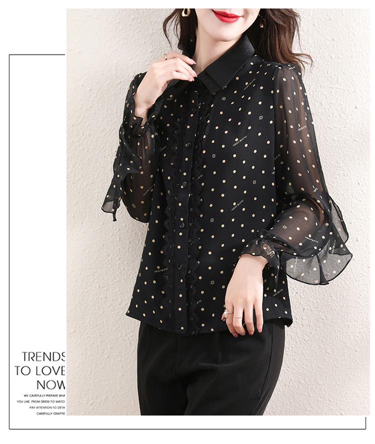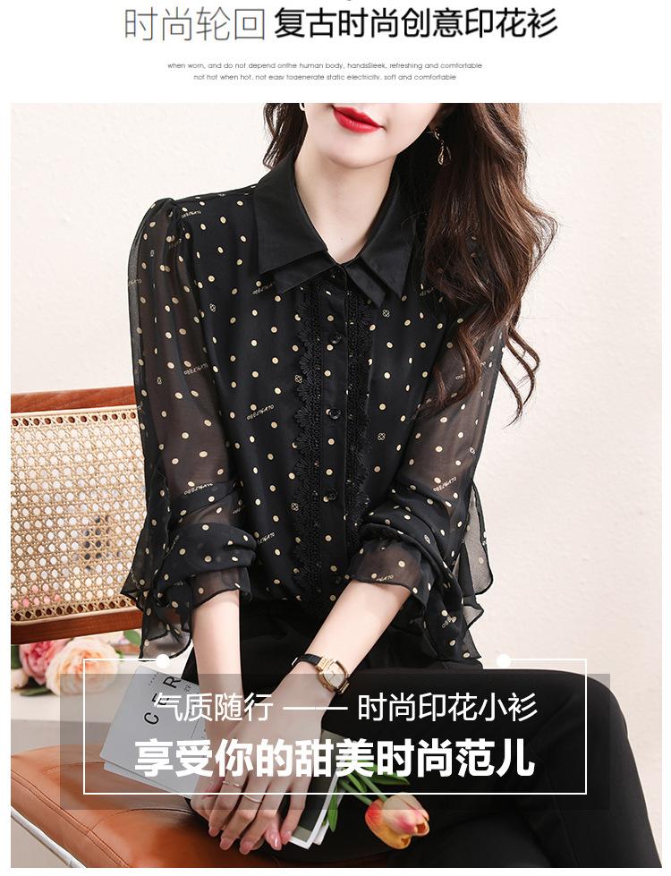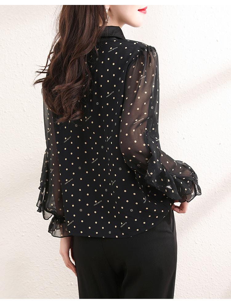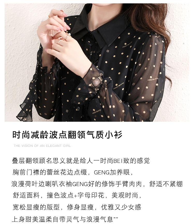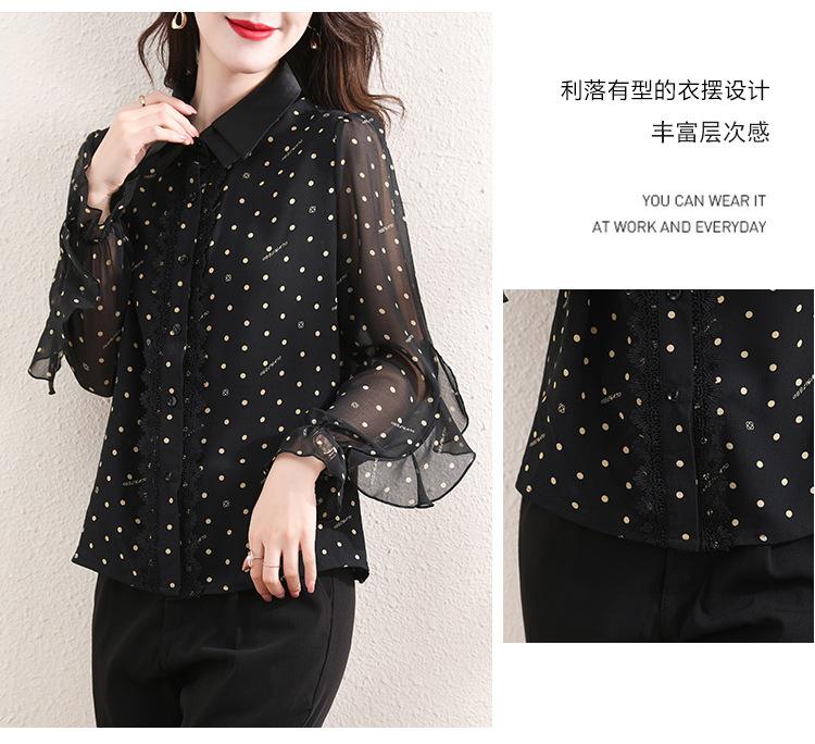 Camisa elegante y moderna con lunares y costuras de malla y mangas voladoras para mujer, otoño 2023, holgada, adelgazante, estilo occidental, antiedad.