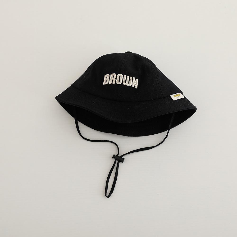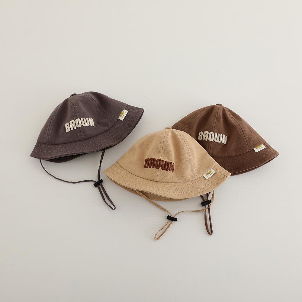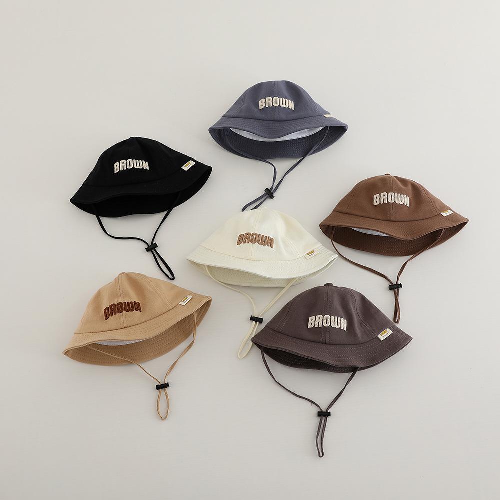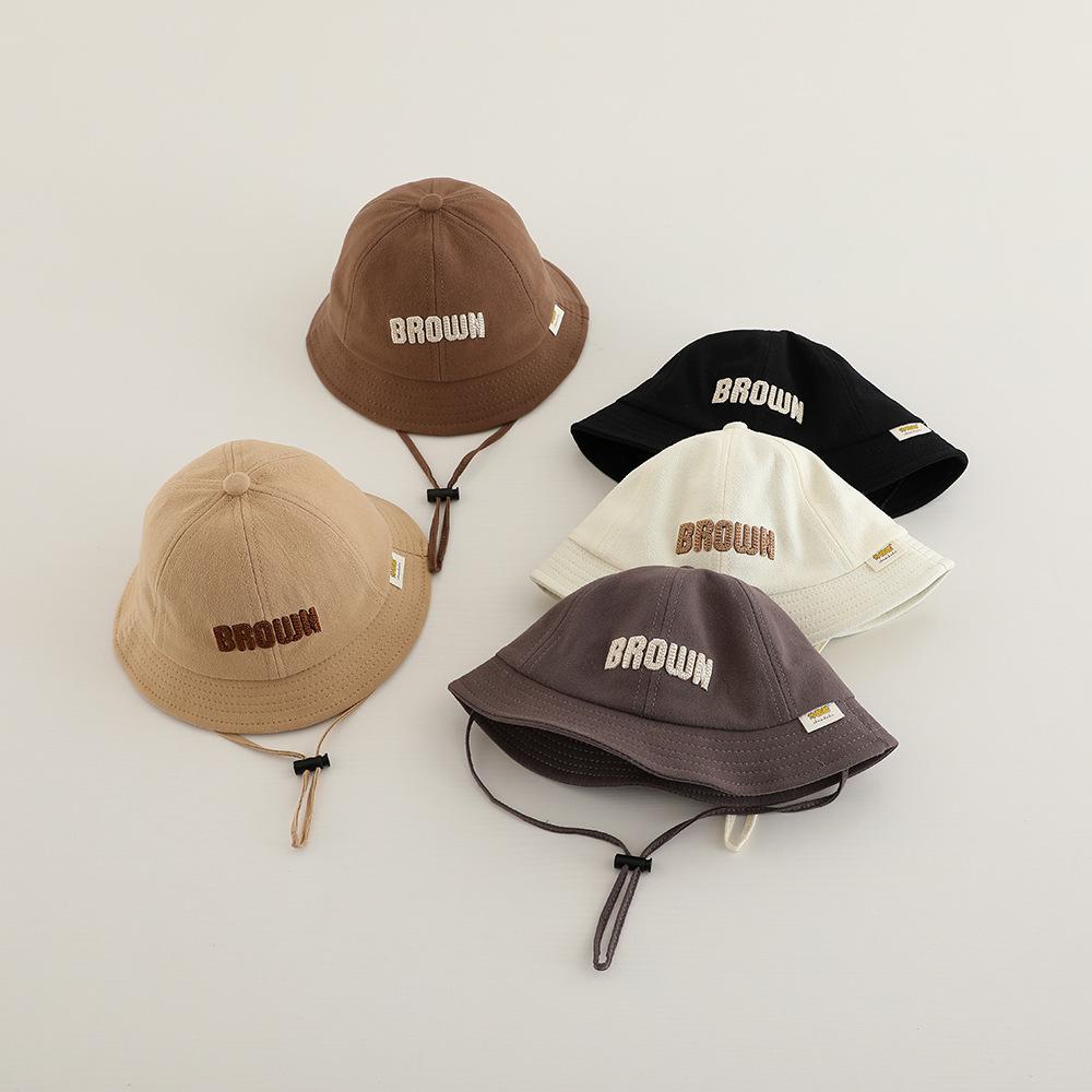 Sombrero de pescador para niños, primavera y otoño, nuevo, con letras bordadas, estilo coreano, para exteriores, de ala ancha, resistente al viento, con cuerda, venta al por mayor